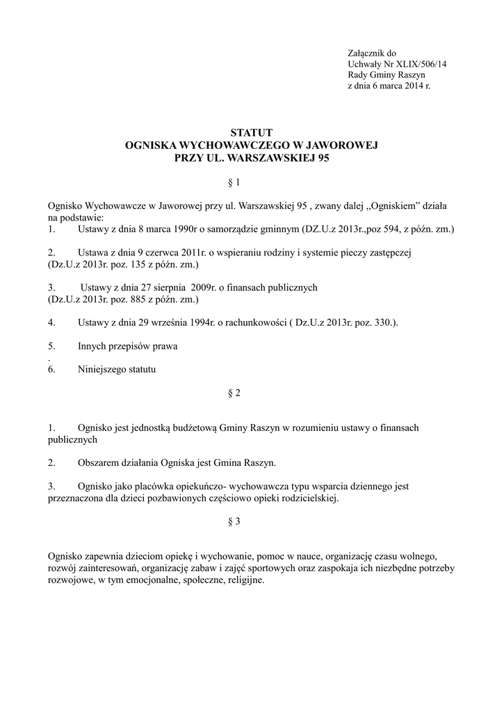 Załącznik do Uchwały Nr XLIX/506/14 Rady Gminy Raszyn z dnia 6 marca 2014 r. STATUT OGNISKA WYCHOWAWCZEGO W JAWOROWEJ PRZY UL. WARSZAWSKIEJ 95 §1 Ognisko Wychowawcze w Jaworowej przy ul. Warszawskiej 95 , zwany dalej ,,Ogniskiem” działa na podstawie: 1. Ustawy z dnia 8 marca 1990r o samorządzie gminnym (DZ.U.z 2013r.,poz 594, z późn. zm.) 2. Ustawa z dnia 9 czerwca 2011r. o wspieraniu rodziny i systemie pieczy zastępczej (Dz.U.z 2013r. poz. 135 z późn. zm.) 3. Ustawy z dnia 27 sierpnia 2009r. o finansach publicznych (Dz.U.z 2013r. poz. 885 z późn. zm.) 4. Ustawy z dnia 29 września 1994r. o rachunkowości ( Dz.U.z 2013r. poz. 330.). 5. . 6. Innych przepisów prawa Niniejszego statutu §2 1. Ognisko jest jednostką budżetową Gminy Raszyn w rozumieniu ustawy o finansach publicznych 2. Obszarem działania Ogniska jest Gmina Raszyn. 3. Ognisko jako placówka opiekuńczo- wychowawcza typu wsparcia dziennego jest przeznaczona dla dzieci pozbawionych częściowo opieki rodzicielskiej. §3 Ognisko zapewnia dzieciom opiekę i wychowanie, pomoc w nauce, organizację czasu wolnego, rozwój zainteresowań, organizację zabaw i zajęć sportowych oraz zaspokaja ich niezbędne potrzeby rozwojowe, w tym emocjonalne, społeczne, religijne. §4 W realizacji zadań Ogniska współdziała z organami administracji samorządowej oraz organizacjami pozarządowymi. §5 1. Ogniskiem kieruje Kierownik. 2. Kierownika Ogniska zatrudnia i zwalnia Wójt Gminy Raszyn 3. Ognisko jest pracodawcą samorządowym w rozumieniu przepisów ustawy z dnia 21 listopada 2008r. o pracownikach samorządowych. ( Dz.U. z 2008r. Nr 223 poz.1458 z późn. zm.) i przepisów Kodeksu pracy. §6 Do zakresu działań Kierownika Ogniska należy w szczególności: 1. zapewnianie prawidłowego funkcjonowania Ogniska oraz kierowanie jego działalnością, 2. wykonywanie czynności pracodawcy w rozumieniu Kodeksu pracy w stosunku do zatrudnionych w Ognisku pracowników, 3. składanie oświadczeń woli w zakresie praw i zobowiązań majątkowych do wysokości kwot określonych corocznie w planie finansowym Ogniska, 4. reprezentowanie Ogniska na zewnątrz. §7 Gmina Raszyn zapewnia środki finansowe na realizację zadań własnych, zabezpiecza warunki ich realizacji, niezbędną infrastrukturę oraz środki na jej utrzymanie i wynagrodzenia do wysokości kwot ujętych w planie finansowym Ogniska. §8 1. Ognisko prowadzi gospodarkę finansową według zasad określonych dla jednostek budżetowych. 2. Podstawą gospodarki finansowej Ogniska jest roczny plan finansowy obejmujący dochody i wydatki. 3. Ognisko prowadzi rachunkowość oraz sprawozdawczość zgodnie z obowiązującymi przepisani dotyczącymi jednostek budżetowych. §9 Szczegółowe zadania oraz organizację działania placówki wsparcia dziennego, w tym rodzaj dokumentacji dotyczącej dziecka oraz sposobów jej prowadzenia, określa regulamin organizacyjny placówki wsparcia dziennego opracowany przez kierownika tej placówki. § 10 Nadzór nad działalnością Ogniska sprawuje Wójt Gminy Raszyn. § 11 Zmiany statutu dokonywane są w trybie właściwym dla jego uchwalenia.
