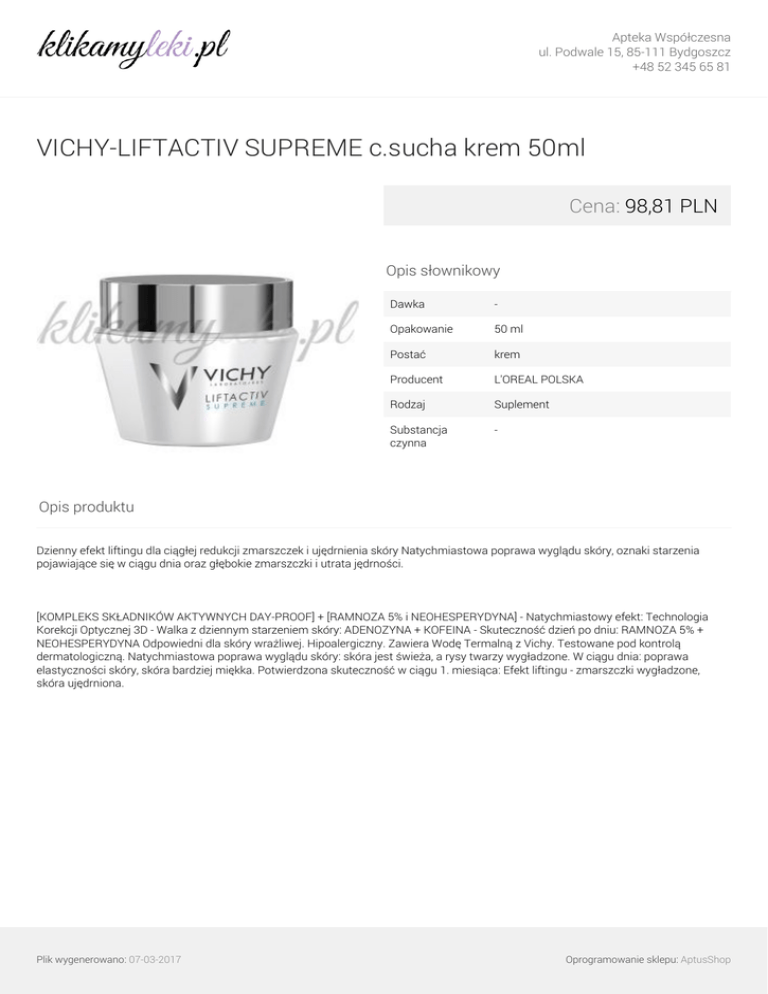 Apteka Współczesna ul. Podwale 15, 85-111 Bydgoszcz +48 52 345 65 81 VICHY-LIFTACTIV SUPREME c.sucha krem 50ml Cena: 98,81 PLN Opis słownikowy Dawka - Opakowanie 50 ml Postać krem Producent L'OREAL POLSKA Rodzaj Suplement Substancja czynna - Opis produktu Dzienny efekt liftingu dla ciągłej redukcji zmarszczek i ujędrnienia skóry Natychmiastowa poprawa wyglądu skóry, oznaki starzenia pojawiające się w ciągu dnia oraz głębokie zmarszczki i utrata jędrności. [KOMPLEKS SKŁADNIKÓW AKTYWNYCH DAY-PROOF] + [RAMNOZA 5% i NEOHESPERYDYNA] - Natychmiastowy efekt: Technologia Korekcji Optycznej 3D - Walka z dziennym starzeniem skóry: ADENOZYNA + KOFEINA - Skuteczność dzień po dniu: RAMNOZA 5% + NEOHESPERYDYNA Odpowiedni dla skóry wrażliwej. Hipoalergiczny. Zawiera Wodę Termalną z Vichy. Testowane pod kontrolą dermatologiczną. Natychmiastowa poprawa wyglądu skóry: skóra jest świeża, a rysy twarzy wygładzone. W ciągu dnia: poprawa elastyczności skóry, skóra bardziej miękka. Potwierdzona skuteczność w ciągu 1. miesiąca: Efekt liftingu - zmarszczki wygładzone, skóra ujędrniona. Plik wygenerowano: 07-03-2017 Powered by TCPDF (www.tcpdf.org) Oprogramowanie sklepu: AptusShop