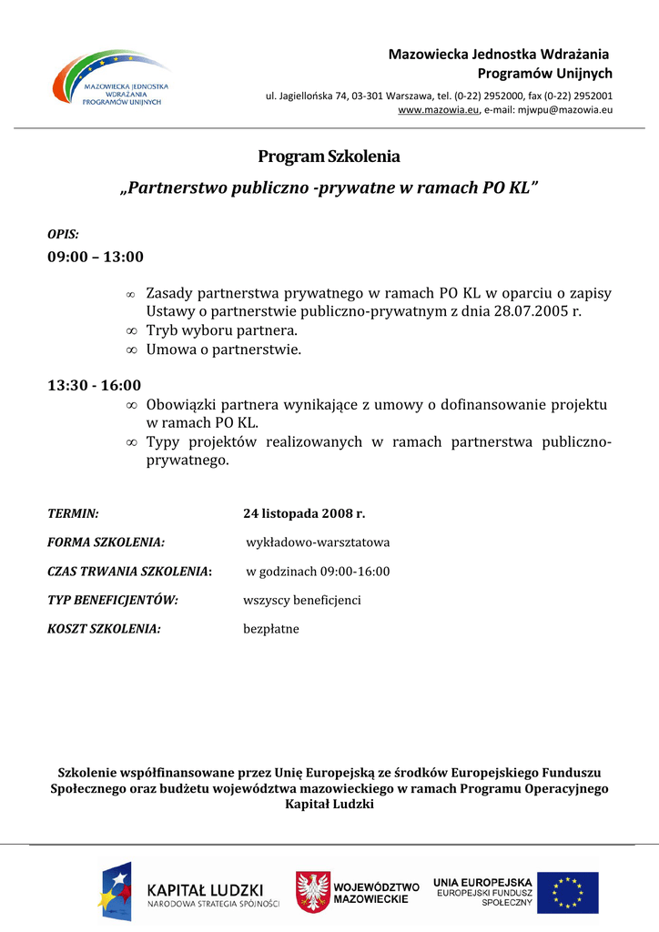 Mazowiecka Jednostka Wdrażania Programów Unijnych ul. Jagiellońska 74, 03-301 Warszawa, tel. (0-22) 2952000, fax (0-22) 2952001 www.mazowia.eu, e-mail: [email protected] Program Szkolenia „Partnerstwo publiczno -prywatne w ramach PO KL” OPIS: 09:00 – 13:00 Zasady partnerstwa prywatnego w ramach PO KL w oparciu o zapisy Ustawy o partnerstwie publiczno-prywatnym z dnia 28.07.2005 r. • Tryb wyboru partnera. • Umowa o partnerstwie. • 13:30 - 16:00 • Obowiązki partnera wynikające z umowy o dofinansowanie projektu w ramach PO KL. • Typy projektów realizowanych w ramach partnerstwa publicznoprywatnego. TERMIN: 24 listopada 2008 r. FORMA SZKOLENIA: wykładowo-warsztatowa CZAS TRWANIA SZKOLENIA: w godzinach 09:00-16:00 TYP BENEFICJENTÓW: wszyscy beneficjenci KOSZT SZKOLENIA: bezpłatne Szkolenie współfinansowane przez Unię Europejską ze środków Europejskiego Funduszu Społecznego oraz budżetu województwa mazowieckiego w ramach Programu Operacyjnego Kapitał Ludzki