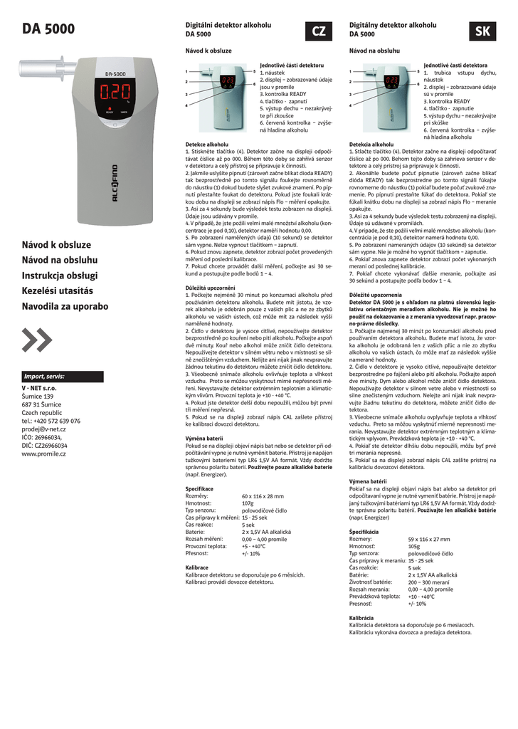 DA 5000 Digitální detektor alkoholu DA 5000 CZ Návod k obsluze Návod k obsluze Návod na obsluhu Instrukcja obsługi Kezelési utasítás Navodila za uporabo Import, servis: V - NET s.r.o. Šumice 139 687 31 Šumice Czech republic tel.: +420 572 639 076 [email protected] IČO: 26966034, DIČ: CZ26966034 www.promile.cz Digitálny detektor alkoholu DA 5000 SK Návod na obsluhu Jednotlivé části detektoru 1. náustek 2. displej – zobrazované údaje jsou v promile 3. kontrolka READY 4. tlačítko - zapnutí 5. výstup dechu – nezakrývejte při zkoušce 6. červená kontrolka – zvýšená hladina alkoholu Jednotlivé časti detektora 1. trubica vstupu dychu, náustok 2. displej – zobrazované údaje sú v promile 3. kontrolka READY 4. tlačítko - zapnutie 5. výstup dychu – nezakrývajte pri skúške 6. červená kontrolka – zvýšená hladina alkoholu Detekce alkoholu 1. Stiskněte tlačítko (4). Detektor začne na displeji odpočítávat číslice až po 000. Během této doby se zahřívá senzor v detektoru a celý přístroj se připravuje k činnosti. 2. Jakmile uslyšíte pípnutí (zároveň začne blikat dioda READY) tak bezprostředně po tomto signálu foukejte rovnoměrně do náustku (1) dokud budete slyšet zvukové znamení. Po pípnutí přestaňte foukat do detektoru. Pokud jste foukali krátkou dobu na displeji se zobrazí nápis Flo – měření opakujte. 3. Asi za 4 sekundy bude výsledek testu zobrazen na displeji. Údaje jsou udávány v promile. 4. V případě, že jste požili velmi malé množství alkoholu (koncentrace je pod 0,10), detektor naměří hodnotu 0,00. 5. Po zobrazení naměřených údajů (10 sekund) se detektor sám vypne. Nelze vypnout tlačítkem – zapnutí. 6. Pokud znovu zapnete, detektor zobrazí počet provedených měření od poslední kalibrace. 7. Pokud chcete provádět další měření, počkejte asi 30 sekund a postupujte podle bodů 1 – 4. Detekcia alkoholu 1. Stlačte tlačítko (4). Detektor začne na displeji odpočítavať číslice až po 000. Behom tejto doby sa zahrieva senzor v detektore a celý prístroj sa pripravuje k činnosti. 2. Akonáhle budete počuť pípnutie (zároveň začne blikať dióda READY) tak bezprostredne po tomto signáli fúkajte rovnomerne do náustku (1) pokiaľ budete počuť zvukové znamenie. Po pípnutí prestaňte fúkať do detektora. Pokiaľ ste fúkali krátku dobu na displeji sa zobrazí nápis Flo – meranie opakujte. 3. Asi za 4 sekundy bude výsledok testu zobrazený na displeji. Údaje sú udávané v promilách. 4. V prípade, že ste požili veľmi malé množstvo alkoholu (koncentrácia je pod 0,10), detektor namerá hodnotu 0,00. 5. Po zobrazení nameraných údajov (10 sekúnd) sa detektor sám vypne. Nie je možné ho vypnúť tlačítkom – zapnutie. 6. Pokiaľ znova zapnete detektor zobrazí počet vykonaných meraní od poslednej kalibrácie. 7. Pokiaľ chcete vykonávať ďalšie meranie, počkajte asi 30 sekúnd a postupujte podľa bodov 1 – 4. Důležitá upozornění 1. Počkejte nejméně 30 minut po konzumaci alkoholu před používáním detektoru alkoholu. Budete mít jistotu, že vzorek alkoholu je odebrán pouze z vašich plic a ne ze zbytků alkoholu ve vašich ústech, což může mít za následek vyšší naměřené hodnoty. 2. Čidlo v detektoru je vysoce citlivé, nepoužívejte detektor bezprostředně po kouření nebo pití alkoholu. Počkejte aspoň dvě minuty. Kouř nebo alkohol může zničit čidlo detektoru. Nepoužívejte detektor v silném větru nebo v místnosti se silně znečištěným vzduchem. Nelijte ani nijak jinak nevpravujte žádnou tekutinu do detektoru můžete zničit čidlo detektoru. 3. Všeobecně snímače alkoholu ovlivňuje teplota a vlhkost vzduchu. Proto se můžou vyskytnout mírné nepřesnosti měření. Nevystavujte detektor extrémním teplotním a klimatickým vlivům. Provozní teplota je +10 - +40 °C. 4. Pokud jste detektor delší dobu nepoužili, můžou být první tři měření nepřesná. 5. Pokud se na displeji zobrazí nápis CAL zašlete přístroj ke kalibraci dovozci detektoru. Výměna baterií Pokud se na displeji objeví nápis bat nebo se detektor při odpočítávání vypne je nutné vyměnit baterie. Přístroj je napájen tužkovými bateriemi typ LR6 1,5V AA formát. Vždy dodržte správnou polaritu baterií. Používejte pouze alkalické baterie (např. Energizer). Specifikace Rozměry: Hmotnost: Typ senzoru: Čas přípravy k měření: Čas reakce: Baterie: Rozsah měření: Provozní teplota: Přesnost: 60 x 116 x 28 mm 107g polovodičové čidlo 15 - 25 sek 5 sek 2 x 1,5V AA alkalická 0,00 – 4,00 promile +5 - +40°C +/- 10% Kalibrace Kalibrace detektoru se doporučuje po 6 měsících. Kalibraci provádí dovozce detektoru. Dôležité upozornenia Detektor DA 5000 je s ohľadom na platnú slovenskú legislatívu orientačným meradlom alkoholu. Nie je možné ho použiť na dokazovanie a z merania vyvodzovať napr. pracovno-právne dôsledky. 1. Počkajte najmenej 30 minút po konzumácií alkoholu pred používaním detektora alkoholu. Budete mať istotu, že vzorka alkoholu je odobraná len z vašich pľúc a nie zo zbytku alkoholu vo vašich ústach, čo môže mať za následok vyššie namerané hodnoty. 2. Čidlo v detektore je vysoko citlivé, nepoužívajte detektor bezprostredne po fajčení alebo pití alkoholu. Počkajte aspoň dve minúty. Dym alebo alkohol môže zničiť čidlo detektora. Nepoužívajte detektor v silnom vetre alebo v miestnosti so silne znečisteným vzduchom. Nelejte ani nijak inak nevpravujte žiadnu tekutinu do detektora, môžete zničiť čidlo detektora. 3. Všeobecne snímače alkoholu ovplyvňuje teplota a vlhkosť vzduchu. Preto sa môžou vyskytnúť mierné nepresnosti merania. Nevystavujte detektor extrémným teplotným a klimatickým vplyvom. Prevádzková teplota je +10 - +40 °C. 4. Pokiaľ ste detektor dlhšiu dobu n