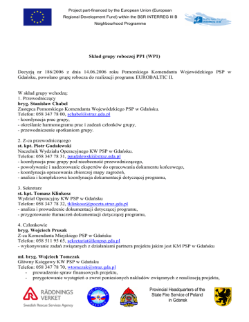 Project part-financed by the European Union (European Regional Development Fund) within the BSR INTERREG III B Neighbourhood Programme Skład grupy roboczej PP1 (WP1) Decyzją nr 186/2006 z dnia 14.06.2006 roku Pomorskiego Komendanta Wojewódzkiego PSP w Gdańsku, powołano grupę robocza do realizacji programu EUROBALTIC II. W skład grupy wchodzą: 1. Przewodniczący bryg. Stanisław Chabel Zastępca Pomorskiego Komendanta Wojewódzkiego PSP w Gdańsku. Telefon: 058 347 78 00, [email protected] - koordynacja prac grupy, - określanie harmonogramu prac i zadeań członków grupy, - przewodniczenie spotkaniom grupy. 2. Z-ca przewodniczącego st. kpt. Piotr Gudalewski Naczelnik Wydziału Operacyjnego KW PSP w Gdańsku. Telefon: 058 347 78 31, [email protected] - koordynacja prac grupy pod nieobecność przewodniczącego, - powoływanie i nadzorowanie ekspertów do opracowania dokumentu końcowego, - koordynacja opracowania zbiorczej mapy zagroŜeń, - analiza i kompleksowa koordynacja dokumentacji dotyczącej programu, 3. Sekretarz st. kpt. Tomasz Klinkosz Wydział Operacyjny KW PSP w Gdańsku Telefon: 058 347 78 32, [email protected] - analiza i prowadzenie dokumentacji dotyczącej programu, - przygotowanie tłumaczeń dokumentacji dotyczącej programu, 4. Członkowie bryg. Wojciech Prusak Z-ca Komendanta Miejskiego PSP w Gdańsku Telefon: 058 511 95 65, [email protected] - wykonywanie zadań związanych z działaniami partnera projektu jakim jest KM PSP w Gdańsku mł. bryg. Wojciech Tomczak Główny Księgowy KW PSP w Gdańsku Telefon: 058 347 78 70, [email protected] - prowadzenie spraw finansowych projektu, - przygotowanie wystąpień o zwrot poniesionych nakładów związanych z reaslizacją projektu, Provincial Headquarters of the State Fire Service of Poland in Gdansk Project part-financed by the European Union (European Regional Development Fund) within the BSR INTERREG III B Neighbourhood Programme st. kpt. Mirosław Mendyka Z-ca Komendanta Miejskiego PSP w Gdyni Telefon: 058 660 23 00, [email protected] - wykonywanie zadań związanych z działaniami partnera projektu jakim jest KM PSP w Gdyni st. kpt. Marek Zabrocki Wydział Kontrolno-Rozpoznawczy KW PSP w Gdańsku Telefon: 058 347 78 21, [email protected] - dostarczenie danych dotyczących: - analizy zagroŜeń, - wykazu substancji niebezpiecznych znajdujących się w zakładach, - wykazu substancji niebezpiecznych poddawanych transportowi drogowemu, kolejowemu, morskiemu i lotniczemu, - analizy nieprawidłowości stwierdzonych podczas kontroli obiektów w zakresie przechowywania i transportu materiałów niebezpiecznych, kpt. Piotr Pączkowski Wydział Operacyjny KW PSP w Gdańsku Telefon: 058 347 78 66, [email protected] - analiza zdarzeń z udziałem materiałów niebezpiecznych, - analiza opracowanych ZPOR, - opracowanie zbiorczej mapy zagroŜeń dla aglomeracji trójmiejskiej, sekc. Jarosław Jałoza Wydział Kwatermistrzowski PSP w Gdańsku Telefon: 058 347 78 67, [email protected] - zabezpieczenie kwatermistrzowskie projektu, w tym sporządzanie planu zamierzeń i przewidywanych kosztów, - pomoc w prowadzeniu dokumentacji projektu. Provincial Headquarters of the State Fire Service of Poland in Gdansk