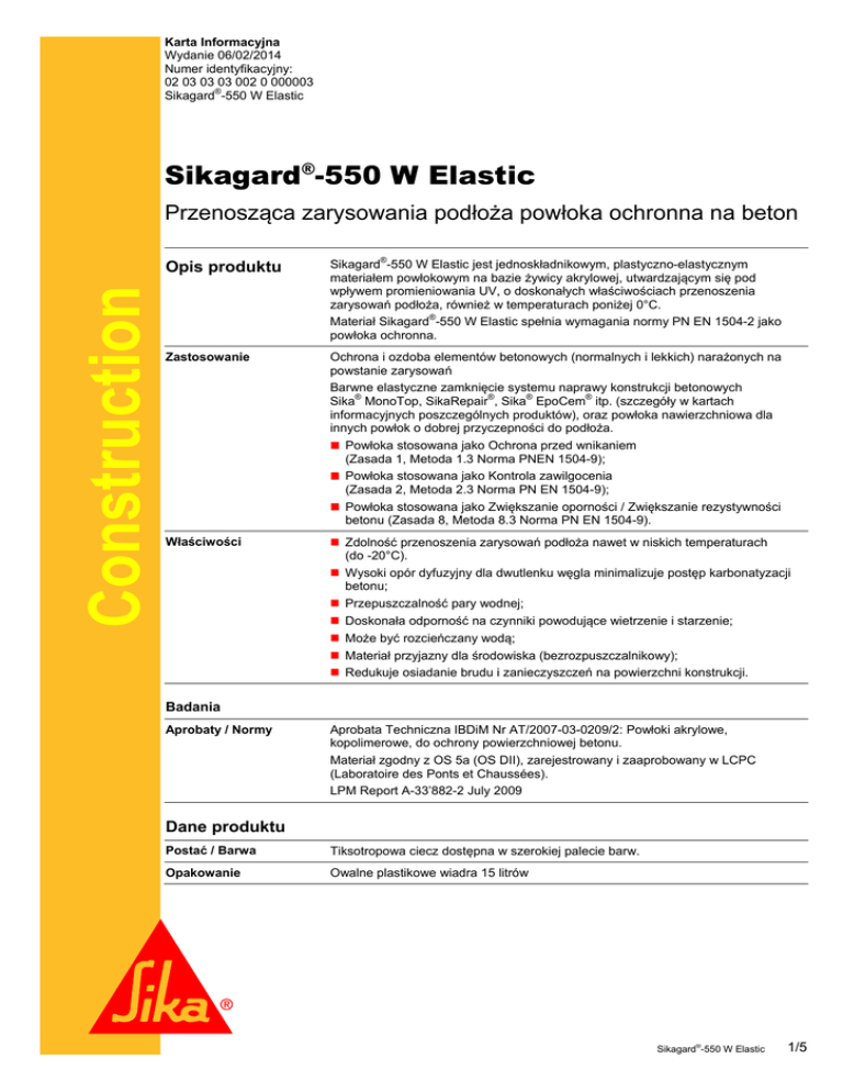 Karta Informacyjna Wydanie 06/02/2014 Numer identyfikacyjny: 02 03 03 03 002 0 000003 Sikagard®-550 W Elastic Sikagard®-550 W Elastic Construction Przenosząca zarysowania podłoża powłoka ochronna na beton Opis produktu Sikagard®-550 W Elastic jest jednoskładnikowym, plastyczno-elastycznym materiałem powłokowym na bazie żywicy akrylowej, utwardzającym się pod wpływem promieniowania UV, o doskonałych właściwościach przenoszenia zarysowań podłoża, również w temperaturach poniżej 0°C. Materiał Sikagard®-550 W Elastic spełnia wymagania normy PN EN 1504-2 jako powłoka ochronna. Zastosowanie Ochrona i ozdoba elementów betonowych (normalnych i lekkich) narażonych na powstanie zarysowań Barwne elastyczne zamknięcie systemu naprawy konstrukcji betonowych Sika® MonoTop, SikaRepair®, Sika® EpoCem® itp. (szczegóły w kartach informacyjnych poszczególnych produktów), oraz powłoka nawierzchniowa dla innych powłok o dobrej przyczepności do podłoża. Powłoka stosowana jako Ochrona przed wnikaniem (Zasada 1, Metoda 1.3 Norma PNEN 1504-9); Powłoka stosowana jako Kontrola zawilgocenia (Zasada 2, Metoda 2.3 Norma PN EN 1504-9); Powłoka stosowana jako Zwiększanie oporności / Zwiększanie rezystywności betonu (Zasada 8, Metoda 8.3 Norma PN EN 1504-9). Właściwości Zdolność przenoszenia zarysowań podłoża nawet w niskich temperaturach (do -20°C). Wysoki opór dyfuzyjny dla dwutlenku węgla minimalizuje postęp karbonatyzacji betonu; Przepuszczalność pary wodnej; Doskonała odporność na czynniki powodujące wietrzenie i starzenie; Może być rozcieńczany wodą; Materiał przyjazny dla środowiska (bezrozpuszczalnikowy); Redukuje osiadanie brudu i zanieczyszczeń na powierzchni konstrukcji. Badania Aprobaty / Normy Aprobata Techniczna IBDiM Nr AT/2007-03-0209/2: Powłoki akrylowe, kopolimerowe, do ochrony powierzchniowej betonu. Materiał zgodny z OS 5a (OS DII), zarejestrowany i zaaprobowany w LCPC (Laboratoire des Ponts et Chaussées). LPM Report A-33’882-2 July 2009 Dane produktu Postać / Barwa Tiksotropowa ciecz dostępna w szerokiej palecie barw. Opakowanie Owalne plastikowe wiadra 15 litrów Sikagard®-550 W Elastic 1/5 Składowanie Warunki składowania / Czas przydatności do użycia Produkt przechowywany w zamkniętych, oryginalnych i nieuszkodzonych opakowaniach w suchym i chłodnym pomieszczeniu najlepiej użyć w ciągu 24 miesięcy od daty produkcji. Chronić przed promieniowaniem słonecznym i mrozem. Dane techniczne Baza chemiczna Dyspersja akrylowa Gęstość 3 ~ 1,39 kg/dm (w temperaturze +20°C) Zawartość ciała stałego ~ 53,4% objętościowo / ~ 66,1% wagowo Grubość warstwy Dmin~160 µm Minimalna wymagana grubość suchej warstwy do uzyskania wymaganego oporu dyfuzyjnego na CO2 (równoważna grubość warstwy powietrza ≥ 50 m). Minimalna wymagana grubość suchej warstwy do uzyskania wymaganej trwałości (opór dyfuzyjny CO2, przyczepność do podłoża po cyklach termicznych, oraz zdolność przenoszenia zarysowań) ~340μm. Opór dyfuzyjny dla dwutlenku węgla, µCO2 Grubość suchej warstwy d = 160 µm Równoważna grubość warstwy powietrza 5 Współczynnik dyfuzji CO2 µ CO2 = 3,1 x 10 Wymagania Opór dyfuzyjny dla pary wodnej, µH20 SD, CO2 = 51 m ≥ 50 m Grubość suchej warstwy d = 230 µm Równoważna grubość warstwy powietrza SD, H20 = 0,35 m Współczynnik dyfuzji H20 µH20 = 1,5 x 10 Wymagania 3 ≤5m Właściwości mechaniczne / fizyczne Wydłużenie przy rozdarciu W temperaturze pokojowej, bez narażenia na warunki atmosferyczne W temperaturze -20°C Zdolność przenoszenia zarysowań Klasa A1 (-20°C) Badanie metodą siatki nacięć GT 0 Absorpcja kapilarna 0.5 w = 0,02 kg/(m²h ) Przyczepność/Pull-Off 2,9 (2,8) N/mm² Przyczepność po kompatybilności cieplnej Dla zastosowań zewnętrznych z dodatkowym działaniem soli odladzających: 2,9 (2,1) N/mm² PN EN 13687- cz 1 i 2 Sztuczne starzenie Wynik pozytywny po 2000 godzin 120% 70% PN EN 1062-7 PN EN ISO 2409 PN EN 1062-3 PN EN 1542 PN EN 1062-11 Informacje o systemie Struktura systemu System Gruntowanie Produkt (2) Warstwa wierzchnia Gruntowanie ® Sikagard -552 W Aquaprimer (2) Ilość warstw 1 ® 2-3 ® 1 Sikagard -550 W Elastic Warstwa pośrednia (3) (1) Sikagard -552 W Aquaprimer ® Sikagard -545 W Elastofill lub ® Sikagard -526 Porefiller 1÷2 Sikagard®-550 W Elastic 2/5 Warstwa (4) wierzchnia (1) 2 ® Sikagard -550 W Elastic Szczegółowe dane produktów znajdują się w oddzielnych Kartach Informacyjnych. (2) Na trudnych podłożach (bardzo zwięzłych lub porowatych, o wytrzymałości na rozciąganie poniżej 1,0 N/mm2) oraz w niskich temperaturach należy stosować rozpuszczalnikowy Sikagard®-551 S Elastic Primer. (3) Ilość warstw materiału koniecznych do doszczelnienia powierzchni zależy od porowatości podłoża. (4) Dla intensywnych barw (czerwona, żółta) i/lub ciemnego podłoża, konieczne może być naniesienie więcej niż dwóch warstw materiału. Szczegóły aplikacji Zużycie Materiał Zużycie na warstwę ® ~ 0,10 ÷ 0,15 kg/m² ® ~ 0,10 ÷ 0,15 kg/m² ® ~ 0,80 ÷ 1,10 kg/m² ® ~ 0,20 ÷ 0,30 kg/m ® ~ 0,25 ÷ 0,35 kg/m² Sikagard -551S Elastic Primer Sikagard -552 W Aquaprimer Sikagard -545 W Elastofill Sikagard -556 Porefiller Sikagard -550 W Elastic Przygotowanie podłoża 2 Beton w warunkach atmosferycznych bez starych powłok Powierzchnia betonu musi być mocna, sucha, oczyszczona z luźnych, niezwiązanych z podłożem cząstek. Zalecane metody czyszczenia: parą, wodą pod wysokim ciśnieniem lub metodą strumieniowo-ścierną. Minimalny wiek betonu 28 dni. Jeżeli jest to wymagane podłoże należy wyrównać zaprawami na bazie cementu ® ® ® ® ® (np. Sika MonoTop -723 N, Sikagard -720 EpoCem , Sikagard -545 W Elastofill, itp.). Dla podłoży cementowych przed naniesieniem powłoki należy odczekać co najmniej 4 dni. W przypadku stosowania materiałów EpoCem® możliwość nakładania powłoki już po 24 