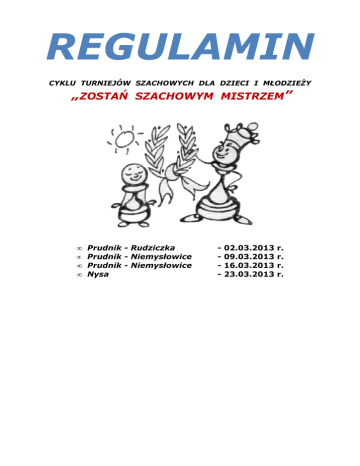 REGULAMIN CYKLU TURNIEJÓW SZACHOWYCH DLA DZIECI I MŁODZIEŻY „ZOSTAŃ • • • • SZACHOWYM MISTRZEM” Prudnik - Rudziczka Prudnik - Niemysłowice Prudnik - Niemysłowice Nysa - 02.03.2013 09.03.2013 16.03.2013 23.03.2013 r. r. r. r. ORGANIZATOR • Ludowy Klub Sportowy „Zarzewie” w Prudniku WSPÓŁORGANIZATORZY • Wojewódzkie Zrzeszenie LZS w Opolu • Urząd Miejski W Nysie CEL • Popularyzacja szachów. • Integracja społeczeństw powiatu Prudnik i Jesennik, a przede wszystkim dzieci i młodzieży z tych terenów grających w szachy, TERMIN I MIEJSCE • Na cykl turniejów składać się będzie 4 odrębne imprezy, które odbędą się w terminach: • • • • Prudnik - Rudziczka Prudnik - Niemysłowice Prudnik - Niemysłowice Nysa - 02.03.2013 09.03.2013 16.03.2013 23.03.2013 r. r. r. r. Zapisy do godziny 945 ! Rozpoczęcie turnieju o godzinie 1000 ! • Rudziczka – Dom Kultury w Rudziczce – Dom Ludowy • Niemysłowice - hala sportowa Niemysłowice (2 km od Prudnika w kierunku na Nysę - należy skręcić w prawo 50 metrów za przystankiem autobusowym w Niemysłowicach). • Nysa – Nyski Dom Kultury SYSTEM ROZGRYWEK • Wszystkie turnieje zostaną przeprowadzone systemem szwajcarskim na dystansie 7 rund. • Tempo gry 15 minut - kojarzenie komputerowe. WARUNKI UCZESTNICTWA • W turniejach mogą startować wszyscy chętni, którzy kwalifikują się do niżej wymienionych grup wiekowych: • Grupa „A” przedszkolacy rocznik 2005 i młodsi • Grupa „B” - rocznik 2003– 2004 • Grupa „C” - rocznik 2002 - 2000 (10 – 12 lat) • Grupa „D” - rocznik 1999 – 1994 (13 – 18 lat) • Opłata startowa - 10 zł ZASADY PUNKTACJI Udział w każdym z turniejów będzie premiowany przydziałem punktów na które składać się będą punkty uzyskanych w turnieju + punkty za zajęte miejsce według poniższej tabeli. I II III IV V VI VII VIII miejsce miejsce miejsce miejsce miejsce miejsce miejsce miejsce 15 14 13 12 11 10 9 8 pkt. pkt. pkt. pkt. pkt. pkt. pkt. pkt. IX miejsce X miejsce XI miejsce XII miejsce XIII miejsce XIV miejsce XV miejsce za uczestnictwo 7 6 5 4 3 2 2 1 pkt. pkt. pkt. pkt. pkt. pkt. pkt. pkt. • Zwycięzcami poszczególnych grup wiekowych zostaną zawodnicy, którzy w trzech turniejach zgromadzą największą ilość punktów. NAGRODY • W każdym turnieju zawodnicy, którzy zajmą pierwsze trzy miejsca w poszczególnych grupach wiekowych otrzymają nagrody rzeczowe. Nagrodę rzeczową otrzyma także najlepsza dziewczynka z każdej grupy wiekowej. Będzie także losowana nagroda niespodzianka dla jednego uczestnika z każdej grupy. • Zwycięzcy cyklu turniejów - miejsca I , II , III, IV, + najlepsza dziewczyna w poszczególnych grupach wiekowych - otrzymają nagrody rzeczowe - ufundowane przez sponsorów turnieju. SPAWY RÓŻNE • Wszyscy uczestnicy turnieju będą mogli korzystać z bezpłatnego bufetu. • Organizator zabezpiecza sprzęt do gry. • W sprawach nie ujętych niniejszym regulaminem decyduje organizator.