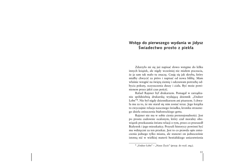 Wstęp do pierwszego wydania w jidysz Świa dec two pro sto z pie kła Zdarzyło mi się już napisać słowo wstępne do kilku innych książek, ale nigdy wcześniej nie miałem poczucia, że ja sam tak mało tu znaczę. Czuję się jak skryba, który miałby chwycić za pióro i napisać od nowa biblię. Mam właśnie wstąpić na świętą ziemię i odczuwam potrzebę odbycia pokuty, oczyszczenia duszy i ciała. Być może powinienem przez jakiś czas pościć. Rafael Rajzner był drukarzem. Pomagał w zarządzaniu spółdzielnią drukarską wydającą dziennik „Undzer Lebn”4. Nie był nigdy dziennikarzem ani pisarzem. I chwała mu za to, że nie starał się nim zostać teraz. Jego książka to zwyczajnie relacja naocznego świadka, kronika strasznego dzieła zniszczenia białostockiego getta. Rajzner nie ma w sobie cienia pretensjonalności. Jest po prostu cudownie ocalonym, który czuł moralny obowiązek przekazania światu relacji o tym, przez co przeszedł Białystok i jego mieszkańcy. Przyszli historycy powinni być mu wdzięczni za ten przekaz. Jest to co prawda opis zniszczenia jednego tylko miasta, ale stanowi on jednocześnie istotną nić w wielkiej materii bestialskiego unicestwienia 4 „Undzer Lebn” – „Nasze Życie” (przyp. do wyd. ang.). 13 RAFAEL RAJZNER polskich i europejskich Żydów dokonanego przez hitlerowskie Niemcy. Kiedy czytasz książkę Rajznera, odczuwasz bolesny skurcz, doświadczasz każdego rodzaju emocji: bezgraniczne współ czu cie, żar li wą mi łość, złość, po trze bę ze msty. I w pewnym momencie przestajesz w to wszystko wierzyć, odwracasz wzrok od zadrukowanych stron i wmawiasz sobie, że taka historia może być jedynie wytworem przewrotnych wyobrażeń chorego umysłu. Ludzie nie mogą być przecież tak straszni, pozbawieni serca i tak bardzo nieludzcy. Ale szybko wracasz do rzeczywistości. Zdajesz sobie sprawę, że ta opowieść jest nie tylko prawdziwa, ale co gorsza nie jest to cała prawda, a tylko jej mała część. Uświadamiasz sobie też, że kiedy ofiary zaczynają mówić o zemście, o starciu wszystkich Niemców z powierzchni ziemi, to one same zaczynają osuwać się w czarną pustkę podobnego koszmaru. Prosty styl Rajznera uwypukla znaczenie tekstu i sam w sobie zasługuje na szczególne uznanie, dlatego że wypadki przezeń opisywane wykraczają poza granice tradycyjnie pojmowanej sztuki literackiej. Nie ma słów zdolnych je opisać ani wyrażeń, które by je ukazały w pełnym rozmiarze. Są to wydarzenia, które opierają się literackim ozdobnikom, mogą być opisywane jedynie przy użyciu prostej, surowej formy. Nie ma takiego artysty, który potrafiłby opisać udrękę człowieka patrzącego przez szczeliny w więziennym murze na tysiące ludzkich istnień, w tym na swoją rodzinę i przyjaciół, jak pędzeni nago wśród padającego śniegu zmierzają do komór gazowych. Ten ból jest tak niezmierzony jak niebo nad pustynią, rozległy jak ocean pochłaniający samotnego pływaka. Rajzner czyni cierpienie nieśmiertelnym w sposób prosty i to jest jego wielka siła. 14 L OSY NIEOPOWIEDZIANE Dzieła literackie czasami popadają w zapomnienie, ale kroniki Rajznera nigdy nie powinno to spotkać. Jehoszua Rapaport Melbourne, 20 listopada 1947 roku