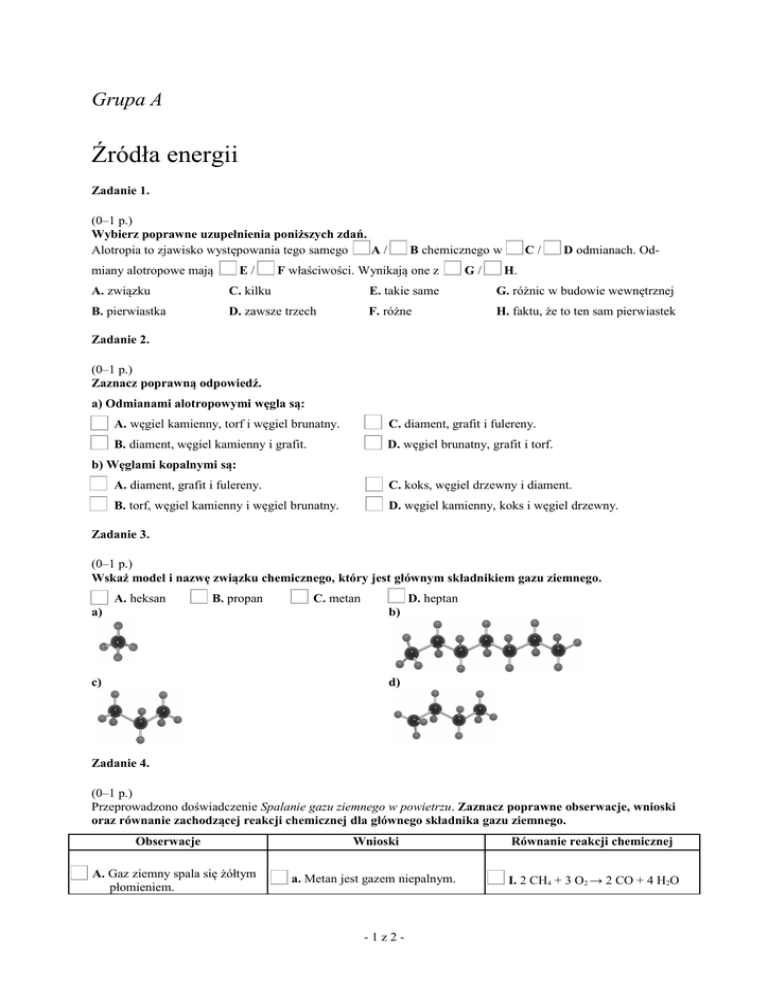 Grupa A Źródła energii Zadanie 1. (0–1 p.) Wybierz poprawne uzupełnienia poniższych zdań. Alotropia to zjawisko występowania tego samego A/ miany alotropowe mają E/ B chemicznego w F właściwości. Wynikają one z G/ C/ D odmianach. Od- H. A. związku C. kilku E. takie same G. różnic w budowie wewnętrznej B. pierwiastka D. zawsze trzech F. różne H. faktu, że to ten sam pierwiastek Zadanie 2. (0–1 p.) Zaznacz poprawną odpowiedź. a) Odmianami alotropowymi węgla są: A. węgiel kamienny, torf i węgiel brunatny. C. diament, grafit i fulereny. B. diament, węgiel kamienny i grafit. D. węgiel brunatny, grafit i torf. b) Węglami kopalnymi są: A. diament, grafit i fulereny. C. koks, węgiel drzewny i diament. B. torf, węgiel kamienny i węgiel brunatny. D. węgiel kamienny, koks i węgiel drzewny. Zadanie 3. (0–1 p.) Wskaż model i nazwę związku chemicznego, który jest głównym składnikiem gazu ziemnego. A. heksan B. propan C. metan D. heptan a) b) c) d) Zadanie 4. (0–1 p.) Przeprowadzono doświadczenie Spalanie gazu ziemnego w powietrzu. Zaznacz poprawne obserwacje, wnioski oraz równanie zachodzącej reakcji chemicznej dla głównego składnika gazu ziemnego. Obserwacje A. Gaz ziemny spala się żółtym płomieniem. Wnioski Równanie reakcji chemicznej a. Metan jest gazem niepalnym. I. 2 CH4 + 3 O2 → 2 CO + 4 H2O -1z2- B. Gaz ziemny spala się żółtym, kopcącym płomieniem. b. Zachodzi reakcja spalania całkowitego. II. CH4 + O2 → C + 2 H2O C. Gaz ziemny spala się niebieskim płomieniem. c. Zachodzi reakcja spalania niecałkowitego do sadzy. III. brak reakcji chemicznej D. Gaz ziemny nie zapala się. d. Zachodzi reakcja spalania niecałkowitego do tlenku węgla(II). IV. CH4 + 2 O2 → CO2 + 2 H2O Zadanie 5. (0–1 p.) Wskaż nazwę procesu wykorzystywanego podczas przeróbki ropy naftowej. Co stanowi podstawę tego procesu? Nazwa procesu Podstawa procesu A. dekantacja a. różny stan skupienia składników ropy naftowej B. piroliza b. różne temperatury wrzenia składników ropy naftowej C. destylacja c. różne gęstości składników ropy naftowej D. sączenie d. różna rozpuszczalność składników ropy naftowej Zadanie 6. (0–1 p.) Wybierz poprawne uzupełnienia poniższych zdań. Benzynę bezołowiową o LO = 98 oznacza się ze spalaniem C/ D. Ta benzyna ma A/ E/ B. Proces spalania tej benzyny jest porównywalny F odporność na spalanie stukowe od benzyny o LO = 95. A. C. mieszaniny 98% izooktanu i 2% heksanu E. większą B. D. mieszaniny 98% izooktanu i 2% heptanu F. mniejszą Zadanie 7. (0–1 p.) Wskaż poprawnie zapisane równanie reakcji krakingu, której poddano węglowodór o wzorze C 16H34, wiedząc, że produkty tej reakcji chemicznej mają taką samą liczbę atomów węgla w cząsteczce. Zaznacz nazwy produktów. A. C16H34 → C10H22 + C6H12 C. C16H34 → C8H18 + C8H16 B. C16H34 → C8H18 + C8H18 D. C16H34 → C7H14 + C9H20 a. hepten, nonan b. oktan, okten c. oktan, oktan d. dekan, heksen Zadanie 8. (0–1 p.) Wskaż poprawnie zapisane równanie reakcji spalania całkowitego izooktanu, produkty tej reakcji chemicznej oraz współczynniki stechiometryczne przy kolejnych reagentach. Substraty Produkty -2z2- Współczynniki stechiometryczne A. C8H16 + O2 a. CO2 + H2O I. 2, 25, 16, 18 B. C8H18 + O2 b. CO + H2O II. 2, 9, 16, 18 C. CO2 + H2O c. C + H2O III. 1, 12, 8, 8 D. C8H14 + O2 d. C8H18+ O2 IV. 2, 23, 16, 14 Zadanie 9. (0–1 p.) Wskaż poprawne dokończenie zdania. Płonącej benzyny nie należy gasić wodą, ponieważ: A. benzyna ma gęstość większą od gęstości wody, więc woda odcina dostęp tlenu do płonącej substancji. B. woda ma gęstość większą od gęstości benzyny, nie odcina więc dostępu tlenu do płonącej substancji. C. produkty spalania benzyny reagują z wodą, tworząc produkty łatwo palne. D. woda może się zapalić. -3z2-