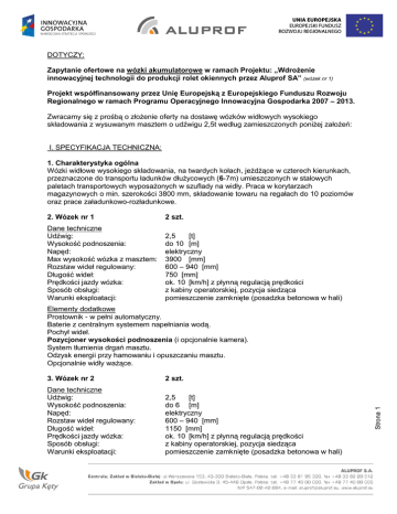 DOTYCZY: Zapytanie ofertowe na wózki akumulatorowe w ramach Projektu: „Wdrożenie innowacyjnej technologii do produkcji rolet okiennych przez Aluprof SA” (wózek nr 1) Projekt współfinansowany przez Unię Europejską z Europejskiego Funduszu Rozwoju Regionalnego w ramach Programu Operacyjnego Innowacyjna Gospodarka 2007 – 2013. Zwracamy się z prośbą o złożenie oferty na dostawę wózków widłowych wysokiego składowania z wysuwanym masztem o udźwigu 2,5t według zamieszczonych poniżej założeń: I. SPECYFIKACJA TECHNICZNA: 1. Charakterystyka ogólna Wózki widłowe wysokiego składowania, na twardych kołach, jeżdżące w czterech kierunkach, przeznaczone do transportu ładunków dłużycowych (6-7m) umieszczonych w stalowych paletach transportowych wyposażonych w szuflady na widły. Praca w korytarzach magazynowych o min. szerokości 3800 mm, składowanie towaru na regałach do 10 poziomów oraz prace załadunkowo-rozładunkowe. 2. Wózek nr 1 2 szt. Dane techniczne Udźwig: Wysokość podnoszenia: Napęd: Max wysokość wózka z masztem: Rozstaw wideł regulowany: Długość wideł: Prędkości jazdy wózka: Sposób obsługi: Warunki eksploatacji: 2,5 [t] do 10 [m] elektryczny 3900 [mm] 600 – 940 [mm] 750 [mm] ok. 10 [km/h] z płynną regulacją prędkości z kabiny operatorskiej, pozycja siedząca pomieszczenie zamknięte (posadzka betonowa w hali) 3. Wózek nr 2 2 szt. Dane techniczne Udźwig: Wysokość podnoszenia: Napęd: Rozstaw wideł regulowany: Długość wideł: Prędkości jazdy wózka: Sposób obsługi: Warunki eksploatacji: 2,5 [t] do 6 [m] elektryczny 600 – 940 [mm] 1150 [mm] ok. 10 [km/h] z płynną regulacją prędkości z kabiny operatorskiej, pozycja siedząca pomieszczenie zamknięte (posadzka betonowa w hali) Strona 1 Elementy dodatkowe Prostownik - w pełni automatyczny. Baterie z centralnym systemem napełniania wodą. Pochył wideł. Pozycjoner wysokości podnoszenia (i opcjonalnie kamera). System tłumienia drgań masztu. Odzysk energii przy hamowaniu i opuszczaniu masztu. Opcjonalnie widły ważące. Elementy dodatkowe Prostownik - w pełni automatyczny. Baterie z centralnym systemem napełniania wodą. Pochył masztu. Pozycjoner rozstawu wideł. System tłumienia drgań masztu. Odzysk energii przy hamowaniu i opuszczaniu masztu. Opcjonalnie widły ważące. 4. Kolorystyka Do ustalenia. II. SPECYFIKACJA OFERTY: 1. Termin wykonania zamówienia Dostawa - listopad 2010 (do 48 TK) 2. Baza cen Wszelkie rozliczenia związane z realizacją zamówienia, którego dotyczy niniejsze zapytanie ofertowe dokonywane będą w PLN. Podana w ofercie cena musi być wyrażona w PLN. Cena musi uwzględniać wszystkie wymagania niniejszego zapytania ofertowego oraz obejmować wszelkie koszty, jakie poniesie Dostawca z tytułu należytego zrealizowania przedmiotowego zamówienia w tym: a) dostawa na warunkach DDU (Incoterms 2000), b) przekazania stosownej dokumentacji technicznej (instrukcji obsługi/DTR w j. polskim oraz dokumentacji UDT), c) uruchomienie/szkolenie/instruktaż, d) pierwszy przegląd gwarancyjny. Cena podana w ofercie musi być podana netto oraz brutto, czyli łącznie z naliczonym podatkiem VAT, wg stawki aktualnie obowiązującej na terytorium Rzeczypospolitej Polskiej. Oczekujemy podania cen w rozbiciu na zamawiane typy wózków. 3. Warunki płatności Oczekiwane: - min. 30 dni od daty podpisania protokołu odbioru urządzenia i wystawienia faktury VAT. Opcjonalne: - przedpłata max do 20% wartości zamówienia płatna min. 14 dni od daty podpisania umowy, na podstawie zaliczkowej faktury VAT, - płatność końcowa w wysokości 80% wartości zamówienia płatna min. 30 dni od daty podpisania protokołu odbioru urządzenia. 5. Gwarancja Oczekiwany okres gwarancji min. 1 rok (lub min. 2500 rg), obowiązujący od daty podpisania protokołu odbioru urządzenia. 6. Inne Przedstawienie warunków i kosztów serwisowych. Strona 2 4. Ważność oferty Minimum 60 dni od daty upływu terminu składania ofert. III. SPOSÓB PRZYGOTOWANIA OFERTY Wymagania podstawowe 1. Oferta musi być podpisana przez osoby upoważnione do reprezentowania Dostawcy. 2. Oferta musi być sporządzona w języku polskim w 1 egzemplarzu i mieć formę pisemną, według załączonego wzoru. Patrz załącznik nr 3 zapytania ofertowego 3. Wzory oświadczeń dołączonych do niniejszego zapytania ofertowego należy wypełnić i złożyć razem z ofertą. 4. Dostawca ponosi wszelkie koszty związane z przygotowaniem i złożeniem oferty. Miejsce złożenia oferty Oferty powinny być dostarczone na adres Zamawiającego: ALUPROF S.A. Zakład w Opolu 45-446 Opole, ul. Gosławicka 3 Na ręce: p. Marek Leśniewski Termin złożenia oferty Nieprzekraczalny termin złożenia ofert: do 10 września 2010r., do godz. 15:00. Sposób złożenia oferty W zamkniętej, nieprzeźroczystej kopercie z wprowadzonym tytułem zamówienia: „Wózki akumulatorowe” Prosimy o dostarczenie oferty pocztą kurierską i nie przesyłanie ofert faksem lub e-mailem. Istnieje możliwość uzyskania informacji wyjaśniających, dotyczących zapytania ofertowego kierowanych na adres e-mailowy [email protected] w terminie do 3 września 2010r. Równocześnie zastrzegamy sobie prawo udzielenia odpowiedzi na pytanie zadane przez któregokolwiek z Oferentów do wszystkich uczestników postępowania. IV. WARUNKI UDZIAŁU W POSTĘPOWANIU WYBORU DOSTAWCY 1. Dostawca ubiegający się o zamówienie muszą spełniać niżej wymienione warunki formalne udziału w postępowaniu: a) posiadać uprawnienia do wykonywania określonej działalności lub czynności w zakresie odpowiadającym przedmiotowi zamówienia, jeżeli ustawy lub inne przepisy nakładają obowiązek posiadania takich uprawnień, b) posiadać niezbędną wiedzę i doświadczenie oraz dysponować potencjałem technicznym i kadrowym zdolnym do wykonania zamówienia, c) znajdować się w sytuacji ekonomicznej i finansowej zapewniającej wykonanie zamówienia, d
