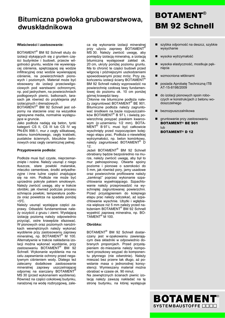 Bitumiczna powłoka grubowarstwowa, dwuskładnikowa Właściwości i zastosowanie: ® BOTAMENT BM 92 Schnell służy do izolacji stykających się z gruntem części budynków i budowli, przeciw wilgotności gruntu, wodzie nie wywierającej ciśnienia, spiętrzającej się wodzie infiltracyjnej oraz wodzie wywierającej ciśnienie, na powierzchniach pionowych i poziomych. Materiał może być stosowany do izolacji przeciwwilgociowych pod warstwami ochronnymi, np. pod jastrychem, na powierzchniach podłogowych piwnic, balkonach, tarasach jak również do przyklejania płyt izolacyjnych i drenażowych. ® BOTAMENT BM 92 Schnell jest odporny na starzenie oraz na wszystkie agresywne media, normalnie występujące w gruncie. Jako podłoża nadają się beton, tynki kategorii CS II, CS III lub CS IV wg PN-EN 998-1, mur z cegły silikatowej, betonu komórkowego, cegły kratówki, pustaków ściennych, bloczków betonowych oraz cegły ceramicznej pełnej. Przygotowanie podłoża: Podłoże musi być czyste, nieprzemarznięte i nośne. Należy usunąć z niego tłuszcze, stare powłoki malarskie, mleczko cementowe, środki antyadhezyjne i inne luźne części znajdujące się na nim. Podłoże nie może być uprzednio pokryte pakiem smołowym. Należy zwrócić uwagę, aby w trakcie obróbki, jak również podczas procesu schnięcia powłoki, temperatura podłoża oraz powietrza na spadała poniżej +5°C. Należy usunąć wystające części zaprawy. Odsadzki fundamentowe należy oczyścić z gruzu i ziemi. Wystającą izolację poziomą należy odpowiednio przyciąć, ostre krawędzie sfazować. W pionowych oraz poziomych narożnikach wewnętrznych należy wykonać wyoblenie przy zastosowaniu zaprawy ® mineralnej, np. BOTAMENT M 100. Alternatywnie w trakcie nakładania izolacji można wykonać wyoblenie, przy ® zastosowaniu BOTAMENT BM 92 Schnell. Wykonanie wyoblenia ma na celu zapewnienie ochrony przed negatywnym ciśnieniem wody. Dlatego też zalecamy dodatkowe zastosowanie mineralnej zaprawy uszczelniającej ® odpornej na siarczany BOTAMENT MS 30 (przed wykonaniem wyoblenia). Również na części cokołowej budynku, narażonej na wodę rozbryzgową, zale- ca się wykonanie izolacji mineralnej ® przy użyciu zaprawy BOTAMENT MS 30. Należy zwrócić uwagę, aby pomiędzy izolacją mineralną, a izolacją bitumiczną występował zakład ok. 20 cm, ukryty poniżej poziomu gruntu. Ma to chronić te części budowli przed wilgocią i późniejszymi uszkodzeniami spowodowanymi przez mróz. Przy za® kończeniu izolacji ściany BOTAMENT BM 92 Schnell należy wyprowadzić na powierzchnię czołową ławy fundamentowej do poziomu ok. 10 cm poniżej górnej krawędzi ławy. Chłonne nie bitumiczne podłoża nale® ży zagruntować BOTAMENT BE 901. Bitumiczne podłoża należy zagruntować środkiem na bazie rozpuszczalni® ków BOTAMENT B 97 L i świeżą powierzchnię posypać piaskiem kwarcowym (o uziarnieniu 1/2 mm). BOTA® MENT B 97 L musi być całkowicie wyschnięty przed rozpoczęciem kolejnego etapu prac. Podłoża o niewielkiej wytrzymałości, np. beton komórkowy, ® należy zagruntować BOTAMENT D 12. ® Jeżeli BOTAMENT BM 92 Schnell obrabiany będzie bezpośrednio na murze, należy zwrócić uwagę, aby był to mur pełnospoinowy. Otwarte spoiny poziome i pionowe o szerokości do 5 mm, jak również pory, jamy usadowe oraz powierzchnie profilowane należy „zamknąć” poprzez wykonanie szpachlowania wypełniającego. Szpachlowanie należy przeprowadzić na wyschniętej zagruntowanej powierzchni. Przed przystąpieniem do kolejnego etapu prac należy odczekać, aż szpachlowanie wyschnie. Ubytki i wgłębienia większe niż 5 mm należy przed na® łożeniem BOTAMENT BM 92 Schnell wypełnić zaprawą mineralna, np. BO® TAMENT M 100. Obróbka: ® BOTAMENT BM 92 Schnell dostarczany jest w opakowaniu zawierającym dwa składniki w odpowiednio dobranych proporcjach. Przed przystąpieniem do mieszania należy komponent proszkowy wsypać do komponentu płynnego (nie odwrotnie). Należy mieszać bez przerw tak długo, aż powstanie masa o jednorodnej konsystencji. Wymieszany materiał można obrabiać w czasie ok. 90 minut. Na zewnętrznych ścianach piwnic izolację należy zawszę nakładać na tę stronę budynku, na której występuje BOTAMENT® BM 92 Schnell szybka odporność na deszcz, szybkie wysychanie wysoka wytrzymałość wysoka elastyczność, mostkuje pęknięcia wzmocniona włóknami posiada Aprobatę Techniczną ITB AT-15-8198/2009 do izolacji pionowych spoin roboczych w konstrukcjach z betonu wodoszczelnego bezrozpuszczalnikowa gruntowanie przy zastosowaniu BOTAMENT® BE 901 lub BOTAMENT® D 12 BOTAMENT® BM 92 Schnell Baza materiałowa: komponent płynny: emulsja bitumiczno-kauczukowa Gęstość: 3 ok. 1,15 kg/dm Konsystencja: pasta Czas obróbki: ok. 90 minut Temperatura obróbki: od +5 °C do +30 °C Odporność na temperaturę: od -20 °C do +80 °C Proporcje mieszania: komponent płynny : komponent proszkowy = 2,5 : 1 Maksymalna grubość nanoszenia: 6 mm w stanie mokrym Czas schnięcia: ok. 2 dni (patrz wskazówki) Środki do czyszczenia: w świeżym stanie materiału: woda, po wyschnięciu: rozpuszczalnik BOTAMENT® SYSTEMBAUSTOFFE 63-000 Środa Wlkp. · ul. Prądzyńskiego 20 Tel. 061/286-45-20,-33 · Fax 061/286-45-14 www.botament.pl · [email protected] Bitumiczna powłoka grubowarstwowa, dwuskładnikowa obciążenie wodą. Należy unikać negatywnego oddziaływania wody na izolację, ponieważ mogą wystąpić problemy z wysychaniem, a także może to ® spowodować odrywanie BOTAMENT BM 92 Schnell od podłoża. ® Nakładanie BOTAMENT BM 92 Schnell następuje przy użyciu kielni oraz pacy. Przy nakładaniu należy pamiętać, aby dokładnie pokryć powierzchnie zarówno narożników wewnętrznych, jak i zewnętrznych. ® Nakładanie BOTAMENT BM 92 Schnell powinno odbywać się w dwóch warstwach, pod warunkiem, że pierwsza warstwa jest na tyle wyschnięta, 