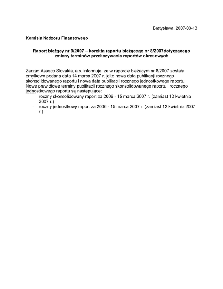 Bratysława, 2007-03-13 Komisja Nadzoru Finansowego Raport bieżący nr 9/2007 – korekta raportu bieżącego nr 8/2007dotyczącego zmiany terminów przekazywania raportów okresowych Zarzad Asseco Slovakia, a.s. informuje, że w raporcie bieżącym nr 8/2007 została omyłkowo podana data 14 marca 2007 r. jako nowa data publikacji rocznego skonsolidowanego raportu i nowa data publikacji rocznego jednostkowego raportu. Nowe prawidłowe terminy publikacji rocznego skonsolidowanego raportu i rocznego jednostkowego raportu są następujące: - roczny skonsolidowany raport za 2006 - 15 marca 2007 r. (zamiast 12 kwietnia 2007 r.) - roczny jednostkowy raport za 2006 - 15 marca 2007 r. (zamiast 12 kwietnia 2007 r.) -./01/234/5607869/8:9;<8/=>07>?1.8;=/07@ A?40/1:./57@ B