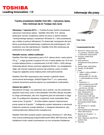 Informacje dla prasy Toshiba przedstawia Satellite Click Mini – hybrydowy laptop, który dostosuje się do Twojego stylu życia Warszawa, 7 stycznia 2015 r. – Toshiba Europe GmbH przedstawia najnowszy hybrydowy laptop - Satellite Click Mini. 8.9- calowe, atrakcyjne cenowo urządzenie zdolne do pracy w dwóch trybach –funkcjonalnego laptopa z systemem Windows 8.1, który przeistacza się w tablet za jednym kliknięciem.To doskonałe rozwiązanie dla tych, Fakty i liczby którzy poszukują kompaktowego urządzenia dla podróżujących, dla studentów oraz dla najmłodszych. Satellite Click Mini dostosuje się praktycznie do każdych potrzeb. Niewielki rozmiar, wielkie możliwości Satellite Click Mini wyposażony jest w 8.9- calowy ekran i waży jedyne 470 g 1 , a jego grubość to jedyne 9.8 mm w trybie tabletu lub 19.9 mm w trybie laptopa.Ekran o rozdzielczości Full HD (1920 x 1200) oferuje doskonałą jakość obrazu podczas oglądania filmów, czy przeglądania zdjęć, jak również zapewnia szerszy kąt widzenia, przez co treści mogą być oglądane przez większą ilość osób jednocześnie. Satellite Click Mini wyposażony jest również w głośniki stereo wzmocnione technologią Dolby® Digital Plus™, co z pewnością zostanie docenione podczas grania czy wyświetlania multimediów. Zawsze tam gdzie Ty Niezależnie od tego, czy wybierasz się w podróż, czy też zamierzasz spędzać swój wolny czas w domuSatellite Click Mini oferuje wszystko to czego potrzebujesz, aby móc wygodnie grać lub pracować w ciągu dnia. Po podłączeniu klawiatury urządzenie może wyświetlać filmy nawet przez 16 godzin 1 . W trybie tabletu zapewni nieprzerwaną pracę nawet do 8 godzin 1 .Inteligentny system ładowania w pierwszej kolejności dostarczy energii tabletowi, a następnie klawiaturze, aby zmaksymalizować efektywność energetyczną. Satellite Click Mini posiada system operacyjny Windows 8.1 with Bing oraz roczną subskrypcję programuMicrosoft Office 365 Personal, która dodatkowo może zostać przeniesiona na inny komputer.Dodatkowo ToshibaSatelliteClick Mini: Ekran:8.9- calowy (22.6 cm), 10- punktowy, WUXGA (1920 x 1200) ekran dotykowyIPS Procesor: Intel® Atom TMZ3735F Karta graficzna: Zintegrowana karta graficzna Intel® Pamięć RAM: 2GB DDR3L Pamięć: 32 GB eMMC Porty: Tablet:1 x Micro-HDMI®, 1 xMicro-USBi 1 x portmicroSD (do 128 GB), 1 x Mic/Headphone Combo port Klawiatura: 1 x pełnowymiarowy port USB 2.0, 1 x pełnowymiarowy port SD (do 128 GB) Połączenie: WiFi® 802.11 b/g/n, Bluetooth® 4.0, wireless display ready Tylna kamera 5 MP auto focus, przednia kamera 2 MP Audio: Głośniki stereo z technologią Dolby® Digital Plus™ OS: Windows 8.1 Update with Bing Rocznasubskrypcja Microsoft Office 365 Personal Bateria: Do 16 godzin 1 w trybie laptopa Kolor: Satynowo złotyTM lub perłowo biały Wymiary: Informacje dla prasy użytkownicy otrzymują 1TB pamięci w chmurze z aplikacjąOneDrive oraz 60 minut darmowych rozmów telefonicznych na całym świecie poprzezSkype. Komputer napędza procesor Intel®AtomTM, który zapewni zoptymalizowaną wydajność, szybkie przeglądanie internetu oraz wrażenia graficzne w najnowszych mobilnych grach. Toshiba Satellite Click Mini dostępny będzie w Europe w pierwszym kwartale2015 roku w wersji perłowo białej. Wersja satynowo złota będzie dostępna w drugim kwartale2015 roku. Toshiba online Więcej informacji dostępnych jest na stronie: www.toshiba.pl Kontakt dla mediów: Marcin Niedzielski Partner of Promotion [email protected] +48 22 858 74 58 wew. 52 KlaudiaPiwowar Partner of Promotion [email protected] +48 22 858 74 58 wew. 42 Michal Houdek Toshiba Europe GmbH [email protected] +42 0 730 156 268 Odwiedź nas online Odwiedź naszą stronę i bądź na bieżąco z produktami, specyfikacjami i ofertami specjalnymi: www.toshiba.pl Polub nas na Facebooku: www.facebook.com/Toshiba.Polska Wszystkie znaki towarowe wymienione w tym dokumencie należą do ich właścicieli. Tryb tabletu: 235 x 161 x 9.8mm Tryb laptopa : 235 x 170.6 x 19.9 mm Waga: Tablet: 470 g 2 Laptop: 999 g 2 Informacje dla prasy Dokładna specyfikacja produktu uzależniona jest od modelu i dostępności w danym regionie. O Toshiba: Firma Toshiba jest światowym liderem i innowatorem w dziedzinie wprowadzania zaawansowanych technologii, producentem i sprzedawcą wielu różnych produktów elektrycznych i elektronicznych na rynku systemów informatycznych i komunikacyjnych, cyfrowych produktów powszechnego użytku, urządzeń i podzespołów elektronicznych, systemów zasilania (w tym systemów korzystających z energii nuklearnej), systemów do obsługi infrastruktur przemysłowych i społecznych oraz urządzeń domowych. Firma Toshiba została założona w 1875 roku i dzisiaj składa się z sieci ponad 590 firm zatrudniających 206 000 pracowników na całym świecie, a jej roczna sprzedaż przekracza 68 miliardów dolarów amerykańskich. Więcej informacji na temat firmy Toshiba znajduje się na stronie: www.toshiba.pl Toshiba Europe GmbH, z siedzibą w Neuss, Niemcy, jest częścią grupy Toshiba Corporation, Tokyo. 1 Preliminary 2 Part of the one year subscription to Microsoft Office 365 Personal * PRESS_PDF_FOOTER_TEXT *
