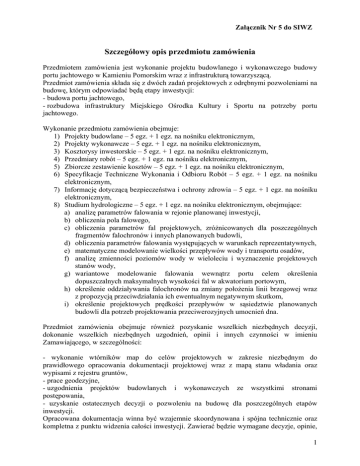 Załącznik Nr 5 do SIWZ Szczegółowy opis przedmiotu zamówienia Przedmiotem zamówienia jest wykonanie projektu budowlanego i wykonawczego budowy portu jachtowego w Kamieniu Pomorskim wraz z infrastrukturą towarzyszącą. Przedmiot zamówienia składa się z dwóch zadań projektowych z odrębnymi pozwoleniami na budowę, którym odpowiadać będą etapy inwestycji: - budowa portu jachtowego, - rozbudowa infrastruktury Miejskiego Ośrodka Kultury i Sportu na potrzeby portu jachtowego. Wykonanie przedmiotu zamówienia obejmuje: 1) Projekty budowlane – 5 egz. + 1 egz. na nośniku elektronicznym, 2) Projekty wykonawcze – 5 egz. + 1 egz. na nośniku elektronicznym, 3) Kosztorysy inwestorskie – 5 egz. + 1 egz. na nośniku elektronicznym, 4) Przedmiary robót – 5 egz. + 1 egz. na nośniku elektronicznym, 5) Zbiorcze zestawienie kosztów – 5 egz. + 1 egz. na nośniku elektronicznym, 6) Specyfikacje Techniczne Wykonania i Odbioru Robót – 5 egz. + 1 egz. na nośniku elektronicznym, 7) Informację dotyczącą bezpieczeństwa i ochrony zdrowia – 5 egz. + 1 egz. na nośniku elektronicznym, 8) Studium hydrologiczne – 5 egz. + 1 egz. na nośniku elektronicznym, obejmujące: a) analizę parametrów falowania w rejonie planowanej inwestycji, b) obliczenia pola falowego, c) obliczenia parametrów fal projektowych, zróżnicowanych dla poszczególnych fragmentów falochronów i innych planowanych budowli, d) obliczenia parametrów falowania występujących w warunkach reprezentatywnych, e) matematyczne modelowanie wielkości przepływów wody i transportu osadów, f) analizę zmienności poziomów wody w wieloleciu i wyznaczenie projektowych stanów wody, g) wariantowe modelowanie falowania wewnątrz portu celem określenia dopuszczalnych maksymalnych wysokości fal w akwatorium portowym, h) określenie oddziaływania falochronów na zmiany położenia linii brzegowej wraz z propozycją przeciwdziałania ich ewentualnym negatywnym skutkom, i) określenie projektowych prędkości przepływów w sąsiedztwie planowanych budowli dla potrzeb projektowania przeciwerozyjnych umocnień dna. Przedmiot zamówienia obejmuje również pozyskanie wszelkich niezbędnych decyzji, dokonanie wszelkich niezbędnych uzgodnień, opinii i innych czynności w imieniu Zamawiającego, w szczególności: - wykonanie wtórników map do celów projektowych w zakresie niezbędnym do prawidłowego opracowania dokumentacji projektowej wraz z mapą stanu władania oraz wypisami z rejestru gruntów, - prace geodezyjne, - uzgodnienia projektów budowlanych i wykonawczych ze wszystkimi stronami postępowania, - uzyskanie ostatecznych decyzji o pozwoleniu na budowę dla poszczególnych etapów inwestycji. Opracowana dokumentacja winna być wzajemnie skoordynowana i spójna technicznie oraz kompletna z punktu widzenia całości inwestycji. Zawierać będzie wymagane decyzje, opinie, 1 uzgodnienia, zgody i pozwolenia w zakresie wynikającym z przepisów prawa, w szczególności prawa budowlanego oraz prawa ochrony środowiska. Wykonawca zobowiązany jest do pełnienia nadzoru autorskiego na podstawie odrębnie zawartej z Zamawiającym umowy. Pełnienie nadzoru autorskiego nie jest tematem niniejszego przetargu i nie należy ujmować go w ofercie. Dokumentacja posiadana przez Zamawiającego: 1. Koncepcja programowa budowy infrastruktury i wspólnej marki turystycznej Zachodniopomorskiego Szlaku Żeglarskiego w części dotyczącej gminy Kamień Pomorski, 2. Wizja architektoniczna (rysunek) portu jachtowego w Kamieniu Pomorskim. Zamawiający przekaże Wykonawcy posiadaną koncepcje i wizję architektoniczną, zaś Wykonawca, opracowując projekt, dostosuje go do miejscowych warunków na podstawie badań hydrologicznych. Zakres rzeczowy Port jachtowy 1) Opis ogólny. Akwen Zalewu Kamieńskiego wyznaczony przez od zachodu przez Nabrzeże Pasażerskie, od wschodu przez żelbetową kładkę do Żółcina, a od południa ograniczony istniejącym nabrzeżem miejskim tworzy naturalna przystań żeglarską, która po adaptacji i odpowiedniej modernizacji stworzy nowoczesny port jachtowy dla około 200 jachtów. Basen Portu Jachtowego o powierzchni 43.760 m2 zabezpieczony odpowiednimi falochronami długości około 260 m i wyposażony w pomosty pływające o ogólnej długości ok. 350 m zapewni doskonałe warunki dla cumowania jachtów o głębokości zanurzenia do 2,0 m. 2) Nabrzeża. Istniejących obecnie nabrzeży nie przeznacza się do cumowania jachtów (Nabrzeże Miejskie i Nabrzeże Pasażerskie). Cumowanie jachtów będzie odbywało się przy projektowanych pomostach pływających. Pomosty wyposażone będą w pachoły cumownicze, skrzynki poboru energii elektrycznej, oświetlenie i urządzenia do poboru wody. Na końcu falochronu przewiduje się punkt widokowy. 3) Basen żeglarski. Basen żeglarski o powierzchni 43.760 m2 podzielony będzie na 5 części i umożliwiać będzie cumowanie ok. 200 jachtów. Głębokość basenu wyniesie 2,5 m. 4) Budynek socjalno – biurowy. Na terenie portu jachtowego na nabrzeżu przewiduje się usytuowanie na osi miejskich ciągów komunikacyjnych małego obiektu kubaturowego o lekkiej konstrukcji wolnostojącego nie podpiwniczonego parterowego budynku socjalno – biurowego, z poddaszem użytkowym. 2 W budynku przewiduje się usytuowanie: sanitariatów damskich i męskich, natrysków, sali wykładowo – konferencyjnej, siedziby klubu żeglarskiego, siedziby Wodnego Ochotniczego Pogotowia Ratunkowego, pomieszczeń sklepu żeglarskiego, biura obsługi portu (siedziba bosmana). Konstrukcja budynku tradycyjna, drewniana więźba dachowa z naczółkami i kącie pochylenia połaci dachowej 45o kryta dachówką ceramiczną. Budynek będzie posiadać instalacje i udogodnienia przystosowujące je do użytkowania przez osoby niepełnosprawne, co zostanie uwzględnione w projekcie technicznym. 1) Powierzchnia zabudowy 800 m2 2) Powierzchnia użytkowa 1350 m2 3) Kubatura 4000 m3 Wstępny projekt 