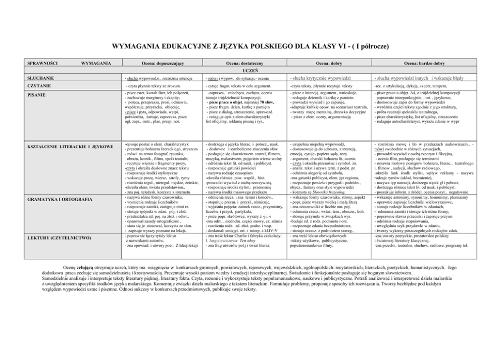 WYMAGANIA EDUKACYJNE Z JĘZYKA POLSKIEGO DLA KLASY VI - ( I półrocze) SPRAWNOŚCI WYMAGANIA Ocena: dopuszczający Ocena: dostateczny Ocena: dobry Ocena: bardzo dobry UCZEŃ SLUCHANIE - słucha wypowiedzi., rozróżnia intencje - mówi i wypow. do sytuacji,- ocenia - słucha krytycznie wypowiedzi - słucha wypowiedzi innych i wskazuje błędy CZYTANIE - czyta płynnie teksty ze zrozum. - cytuje fragm. tekstu w celu argument. -czyta teksty, płynnie recytuje teksty -rec. z artykulacją, dykcją, akcent, tempem, - pisze estet, kształt liter, ich połączeń, - zachowuje marginesy i akapity; - poleca, przeprasza, prosi, odmawia, współczuje, przyrzeka, obiecuje, - pisze i pyta, odpowiada, wątpi, potwierdza, żartuje, zaprzecza, pisze ogł, zapr., instr., plan, przep, not, -zaprasza, zniechęca, zachęca, ocenia stosuje trójdzielność kompozycji. - pisze prace o objęt. najmniej 70 słów, - pisze fragm. dzien, kartkę z pamiętn - pisze e dialog, streszczenie, sprawozd. - redaguje opis z elem charakterystyki list oficjalny, reklamę pisaną i rys., - pisze z intencją, argument., wnioskuje, - redaguje dziennik i kartkę z pamietn. - prowadzi wywiad i go zapisuje, -adaptuje krótkie opow. na scenariusz teatraln, - tworzy mapę mentalną, drzewko decyzyjne - pisze z elem. oceny, argumentacją - pisze prace o objęt. A4, o trójdzielnej kompozycji poprawnie interpunkcyjnie. , ort. , językowo, - dostosowuje zapis do formy wypowiedzi - wyróżnia części tekstu zgodnie z jego strukturą, - próba recenzji spektaklu teatralnego, - pisze charakterystykę, list oficjalny, streszczenie - redaguje autocharakteryst, wyraża zdanie w wypr -opisuje postać o elem. charakterystyk - prezentuje bohatera literackiego, streszcza - mówi na temat fotograf, rysunku, obrazu, komik., filmu, spekt teatraln, - recytuje wiersze i fragmenty prozy, -czyta i określa dosłowne znacz tekstu - rozpoznaje środki stylistyczne - wskazuje prozę, wiersz, strofy, rymy - rozróżnia regul., nieregul. męskie, żeńskie, -określa elem. świata przedstawion., - zna poj. teledysk, korzysta z internetu - nazywa różne formy czasownika, - wymienia rodzaje liczebników - rozpoznaje zaimki, zastępuje nimi rz. - stosuje spójniki w zdan. poj. i złoż. - przekształca zd. poj. na złoż. i odwr., - opanował zasady ortograficzne , - stara się je stosować, korzysta ze słon. - zapisuje wyrazy poznane na lekcji, - poprawnie łączy tytuły lektur z nazwiskami autorów, - zna opowiad. i utwory poet. Z lekcjilekcji - dostrzega e języka literac. i potocz., nauk. - dosłowne i symboliczne znaczenia słów - posługuje się słownictwem teatral, filmem, muzyką, malarstwem, pojęciem wiersz wolny - odróżnia tekst lit. od nauk. i publicyst. - rozpoznaje gatunki powieści - nazywa rodzaje czasopism -określa różnice pow. współ., hist. -prowadzi wywiad z osobą rzeczywistą, - rozpoznaje środki stylist.: przenosnię - nazywa środki masowego przekazu - odmienia rzecz. i zna temat i konców., - stopniuje przym. i przysł., różnicuje, - wyjaśnia pojęcia: zaimek rzecz., przymiotny, liczebn. i przysł, partykuła, - pisze popr. skrótowce, wyrazy z -ji, -i -zna odm.., niedodm. części mowy, cz. zdania - rozróżnia rodz. zd. złoż. podrz. i wsp. - doskonali umiejęt. ort. i interp. z kl.IV-V - zna treść lektur Charlie i fabryka czekolady, I. Jurgielewiczowa- Ten obcy - zna frag utworów pol.j i świat literat. - uzupełnia niepełną wypowiedź, - dostosowuje ją do adresata, z intencją, emocją, cytuje- popiera sądy, tezy - argument, charakt bohatera lit, ocenia - czyta i określa przenośne i symbol. zn. - analiz. tekst i używa term. z podst. pr. - odróżnia alegorię od symbolu, -zna gatunki publicyst, elem. jęz regionu, - rozpoznaje powieści przygod.- podróżn., obycz., fantasy oraz style wypowiedzi - korzysta ze Słownika frazeolog. - wskazuje formy czasownika, strony, aspekt - popr, pisze wyrazy wielką i małą literą - zna rzeczowniki w liczbie mn. poj. - odmienia rzecz.: wstaz. tem., oboczn., koń. - stosuje przyimki w związkach wyr. -buduje zd. z rodz. podmiotu i orz. - rozpoznaje zdania bezpodmiotowe, - stosuje orzecz. z podmiotem szereg., - zna treść lektur obowiązkowych -teksty użytkowe, publicystyczne, popularnonaukowe filmy, - rozróżnia mowę i tło w przekazach audiowizualn., mówi swobodnie w różnych sytuacjach, - prowadzi wywiad z osobą rzeczyw i fikcyjną, - ocenia film, posługuje się terminami - omawia motywy postępow bohatera, literac., teatralnego i, filmow., audycji, słuchow radiowego, -określa funk środk stylist, wpływ reklamy - nazywa rodzaje rymów (układ, brzmienie), - nazywa typ narracji, dostrzega wątek gł i pobocz, - dostrzega różnice tekst lit. od nauk. i publicyst. - poszukuje inform. z źródeł, ocenia pozyt., negatywnie - wskazuje antonimy, synonimy, homonimy, pleonazmy - oprawnie zapisuje liczebniki wielowyrazowe, - stosuje rodzaje liczebników w zdaniach, - odmienia zaimki i stosuje ich różne formy, - poprawnie stawia przecinki i zapisuje przyim - odróżnia rodzaje stopniowania, - uwzględnia szyk przydawki w zdaniu, - tworzy wykresy poszczególnych rodzajów zdań, -zna utwory poetyckie, prozatorskie polskiej i światowej literatury klasycznej, -zna przedst.. teatralne, słuchow. radiowe, programy tel. PISANIE KSZTAŁCENIE LITERACKIE I JĘYKOWE GRAMATYKA I ORTOGRAFIA LEKTURY (CZYTELNICTWO) Ocenę celującą otrzymuje uczeń, który ma osiągnięcia w konkursach gminnych, powiatowych, rejonowych, wojewódzkich, ogólnopolskich: recytatorskich, literackich, poetyckich, humanistycznych. Jego dodatkowa praca cechuje się samodzielnością i kreatywnością. Prezentuje wysoki poziom wiedzy i erudycji interdyscyplinarnej. Świadomie i funkcjonalnie posługuje się bogatym słownictwem.. Samodzielnie analizuje i interpretuje teksty literatury pięknej, literatury faktu. Czyta, rozumie i wykorzystuje teksty popularnonaukowe, naukowe i publicystyczne. Potra
