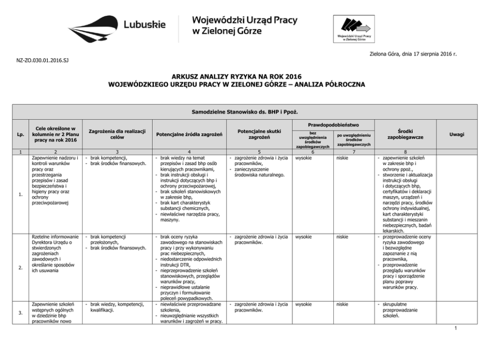 Zielona Góra, dnia 17 sierpnia 2016 r. NZ-ZO.030.01.2016.SJ ARKUSZ ANALIZY RYZYKA NA ROK 2016 WOJEWÓDZKIEGO URZĘDU PRACY W ZIELONEJ GÓRZE – ANALIZA PÓŁROCZNA Samodzielne Stanowisko ds. BHP i Ppoż. Lp. 1 1. 2. 3. Cele określone w kolumnie nr 2 Planu pracy na rok 2016 Prawdopodobieństwo Zagrożenia dla realizacji celów Potencjalne źródła zagrożeń Potencjalne skutki zagrożeń bez uwzględnienia środków zapobiegawczych po uwzględnieniu środków zapobiegawczych 2 Zapewnienie nadzoru i kontroli warunków pracy oraz przestrzegania przepisów i zasad bezpieczeństwa i higieny pracy oraz ochrony przeciwpożarowej 3 - brak kompetencji, - brak środków finansowych. 4 - brak wiedzy na temat przepisów i zasad bhp osób kierujących pracownikami, - brak instrukcji obsługi i instrukcji dotyczących bhp i ochrony przeciwpożarowej, - brak szkoleń stanowiskowych w zakresie bhp, - brak kart charakterystyk substancji chemicznych, - niewłaściwe narzędzia pracy, maszyny. 5 - zagrożenie zdrowia i życia pracowników, - zanieczyszczenie środowiska naturalnego. 6 wysokie niskie 7 Rzetelne informowanie Dyrektora Urzędu o stwierdzonych zagrożeniach zawodowych i określanie sposobów ich usuwania - brak kompetencji przełożonych, - brak środków finansowych. - zagrożenie zdrowia i życia pracowników. wysokie niskie Zapewnienie szkoleń wstępnych ogólnych w dziedzinie bhp pracowników nowo - brak wiedzy, kompetencji, kwalifikacji. - brak oceny ryzyka zawodowego na stanowiskach pracy i przy wykonywaniu prac niebezpiecznych, - niedostarczenie odpowiednich instrukcji DTR, - nieprzeprowadzenie szkoleń stanowiskowych, przeglądów warunków pracy, - nieprawidłowe ustalanie przyczyn i formułowanie poleceń powypadkowych. - niewłaściwie przeprowadzane szkolenia, - nieuwzględnianie wszystkich warunków i zagrożeń w pracy. - zagrożenie zdrowia i życia pracowników. wysokie niskie Środki zapobiegawcze Uwagi 8 - zapewnienie szkoleń w zakresie bhp i ochrony ppoż., - stworzenie i aktualizacja instrukcji obsługi i dotyczących bhp, certyfikatów i deklaracji maszyn, urządzeń i narzędzi pracy, środków ochrony indywidualnej, kart charakterystyki substancji i mieszanin niebezpiecznych, badań lekarskich. - przeprowadzenie oceny ryzyka zawodowego i bezwzględne zapoznanie z nią pracownika, - przeprowadzenie przeglądu warunków pracy i sporządzenie planu poprawy warunków pracy. - skrupulatne przeprowadzanie szkoleń. 1 przyjętych i ochrony przeciwpożarowej wszystkich pracowników w tym zapoznawanie się z Instrukcją Bezpieczeństwa Pożarowego Zapewnienie analizy stanu bezpieczeństwa i higieny pracy - brak środków finansowych. - brak wyposażenia pracowników w środki ochrony indywidualnej, odzież i obuwie robocze, - brak uprawnień kwalifikacyjnych pracowników, - niewykonywanie poleceń powypadkowych i pokontrolnych przez przełożonych. - zagrożenie zdrowia i życia pracowników. wysokie niskie - brak przepisów prawa. - brak znajomości regulacji wewnętrznych, - nieprzestrzeganie przepisów i zasad bhp i ochrony ppoż., - brak konsultacji i współdziałania. - zagrożenie zdrowia i życia pracowników. wysokie niskie - brak regulacji wewnętrznych, - brak środków na modernizacje, - brak współpracy. - błąd/zaniedbanie pracownika, - niewystarczająca komunikacja i współpraca, - natłok innych obowiązków w stosunku do możliwości czasowych, - nieznajomość przepisów prawa, - błędna interpretacja przepisów. - zagrożenie zdrowia i życia pracowników. wysokie niskie - zaznajamianie się z przepisami, - prowadzenie konsultacji i współdziałanie z komórkami organizacyjnymi WUP, - współdziałanie z głównym księgowym WUP. - brak regulacji dot. tego zakresu, - nieznajomość przepisów prawa. - błąd/zaniedbanie pracownika, - niewystarczająca komunikacja i współpraca, - natłok innych obowiązków w - zagrożenie zdrowia i życia pracowników. wysokie niskie - zaznajamianie się z przepisami, - współpraca z instytucjami 4. 5. 6. 7. Rzetelne opracowywanie, opiniowanie wewnętrznych zarządzeń, regulaminów, opracowań, instrukcji bhp oraz doradztwo w tym zakresie Zapewnienie współdziałania w opracowywaniu planów modernizacji i rozwoju Urzędu, w przekazywaniu do użytkowania pomieszczeń pracy pod względem wymagań bezpieczeństwa i higieny pracy oraz ochrony przeciwpożarowej Zapewnienie realizacji zadań w zakresie ustalania okoliczności i przyczyn wypadków - zapewnienie środków ochrony indywidualnej, odzieży i obuwia roboczego, uprawnień kwalifikacyjnych, - wykonywanie poleceń powypadkowych i pokontrolnych, - kontrola terminów przeglądów technicznych, czynności konserwacyjnych gaśnic i hydrantów wewnętrznych, - zapewnienie odpowiedniej liczby i sprawności urządzeń higieniczno – sanitarny. - zaznajamianie się z przepisami, - prowadzenie konsultacji i współdziałanie z odpowiednimi instytucjami zewnętrznymi. 2 8. 9. przy pracy oraz wniosków wynikających z wypadków przy pracy i chorób zawodowych (w tym prowadzenie rejestrów i kompletowanie dokumentacji i jej przechowywanie) Zapewnienie udziału w dokonywaniu oceny ryzyka zawodowego związanego z wykonywaną pracą w Urzędzie Uczestnictwo w konsultacjach w zakresie bezpieczeństwa i higieny pracy - niedopełnienie obowiązku ustawowego. - - niezrealizowanie zadań. - stosunku do możliwości czasowych, nieznajomość procedur ustalania okoliczności wypadków przy pracy, błędna interpretacja przepisów, błędy w dokumentacji dotyczącej wypadków przy pracy i chorób zawodowych. zaniedbanie pracownika, błędy w dokumentacji, nieznajomość procedur, błędne interpretowanie przepisów. zaniedbanie pracownika, błędy w dokumentacji, nieznajomość procedur, błędne interpretowanie przepisów. zewnętrznymi w zakresie ustalania okoliczności wypadków przy pracy i chorób zawodowych, - konsultowanie wątpliwości. - zagrożenie zdrowia i życia pracow