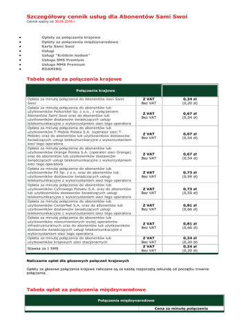 Szczegółowy cennik usług dla Abonentów Sami Swoi Cennik ważny od 30.04.2016 r. Opłaty za połączenia krajowe Opłaty za połączenia międzynarodowe Karty Sami Swoi Usługi Usługi "Krótkim kodem" Usługa SMS Premium Usługa MMS Premium ROAMING Tabela opłat za połączenia krajowe Połączenia krajowe Opłata za minutę połączenia do Abonentów sieci Sami Swoi Opłata za minutę połączenia do abonentów lub użytkowników Polkomtel Sp. z o.o., z wyłączeniem Abonentów Sami Swoi oraz do abonentów lub użytkowników dostawców świadczących usługi telekomunikacyjne z wykorzystaniem sieci tego operatora Opłata za minutę połączenia do abonentów lub użytkowników T-Mobile Polska S.A. (operator sieci TMobile) oraz do abonentów lub użytkowników dostawców świadczących usługi telekomunikacyjne z wykorzystaniem sieci tego operatora Opłata za minutę połączenia do abonentów lub użytkowników Orange Polska S.A. (operator sieci Orange) oraz do abonentów lub użytkowników dostawców świadczących usługi telekomunikacyjne z wykorzystaniem sieci tego operatora Opłata za minutę połączenia do abonentów lub użytkowników P4 Sp. z o.o. oraz do abonentów lub użytkowników dostawców świadczących usługi telekomunikacyjne z wykorzystaniem sieci tego operatora Opłata za minutę połączenia do abonentów lub użytkowników Cyfrowego Polsatu S.A. oraz do abonentów lub użytkowników dostawców świadczących usługi telekomunikacyjne z wykorzystaniem sieci tego operatora Opłata za minutę połączenia do abonentów lub użytkowników CenterNet S.A. oraz do abonentów lub użytkowników dostawców świadczących usługi telekomunikacyjne z wykorzystaniem sieci tego operatora Opłata za minutę połączenia do abonentów lub użytkowników niewymienionych wyżej operatorów infrastrukturalnych oraz do abonentów lub użytkowników dostawców świadczących usługi telekomunikacyjne z wykorzystaniem sieci tego operatora Opłata za minutę połączenia do abonentów lub użytkowników krajowych sieci stacjonarnych Stawka za 1 SMS Z VAT Bez VAT 0,24 zł (0,20 zł) Z VAT Bez VAT 0,67 zł (0,54 zł) Z VAT Bez VAT 0,67 zł (0,54 zł) Z VAT Bez VAT 0,67 zł (0,54 zł) Z VAT Bez VAT 0,73 zł (0,59 zł) Z VAT Bez VAT 0,73 zł (0,59 zł) Z VAT Bez VAT 0,81 zł (0,66 zł) Z VAT Bez VAT 0,81 zł (0,66 zł) Z VAT Bez VAT Z VAT Bez VAT 0,24 (0,20 0,24 (0,20 zł zł) zł zł) Naliczanie opłat dla głosowych połączeń krajowych Opłaty za głosowe połączenia krajowe naliczane są za każdą rozpoczętą sekundę od początku trwania połączenia. Tabela opłat za połączenia międzynarodowe Połączenia międzynarodowe Cena za minutę połączenia Z VAT Bez VAT Z VAT Bez VAT Z VAT Bez VAT Z VAT Bez VAT Z VAT Bez VAT Strefa międzynarodowa 1 Strefa międzynarodowa 2 Strefa międzynarodowa 3 Opłata za wysłanie 1 wiadomości SMS Opłata za wysłanie 1 wiadomości MMS 2,02 (1,64 4,03 (3,28 7,06 (5,74 0,62 (0,50 2,46 (2,00 zł zł) zł zł) zł zł) zł zł) zł zł) Opłaty za głosowe połączenia według podziału na Strefy międzynarodowe: Numer Strefy międzynarodowej 1 2 3 Kraj lub terytorium Albania, Algieria, Andora, Armenia, Austria, Azerbejdżan, Belgia, Białoruś, Bośnia i Hercegowina, Bułgaria, Chorwacja, Cypr, Czechy, Dania, Estonia, Finlandia, Francja, Gibraltar, Grecja, Gruzja, Hiszpania, Holandia, Irlandia, Islandia, Kazachstan, Kirgistan, Libia, Liechtenstein, Litwa, Luksemburg, Łotwa, Macedonia, Malta, Maroko, Mołdawia, Monako, Niemcy, Norwegia, Owcze (Wyspy), Portugalia, Rosja, Rumunia, San Marino, Serbia i Czarnogóra, Słowacja, Słowenia, Szwajcaria, Szwecja, Tadżykistan, Tunezja, Turcja, Turkmenistan, Ukraina, Uzbekistan, Watykan, Węgry, Wielka Brytania, Włochy. Alaska, Australia, Dziewicze Wyspy St. Zjedn., Ekwador, Gabon, Gujana Francuska, Gwadelupa, Gwatemala, Hawaje, Kanada, Martynika, Portoryko, Somalia, Stany Zjednoczone Ameryki Północnej, Wenezuela, Zjednoczone Emiraty Arabskie. Afganistan, Angola, Anguilla, Antigua i Barbuda, Antyle Holenderskie, Arabia Saudyjska, Argentyna, Aruba, Bahamy, Bahrajn, Bangladesz, Barbados, Belize, Benin, Bermudy, Bhutan, Boliwia, Botswana, Brazylia, Brunei, Burkina Faso, Burundi, Chile, Chiny, Cooka (Wyspy), Czad, Diego Garcia, Dominika, Dominikana, Dziewicze Wyspy Brytyjskie, Dżibuti, Egipt, Erytrea, Etiopia, Falklandy (Malwiny), Fidżi, Filipiny, Gambia, Ghana, Grenada, Grenlandia, Guam, Gujana, Gwinea, Gwinea Bissau, Gwinea Równikowa, Haiti, Honduras, Hongkong, Indie, Indonezja, Irak, Iran, Izrael, Jamajka, Japonia, Jemen, Jordania, Kajmany, Kambodża, Kamerun, Katar, Kenia, Kiribati, Kolumbia, Komory, Kongo, Kongo - Rep. Demokratyczna, Korea Południowa, Koreańska Rep. Lud.-Demokratyczna, Kostaryka, Kuba, Kuwejt, Laos, Lesotho, Liban, Liberia, Madagaskar, Makau, Malawi, Malediwy, Malezja, Mali, Mariany (Wyspy), Marshalla (Wyspy), Mauretania, Mauritius, Majotta, Meksyk, Mikronezja, Mongolia, Montserrat, Mozambik, Myanmar, Namibia, Nauru, Nepal, Niger, Nigeria, Nikaragua, Niue, Norfolk, Nowa Kaledonia, Nowa Zelandia, Oman, Pakistan, Palau, Palestyna, Panama, Papua (Nowa Gwinea), Paragwaj, Peru, Polinezja Francuska, Republika Południowej Afryki, Republika ŚrodkowoAfrykańska, Reunion, Rwanda, Saint Kitts i Nevis (Wyspy), Saint Lucia (Wyspa), Saint Vincent i Grenadyny (Wyspa), Salomona (Wyspy), Salwador, Samoa Amerykańskie, Samoa Zachodnie, Senegal, Seszele, Sierra Leone, Singapur, Sri Lanka, Sudan, Surinam, Suazi, Syria, Św. Heleny (Wyspa), Św. Piotra i Mikelona (Wyspy), Św. Tomasza i Książęca (Wyspa), Tajlandia, Tajwan, Tanzania, Timor Wschodni, Togo, Tokelau, Tonga, Trynidad i Tobago, Turks i Caicos, Tuvalu, Uganda, Urugwaj, Wallis i Futuna, Wietnam, Wniebowstąpienia (Wyspy), Wybrzeże Kości Słoniowej, Vanuatu, Zambia, Zielonego Przylądka (Wyspy), Zimbabwe. Naliczanie opłat dla głosowych połączeń międzynarodowych Opłaty za głosowe połączenia międzynarodowe naliczane są za 