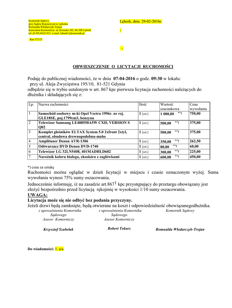 Komornik Sądowy przy Sądzie Rejonowym w Lęborku Romualda Włodarczyk-Trojan Kancelaria Komornicza ul. Kossaka 102, 84-300 Lębork tel. (0-59) 8622-915 e-mail: [email protected] Lębork, dnia 29-02-2016r. - Km 372/15 - OBWIESZCZENIE O LICYTACJI RUCHOMOŚCI Podaję do publicznej wiadomości, że w dniu 07-04-2016 o godz. 09:30 w lokalu: przy ul. Aleja Zwycięstwa 195/10, 81-521 Gdynia odbędzie się w trybie ustalonym w art. 867 kpc pierwsza licytacja ruchomości należących do dłużnika i składających się z: Lp. Nazwa ruchomości Ilość 1 Samochód osobowy m-ki Opel Vectra 1996r. nr rej. GLE18SE, poj.1799cm3, benzyna Telewizor Samsung LE408550A5W CXH, VERSION S Q02 Komplet głośników ELTAX System 5.0 2xfront 2xtył, central, obudowa drewnopodobna-maho Amplituner Denon AVR-1306 Odtwarzacz DVD Denon DVD-1740 Telewizor LG 32LN5408, 401MADHLD602 Narożnik koloru białego, ekoskóra z zagłówkami 2 3 4 5 6 7 1 [szt.] Wartość szacunkowa 1 000,00 **) Cena wywołania 750,00 1 [szt.] 500,00 **) 375,00 1 [szt.] 500,00 **) 375,00 1 [szt.] 1 [szt.] 1 [szt.] 1 [szt.] 350,00 80,00 300,00 600,00 **) 262,50 60,00 225,00 450,00 **) **) **) *) cena za sztukę Ruchomości można oglądać w dzień licytacji w miejscu i czasie oznaczonym wyżej. Suma wywołania wynosi 75% sumy oszacowania. Jednocześnie informuję, iż na zasadzie art.8671 kpc przystępujący do przetargu obowiązany jest złożyć bezpośrednio przed licytacją rękojmię w wysokości 1/10 sumy oszacowania. UWAGA: Licytacja może się nie odbyć bez podania przyczyny. Jeżeli drzwi będą zamknięte, będą otwierane na koszt i odpowiedzialność obowiązanegodłużnika. z upoważnienia Komornika Sądowego Asesor Komorniczy Krzysztof Szubelak Do wiadomości: 1. a/a z upoważnienia Komornika Sądowego Asesor Komorniczy Komornik Sądowy Robert Tokarz Romualda Włodarczyk-Trojan