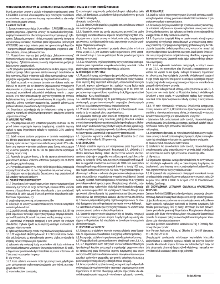 WARUNKI UCZESTNICTWA W IMPREZACH ORGANIZOWANYCH PRZEZ CENTRUM PODRÓŻY KOLIBER Przed zawarciem umowy o udziale w imprezie organizowanej przez b) wzrostu opłat urzędowych, podatków lub opłat należnych za takie C.P.KOLIBER, Uczestnik winien zapoznać się z niniejszymi warunkami usługi, jak lotniskowe, załadunkowe lub przeładunkowe w portach uczestnictwa oraz programem imprezy - opisem obiektu, stanowią- morskich i lotniczych; c) wzrostu kursów walut. cymi integralną część umowy. 3.2.2. W okresie 20 dni przed datą wyjazdu cena ustalona w umowie I. ZASADY OGÓLNE: 1. Zawarcie umowy pomiędzy Uczestnikiem i C.P.KOLIBER następuje nie może być podwyższona. poprzez podpisanie„Zgłoszenia-umowy” na zasadach określonych ni- 3.3.1. Uczestnik, może bez zgody organizatora przenieść na osobę niejszymi warunkami w obecności pracownika przyjmującego zgło- spełniającą warunki udziału w imprezie turystycznej wszystkie przyszenie. Zgłoszenie, program i niniejsze warunki stanowią integralne sługujące mu z tytułu umowy o świadczenie usług turystycznych części umowy zawieranej z Klientem przez Organizatora (którym jest uprawnienia, jeżeli jednocześnie osoba ta przejmuje wszystkie wyniCP KOLIBER) oraz w jego imieniu przez sieć upoważnionych Agentów kające z tej umowy obowiązki. - biur prowadzących sprzedaż imprez Organizatora w oparciu o usta- 3.3.2. Przeniesienie uprawnień i przejęcie obowiązków, o którym mowa w pkt 3.3.1, jest skuteczne wobec organizatora, jeżeli uczestlone odrębną umową pełnomocnictwo. 1.1. Uczestnikiem imprezy jest podpisujący „Zgłoszenie-umowę”. nik zawiadomi go o tym nie później niż 14 dni przed rozpoczęciem Uczestnik wskazuje osoby, które wraz z nim uczestniczą w imprezie imprezy turystycznej. turystycznej. Zgłoszenie-umowę za osobę niepełnoletnią podpisuje 3.3.3. Za nieuiszczoną część ceny imprezy turystycznej oraz koszty poniesione przez organizatora w wyniku w/w zmiany uczestnik i osoba jej ustawowy przedstawiciel. 1.2. W przypadku sprzedania wszystkich miejsc na daną imprezę, Orga- przejmująca jego uprawnienia odpowiadają solidarnie. nizator przyjmuje dalsze zgłoszenia zainteresowanych Uczestników na IV. OBOWIĄZKI UCZESTNIKA: listę rezerwową. Udział w imprezie osób z listy rezerwowej może nastą- 4.1. Uczestnik imprezy zobowiązany jest posiadać ważne dokumenty upoważniające do przekraczania granicy oraz dowód wpłaty należnopić jedynie w przypadku zwolnienia się miejsc na liście zasadniczej. 1.3. Jeżeli uczestnik w ustalonym terminie nie dokona wpłat na- ści za imprezę. Przy imprezach kolonijnych, obozach młodzieżowych leżności za imprezę lub nie dostarczy Organizatorowi wymaganych Uczestnik imprezy zobowiązany jest posiadać ważną legitymację dokumentów w podanym w umowie terminie Organizator może szkolną i dostarczyć do Organizatora najpóźniej na 14 dni przed rozwyznaczyć uczestnikowi odpowiedni dodatkowy termin z zagro- poczęciem imprezy prawidłowo wypełniony druk„Wypoczynek dzieci żeniem, iż w razie bezskutecznego upływu wyznaczonego terminu i młodzieży - Karta kwalifikacyjna”. będzie uprawniony do odstąpienia od umowy. W przypadku zmiany 4.2. Uczestnik zobowiązuje się do przestrzegania przepisów celnonazwiska, adresu, wymiany paszportu itp. Uczestnik zobowiązany dewizowych, paszportowo-wizowych i zwyczajów obowiązujących w Polsce, krajach tranzytowych oraz kraju docelowym. jest niezwłocznie powiadomić o tym Organizatora. 1.4. Organizator zobowiązuje się do świadczenia usług w sposób 4.3. W czasie trwania imprezy Uczestnik jest zobowiązany do stosozgodny z warunkami określonymi programem i przyjętymi w formie wania się do wskazówek pilota grupy i opiekuna. 4.4 Organizator zastrzega sobie prawo do odstąpienia od umowy na „Zgłoszenia-umowy”. warunkach rezygnacji z winy Uczestnika, jeżeli jej Uczestnik w trakcie II. WARUNKI PŁATNOŚCI: 2.1. Przy podpisaniu umowy, w terminie powyżej 30 dni do 180 dni trwania imprezy podejmuje zawinione działania pod wpływem alkohoprzed dniem rozpoczęcia imprezy turystycznej, uczestnik imprezy lu lub innych środków odurzających i tym samym utrudnia jej realizację. wpłaci na rzecz Organizatora zaliczkę w wysokości 25% ustalonej Wszelkie wynikłe z powyższego powodu dodatkowe, udokumentowane, koszty ponosi Uczestnik lub jego ustawowy przedstawiciel. ceny imprezy. 2.2. Jeżeli umowa zostanie podpisana w terminie wcześniejszym 4.5. Organizator ogranicza wielkość bagażu Uczestnika do 2 sztuk niż 180 dni przed dniem rozpoczęcia imprezy turystycznej, uczestnik o maksymalnej wadze do 20 kg na osobę. imprezy wpłaci na rzecz Organizatora zaliczkę w wysokości 25% usta- V. UBEZPIECZENIE: lonej ceny imprezy, w terminie ustalonym przez Strony, mieszczącym 5.1.Każdy uczestnik imprezy jest ubezpieczony przez Organizatora się w okresie powyżej 30 dni do 180 dni przed dniem rozpoczęcia w AXA Towarzystwo Ubezpieczeń i Reasekuracji S.A. ul.Chłodna 51 00-867 Warszawa. Rodzaj i zakres ubezpieczenia: ochrona ubezpieimprezy turystycznej. 2.3. Pozostała do zapłaty kwota, o ile nie zawarto pisemnie innych czeniowa obejmuje w przypadku wyjazdów zagranicznych: koszty lepostanowień, zostanie wpłacona w terminie pomiędzy 30 a 21 dniem czenia na kwotę do 10 000 euro, następstwa nieszczęśliwych wypadków na wypadek inwalidztwa na kwotę do 2000 euro, następstwa przed rozpoczęciem imprezy. 2.4. Przy podpisaniu umowy na mniej niż 30 dni przed datą rozpoczęcia nieszczęśliwych wypadków na wypadek śmierci na kwotę 1000 euro, imprezy Uczestnik wpłaci na rzecz Organizatora całą wartość umowy. oraz bagaż osobisty na kwotę do 200 euro. W przypadku imprez re2.5. Miejscem wpłaty jest siedziba Organizatora, jego przedstawiciel alizowanych w Polsce – ochrona ubezpieczeniowa obejmuje następstwa nieszczęśliwych wypadków na wypadek inwalidztwa i śmierci lub ustalony 