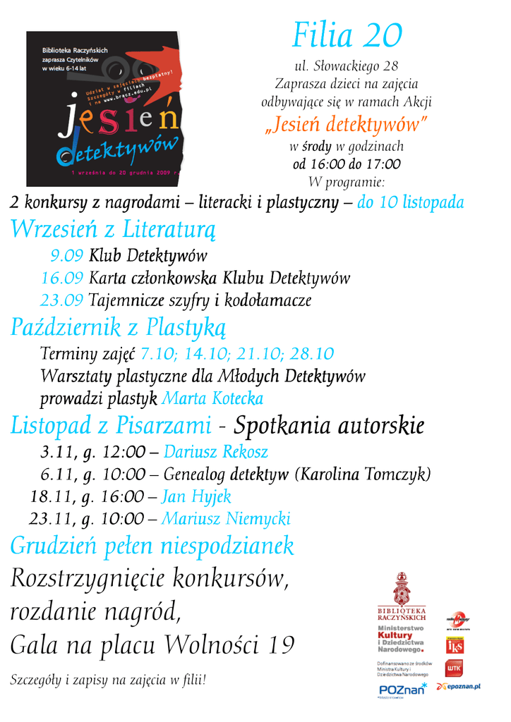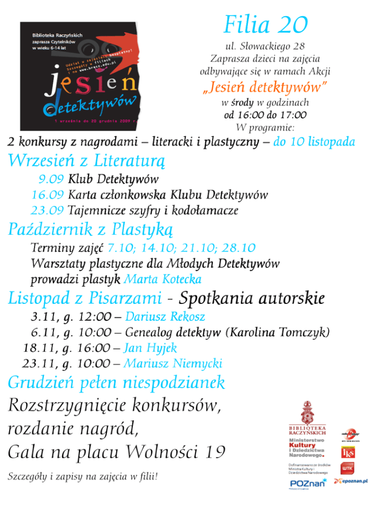 Filia 20 20 ul. Słowackiego 28 Zaprasza dzieci na zajęcia odbywające się w ramach Akcji „Jesień detektywów” w środy w godzinach od 16:00 16:00 do 17:00 17:00 W programie: 2 konkursy z nagrodami – literacki i plastyczny – do 10 listopada Wrzesień z Literaturą 9.09 Klub Detektywów 16.09 Karta członkowska Klubu Detektywów 23.09 Tajemnicze szyfry i kodołamacze Październik z Plastyką Terminy zajęć 7.10; 14.10; 21.10; 28.10 Warsztaty plastyczne dla Młodych Detektywów prowadzi plastyk Marta Kotecka Listopad z Pisarzami - Spotkania potkania autorskie 3.11, g. 12:00 – Dariusz Rekosz Rekosz 6.11, g. 10:00 – Genealog detektyw (Karolina Tomczyk) 18.11, g. 16:00 – Jan Hyjek 23.11, g. 10:00 – Mariusz Niemycki Grudzień pełen niespodzianek Rozstrzygnięcie konkursów, rozdanie nagród, Gala na placu Wolności 19 Szczegóły i zapisy na zajęcia w filii!