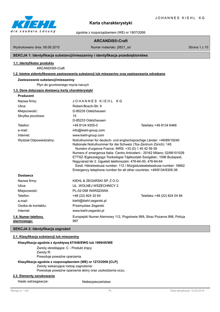 JOHANNES KIEHL KG Karta charakterystyki zgodnie z rozporządzeniem (WE) nr 1907/2006 ARCANDIS®-Craft Wydrukowano dnia: 08.06.2015 Strona 1 z 10 Numer materiału: j5621_sd SEKCJA 1: Identyfikacja substancji/mieszaniny i identyfikacja przedsiębiorstwa 1.1. Identyfikator produktu ARCANDIS®-Craft 1.2. Istotne zidentyfikowane zastosowania substancji lub mieszaniny oraz zastosowania odradzane Zastosowanie substancji/mieszaniny Płyn do gruntownego mycia naczyń 1.3. Dane dotyczące dostawcy karty charakterystyki Producent Nazwa firmy: Ulica: Miejscowość: Skrytka pocztowa: Telefon: e-mail: Internet: Wydział Odpowiedzialny: JOHANNES KIEHL Robert-Bosch-Str. 9 D-85235 Odelzhausen 15 D-85233 Odelzhausen +49 8134 9305-0 [email protected] KG Telefaks: +49 8134 6466 www.kiehl-group.com Notrufnummer für deutsch- und englischsprachige Länder: +49/89/19240 Nationale Notrufnummer für die Schweiz (Tox-Zentrum Zürich): 145 Numéro d'urgence France: INRS: +33 (0) 1 45 42 59 59 Numero d' emergenza Italia: Centro Antiveleni - 20162 Milano: 02/66101029 ETTSZ /Egészségügyi Toxikológiai Tájékoztató Szolgálat/, 1096 Budapest, Nagyvárad tér 2. Ügyeleti telefonszám: 476-64-00, 476-64-64 Eesti: Häirekeskuse number: 112 / Mürgistusteabekeskuse number: 16662 Emergency telephone number for all other countries: +49/8134/9305-36 Dostawca Nazwa firmy: Ulica: KIEHL & ZEGARSKI SP. Z O.O. UL. WOLNEJ WSZECHNICY 3 Miejscowość: PL-02-098 WARSZAWA Telefon: +48 (22) 824 32 64 e-mail: Osoba do kontaktu: [email protected] Przemyslaw Zegarski Internet: www.kiehl-zegarski.pl 1.4. Numer telefonu alarmowego: Telefaks: +48 (22) 824 04 84 Europejski Numer Alarmowy 112, Pogotowie 999, Straz Pozarna 998, Policja 997 SEKCJA 2: Identyfikacja zagrożeń 2.1. Klasyfikacja substancji lub mieszaniny Klasyfikacja zgodnie z dyrektywą 67/548/EWG lub 1999/45/WE Zwroty określające: C - Produkt żrący Zwroty R: Powoduje poważne oparzenia. Klasyfikacja zgodnie z rozporządzeniem (WE) nr 1272/2008 [CLP] Zwroty wskazujące rodzaj zagrożenia: Powoduje poważne oparzenia skóry oraz uszkodzenia oczu. 2.2. Elementy oznakowania Hasło ostrzegawcze: Wersja nr: 1,04 Niebezpieczeństwo PL Data aktualizacji: 12.03.2014 JOHANNES KIEHL KG Karta charakterystyki zgodnie z rozporządzeniem (WE) nr 1907/2006 ARCANDIS®-Craft Wydrukowano dnia: 08.06.2015 Strona 2 z 10 Numer materiału: j5621_sd GHS05 Piktogram: Zwroty wskazujące rodzaj zagrożenia H314 Powoduje poważne oparzenia skóry oraz uszkodzenia oczu. Zwroty wskazujące środki ostrożności P280 Stosować rękawice ochronne/odzież ochronną/ochronę oczu/ochronę twarzy. P305+P351+P338 W PRZYPADKU DOSTANIA SIĘ DO OCZU: Ostrożnie płukać wodą przez kilka minut. Wyjąć soczewki kontaktowe, jeżeli są i można je łatwo usunąć. Nadal płukać. P308+P313 W przypadku narażenia lub styczności: Zasięgnąć porady/zgłosić się pod opiekę lekarza. 2.3. Inne zagrożenia Nieznane. SEKCJA 3: Skład/informacja o składnikach (zgodnie z 648/2004/EG) 3.2. Mieszaniny Charakterystyka chemiczna Zasady, Dodatki Składniki niebezpieczne Nr WE Nr CAS Nr Index Nr REACH Nazwa chemiczna Ilość Klasyfikacja zgodnie z 67/548/EWG Klasyfikacja zgodnie z rozporządzeniem (WE) nr 1272/2008 [CLP] 215-185-5 wodorotlenek sodu 1310-73-2 C - Produkt żrący R35 011-002-00-6 Skin Corr. 1A; H314 35 - < 40 % Wydźwięk zwroty R, H i EUH: patrz sekcja 16. SEKCJA 4: Środki pierwszej pomocy 4.1. Opis środków pierwszej pomocy Wskazówki ogólne Unikać kontaktu ze skórą i oczami. W przypadku wdychania brak niebezpieczeństwa przy wdychaniu W przypadku kontaktu ze skórą Natychmiast zmyć mydłem z dużą ilością wody. Natychmiast zdjąć skażone ubranie. W przypadku kontaktu z oczami Płukać starannie dużą ilością wody, również pod powiekami. Jeśli podrażnienie oczu utrzymuje się, skonsultować się ze specjalistą. W przypadku połknięcia Przemyć usta wodą i następnie wypić dużą ilość wody. Jeśli to możliwe nie dopuścić do wymiotów. Zasięgnąć porady medycznej. Wersja nr: 1,04 PL Data aktualizacji: 12.03.2014 JOHANNES KIEHL KG Karta charakterystyki zgodnie z rozporządzeniem (WE) nr 1907/2006 ARCANDIS®-Craft Wydrukowano dnia: 08.06.2015 Strona 3 z 10 Numer materiału: j5621_sd 4.2. Najważniejsze ostre i opóźnione objawy oraz skutki narażenia Informacje te nie są dostępne. 4.3. Wskazania dotyczące wszelkiej natychmiastowej pomocy lekarskiej i szczególnego postępowania z poszkodowanym Przedstawić lekarzowi dołączoną Kartę Charakterystyki Substancji Niebezpiecznej. SEKCJA 5: Postępowanie w przypadku pożaru 5.1. Środki gaśnicze Odpowiednie środki gaśnicze W przypadku pożaru dopuszcza się użycie wszelkich środków przeciwpożarowych. 5.2. Szczególne zagrożenia związane z substancją lub mieszaniną Informacje te nie są dostępne. 5.3. Informacje dla straży pożarnej Użycie środków gaśniczych odpowiednich dla lokalnych warunków i dla środowiska. Produkt niepalny. SEKCJA 6: Postępowanie w przypadku niezamierzonego uwolnienia do środowiska 6.1. Indywidualne środki ostrożności, wyposażenie ochronne i procedury w sytuacjach awaryjnych Unikać kontaktu ze skórą, oczami i ubraniem. 6.2. Środki ostrożności w zakresie ochrony środowiska Nie wylewać do wód powierzchniowych. 6.3. Metody i materiały zapobiegające rozprzestrzenianiu się skażenia i służące do usuwania skażenia Zebrać razem z materiałem wchłaniającym (np. szmaty, włoknina). Spłukać dużą ilością wody. Zebranych wycieków nigdy nie przechowywać w oryginalnych pojemnikach do ponownego użycia. 6.4. Odniesienia do innych sekcji Sprawdź środki ochronne w sekcjach 7 i 8. SEKCJA 7: Postępowanie z substancjami i mieszaninami oraz ich magazynowanie 7.1. Środki ostrożności dotyczące bezpiecznego postępowania Wskazówki odnośnie bezpiecznego obchodzenia się z substancją Unikać kontaktu ze skórą i oczami. Wskazówki na wypadek pożaru i wybuchu Brak s