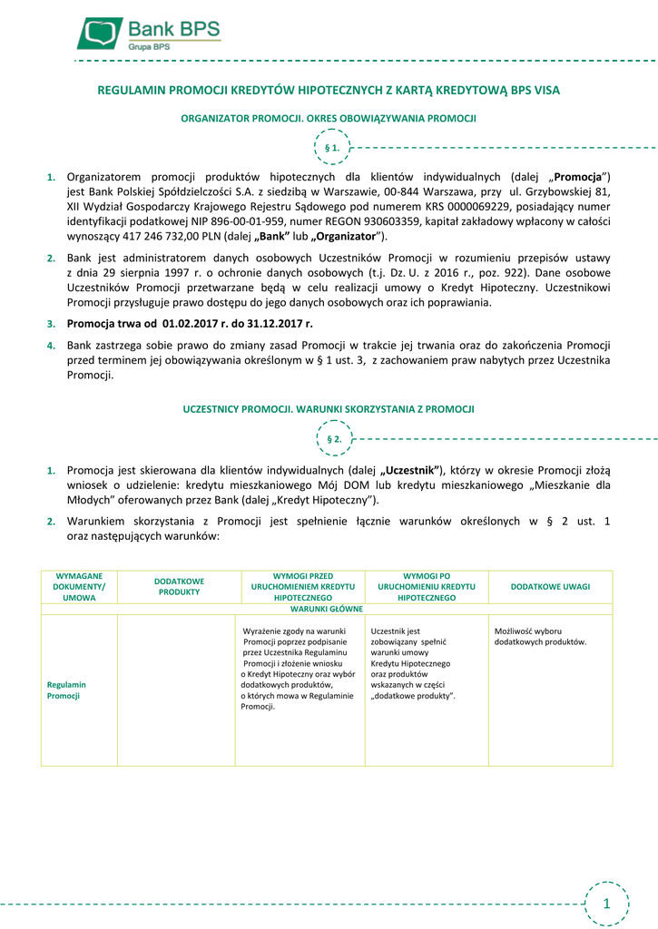 REGULAMIN PROMOCJI KREDYTÓW HIPOTECZNYCH Z KARTĄ KREDYTOWĄ BPS VISA ORGANIZATOR PROMOCJI. OKRES OBOWIĄZYWANIA PROMOCJI § 1. 1. Organizatorem promocji produktów hipotecznych dla klientów indywidualnych (dalej „Promocja”) jest Bank Polskiej Spółdzielczości S.A. z siedzibą w Warszawie, 00-844 Warszawa, przy ul. Grzybowskiej 81, XII Wydział Gospodarczy Krajowego Rejestru Sądowego pod numerem KRS 0000069229, posiadający numer identyfikacji podatkowej NIP 896-00-01-959, numer REGON 930603359, kapitał zakładowy wpłacony w całości wynoszący 417 246 732,00 PLN (dalej „Bank” lub „Organizator”). 2. Bank jest administratorem danych osobowych Uczestników Promocji w rozumieniu przepisów ustawy z dnia 29 sierpnia 1997 r. o ochronie danych osobowych (t.j. Dz. U. z 2016 r., poz. 922). Dane osobowe Uczestników Promocji przetwarzane będą w celu realizacji umowy o Kredyt Hipoteczny. Uczestnikowi Promocji przysługuje prawo dostępu do jego danych osobowych oraz ich poprawiania. 3. Promocja trwa od 01.02.2017 r. do 31.12.2017 r. 4. Bank zastrzega sobie prawo do zmiany zasad Promocji w trakcie jej trwania oraz do zakończenia Promocji przed terminem jej obowiązywania określonym w § 1 ust. 3, z zachowaniem praw nabytych przez Uczestnika Promocji. UCZESTNICY PROMOCJI. WARUNKI SKORZYSTANIA Z PROMOCJI § 2. 1. Promocja jest skierowana dla klientów indywidualnych (dalej „Uczestnik”), którzy w okresie Promocji złożą wniosek o udzielenie: kredytu mieszkaniowego Mój DOM lub kredytu mieszkaniowego „Mieszkanie dla Młodych” oferowanych przez Bank (dalej „Kredyt Hipoteczny”). 2. Warunkiem skorzystania z Promocji jest spełnienie łącznie warunków określonych w § 2 ust. 1 oraz następujących warunków: WYMAGANE DOKUMENTY/ UMOWA Regulamin Promocji DODATKOWE PRODUKTY WYMOGI PRZED URUCHOMIENIEM KREDYTU HIPOTECZNEGO WARUNKI GŁÓWNE Wyrażenie zgody na warunki Promocji poprzez podpisanie przez Uczestnika Regulaminu Promocji i złożenie wniosku o Kredyt Hipoteczny oraz wybór dodatkowych produktów, o których mowa w Regulaminie Promocji. WYMOGI PO URUCHOMIENIU KREDYTU HIPOTECZNEGO Uczestnik jest zobowiązany spełnić warunki umowy Kredytu Hipotecznego oraz produktów wskazanych w części „dodatkowe produkty”. DODATKOWE UWAGI Możliwość wyboru dodatkowych produktów. 1 złożenie w Banku kompletnego wniosku o udzielenie Kredytu Hipotecznego wraz z kompletem wymaganych dokumentów. Wniosek o Kredyt Hipoteczny Umowa ramowa o prowadzenie rachunku wraz z dostępem do: bankowości elektronicznej karty debetowej (zaznaczyć wybraną opcję) iKonto wraz z: (zaznaczyć wybraną opcję) kartą debetową dostępem do bankowości elektronicznej Podpisanie Umowy ramowej o prowadzenie rachunku do wybranego typu rachunku ROR wraz z kartą debetową i dostępem do bankowości elektronicznej wygodneKonto wraz z: Nie dotyczy. Opłata za prowadzenie rachunku typu ROR zgodnie z aktualnie obowiązującą Taryfą Opłat i Prowizji Banku BPS S.A. Opłata za prowadzenie rachunku typu ROR zgodnie z aktualnie obowiązującą Taryfą Opłat i Prowizji Banku BPS S.A. (zaznaczyć wybraną opcję) kartą debetową dostępem do bankowości elektronicznej VIPKonto wraz z: Opłata za prowadzenie rachunku typu ROR zgodnie z aktualnie obowiązującą Taryfą Opłat i Prowizji Banku BPS S.A. (zaznaczyć wybraną opcję) kartą debetową dostępem do bankowości elektronicznej Umowa o kartę kredytową BPS VISA (zaznaczyć wybraną opcję) VISA Credit VISA Gold Karta kredytowa BPS VISA Złożenie wniosku o kartę kredytową z limitem: - min. 1 000 PLN ( VISA Credit ) - min. 5 000 PLN ( VISA Gold) Podpisanie Umowy o kartę kredytową. Wniosek musi być złożony w Placówce Banku w terminie obowiązywania Promocji. Aktywacja karty kredytowej BPS VISA w terminie 30 dni od daty uruchomienia Kredytu lub wypłaty pierwszej transzy Kredytu Hipotecznego. Aktywacja karty debetowej do wybranego rachunku typu ROR oraz dostępu do bankowości elektronicznej w terminie 30 dni od daty uruchomienia Kredytu lub wypłaty pierwszej transzy Kredytu Hipotecznego. Ostateczna wysokość limitu karty zależy od zdolności kredytowej, nie więcej niż 50 000 PLN. O wysokości limitu karty kredytowej Uczestnik Promocji zostanie poinformowany przed podpisaniem Umowy a wysokość limitu będzie zawarta w Umowie karty kredytowej. Brak zdolności kredytowej Uczestnika na dodatkowy produkt kredytowy – kartę kredytową BPS VISA jest powodem odmowy udzielenia Kredytu Hipotecznego w niniejszej Promocji. 0 PLN prowizji za obsługę nowo otwartej karty kredytowej BPS VISA w pierwszym roku trwania Umowy karty kredytowej, pod warunkiem dokonania transakcji kartą o wartości określonej w aktualnie obowiązującej Taryfie Opłat i Prowizji Banku BPS S.A. W kolejnych latach obowiązują opłaty i prowizje zgodne z obowiązującą Taryfą Opłat i Prowizji Banku BPS S.A. Oprocentowanie karty kredytowej zgodne z aktualnie obowiązującą Tabelą Oprocentowania Banku BPS S.A. 2 Zawarcie umowy ubezpieczenia nieruchomości od ognia i innych zdarzeń losowych oferowanego przez Towarzystwo Ubezpieczeniowe współpracujące Bankiem BPS S.A. Podpisanie Umowy Kredytu Hipotecznego, zawierającego informacje o obowiązku zawarcia przez Uczestnika umowy ubezpieczenia nieruchomości od ognia i innych zdarzeń oferowanego przez Towarzystwo Ubezpieczeniowe współpracujące z Bankiem BPS S.A. Nie rozwiązywanie umowy ubezpieczenia nieruchomości od ognia i innych zdarzeń losowych oferowanego przez Towarzystwo Ubezpieczeniowe współpracujące z Bankiem BPS S.A. przez cały okres trwania Umowy Kredytu Hipotecznego. Składki ubezpieczeniowe zgodnie z obowiązującą taryfą ubezpieczenia nieruchomości od ognia i innych zdarzeń losowych oferowanego przez Towarzystwo Ubezpieczeniowe współpracujące z Bankiem BPS S.A. WARUNKI DODATKOWE - FAKULTATYWNE Zawarcie umowy ubezpieczenia na życie oferowanego przez Wielkopolskie Towarzystwo Ubezpie