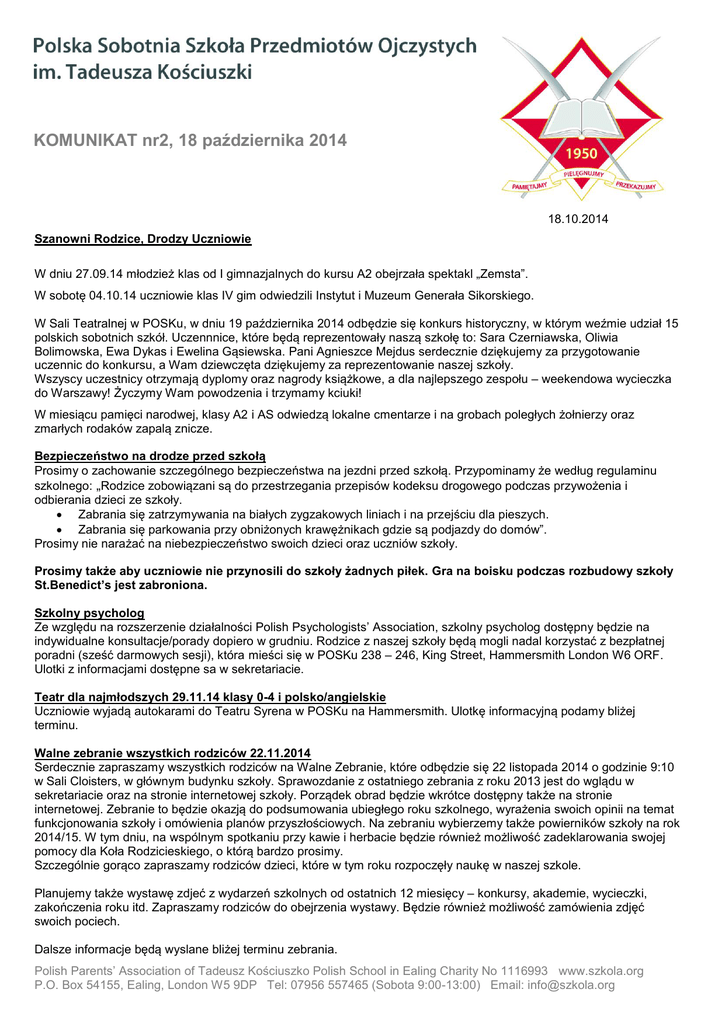 KOMUNIKAT nr2, 18 października 2014 18.10.2014 Szanowni Rodzice, Drodzy Uczniowie W dniu 27.09.14 młodzież klas od I gimnazjalnych do kursu A2 obejrzała spektakl „Zemsta”. W sobotę 04.10.14 uczniowie klas IV gim odwiedzili Instytut i Muzeum Generała Sikorskiego. W Sali Teatralnej w POSKu, w dniu 19 października 2014 odbędzie się konkurs historyczny, w którym weźmie udział 15 polskich sobotnich szkół. Uczennnice, które będą reprezentowały naszą szkołę to: Sara Czerniawska, Oliwia Bolimowska, Ewa Dykas i Ewelina Gąsiewska. Pani Agnieszce Mejdus serdecznie dziękujemy za przygotowanie uczennic do konkursu, a Wam dziewczęta dziękujemy za reprezentowanie naszej szkoły. Wszyscy uczestnicy otrzymają dyplomy oraz nagrody książkowe, a dla najlepszego zespołu – weekendowa wycieczka do Warszawy! Życzymy Wam powodzenia i trzymamy kciuki! W miesiącu pamięci narodwej, klasy A2 i AS odwiedzą lokalne cmentarze i na grobach poległych żołnierzy oraz zmarłych rodaków zapalą znicze. Bezpieczeństwo na drodze przed szkołą Prosimy o zachowanie szczególnego bezpieczeństwa na jezdni przed szkołą. Przypominamy że według regulaminu szkolnego: „Rodzice zobowiązani są do przestrzegania przepisów kodeksu drogowego podczas przywożenia i odbierania dzieci ze szkoły. Zabrania się zatrzymywania na białych zygzakowych liniach i na przejściu dla pieszych. Zabrania się parkowania przy obniżonych krawężnikach gdzie są podjazdy do domów”. Prosimy nie narażać na niebezpieczeństwo swoich dzieci oraz uczniów szkoły. Prosimy także aby uczniowie nie przynosili do szkoły żadnych piłek. Gra na boisku podczas rozbudowy szkoły St.Benedict’s jest zabroniona. Szkolny psycholog Ze względu na rozszerzenie działalności Polish Psychologists’ Association, szkolny psycholog dostępny będzie na indywidualne konsultacje/porady dopiero w grudniu. Rodzice z naszej szkoły będą mogli nadal korzystać z bezpłatnej poradni (sześć darmowych sesji), która mieści się w POSKu 238 – 246, King Street, Hammersmith London W6 ORF. Ulotki z informacjami dostępne sa w sekretariacie. Teatr dla najmłodszych 29.11.14 klasy 0-4 i polsko/angielskie Uczniowie wyjadą autokarami do Teatru Syrena w POSKu na Hammersmith. Ulotkę informacyjną podamy bliżej terminu. Walne zebranie wszystkich rodziców 22.11.2014 Serdecznie zapraszamy wszystkich rodziców na Walne Zebranie, które odbędzie się 22 listopada 2014 o godzinie 9:10 w Sali Cloisters, w głównym budynku szkoły. Sprawozdanie z ostatniego zebrania z roku 2013 jest do wglądu w sekretariacie oraz na stronie internetowej szkoły. Porządek obrad będzie wkrótce dostępny także na stronie internetowej. Zebranie to będzie okazją do podsumowania ubiegłego roku szkolnego, wyrażenia swoich opinii na temat funkcjonowania szkoły i omówienia planów przyszłościowych. Na zebraniu wybierzemy także powierników szkoły na rok 2014/15. W tym dniu, na wspólnym spotkaniu przy kawie i herbacie będzie również możliwość zadeklarowania swojej pomocy dla Koła Rodzicieskiego, o którą bardzo prosimy. Szczególnie gorąco zapraszamy rodziców dzieci, które w tym roku rozpoczęły naukę w naszej szkole. Planujemy także wystawę zdjeć z wydarzeń szkolnych od ostatnich 12 miesięcy – konkursy, akademie, wycieczki, zakończenia roku itd. Zapraszamy rodziców do obejrzenia wystawy. Będzie również możliwość zamówienia zdjęć swoich pociech. Dalsze informacje będą wyslane bliżej terminu zebrania. Polish Parents’ Association of Tadeusz Kościuszko Polish School in Ealing Charity No 1116993 www.szkola.org P.O. Box 54155, Ealing, London W5 9DP Tel: 07956 557465 (Sobota 9:00-13:00) Email: [email protected] Komunikat / październik 2014 Informacje o uczniach specjalnej troski Prosimy rodziców, którzy mają dzieci specjalnej troski (z potrzebami medycznymi lub edukacyjnymi), a nie zgłosili jeszcze tego w tym roku szkolnym, o przekazanie niezbędnych informacji do sekretariatu szkoły lub na adres korespondencyjny: [email protected] Football Academy Football Academy to elitarna sieć szkółek piłkarskich dla dzieci w wieku od 4 do 12 lat bazująca na angielskich rozwiązaniach treningowych i organizacyjnych, realizowana przez polskich trenerów i managerów. Więcej informacji znajdziecie Państwo na :www.footballacademy.pl , www.fauk.pl Kontakt z managerem Football Academy UK, tel: 07809666527, [email protected] Zapisy i opłaty na egzaminy GCSE, AS oraz A2 Uczniowie przystępujący do egzaminu GCSE Polish w lecie 2015 (uczniowie z klas IV gim) oraz uczniowie klas AS i A2 otrzymają w listopadzie formularz, który należy wypełnić i oddać do administracji do dnia 13.12.14. Prosimy rodziców o dopilnowanie zwrotu formularza na czas, ponieważ nie będziemy przyjmować zgłoszeń na egzaminy po wyznaczonym terminie. Dzienniczek ucznia Dzienniczek tworzy sposób regularnej komunikacji między nauczycielem a rodzicami. Prosimy rodziców o sprawdzanie i podpisywanie dzienniczka co tydzień. Można w nim wpisywać usprawiedliwienia i uwagi do nauczyciela np. na temat pracy domowej itp. Jeżeli uczeń zgubi dzienniczek, to należy zakupić nowy w sekretariacie szkoły. Koszt £2.00. Rzeczy znalezione Prosimy rodziców dzieci o podpisanie kurtek oraz pudełek/torebek śniadaniowych nazwiskiem dziecka. Dziecko powinno również wpisać swoje imię do każdego zeszytu oraz do swojego dzienniczka. Rzeczy znalezione można odebrać w sekretariacie szkoły. Ferie jesienne 01.11.14 Zawiadamiamy, że ferie jesienne to tylko jedna wolna sobota! Wracamy do szkoły 08.11.14. Akademia z okazji święta 11 listopada W sobotę 15.11.14 uczcimy akademią Narodowe Święto 11 listopada. Program zaprezentują klasy szóste. Serdecznie zapraszamy do obejrzenia. Internetowa szkoła języka angielskiego dla rodziców Wszelkie informacje znajdziecie Państwo pod linkiem http://angielskionline.net Dyżury Przypominamy wszyst