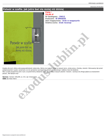 Informacje o produkcie Utworzono 07-03-2017 Potwór w szafie. Jak jutro bać się mniej niż dzisiaj Cena : 24,84 zł .lu bl in .p l Nr katalogowy : 29012 Producent : W DRODZE Stan magazynowy : brak w magazynie Średnia ocena : brak recenzji od us Książka dla tych, którzy odczuwają jakikolwiek rodzaj lęku. Boimy się nagłych zmian w naszym życiu, utraty pracy, choroby, starości. Odczuwamy lęk przed podejmowaniem ryzyka i przed tym, że nie sprostamy wymaganiom. Strach nas paraliżuje i odbiera chęć do działania. Max Lucado przypomina nam o tym, że powinniśmy odważnie dążyć do realizacji naszych planów i marzeń, i zachęca do ufnego pójścia za wezwaniem Jezusa: „Nie lękajcie się!”. ex Oprawa: format: 145x205, ss. 211, opr. broszurowa ISBN: 83-7033-750-6 Wygenerowano w programie www.oscGold.com