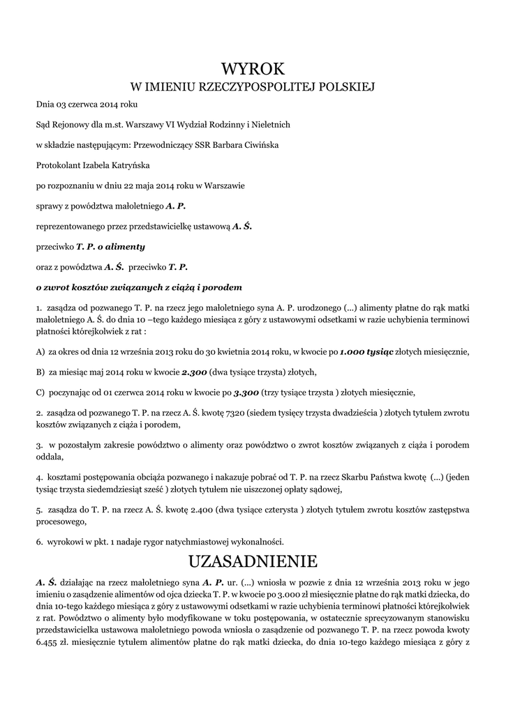 WYROK W IMIENIU RZECZYPOSPOLITEJ POLSKIEJ Dnia 03 czerwca 2014 roku Sąd Rejonowy dla m.st. Warszawy VI Wydział Rodzinny i Nieletnich w składzie następującym: Przewodniczący SSR Barbara Ciwińska Protokolant Izabela Katryńska po rozpoznaniu w dniu 22 maja 2014 roku w Warszawie sprawy z powództwa małoletniego A. P. reprezentowanego przez przedstawicielkę ustawową A. Ś. przeciwko T. P. o alimenty oraz z powództwa A. Ś. przeciwko T. P. o zwrot kosztów związanych z ciążą i porodem 1. zasądza od pozwanego T. P. na rzecz jego małoletniego syna A. P. urodzonego (...) alimenty płatne do rąk matki małoletniego A. Ś. do dnia 10 –tego każdego miesiąca z góry z ustawowymi odsetkami w razie uchybienia terminowi płatności którejkolwiek z rat : A) za okres od dnia 12 września 2013 roku do 30 kwietnia 2014 roku, w kwocie po 1.000 tysiąc złotych miesięcznie, B) za miesiąc maj 2014 roku w kwocie 2.300 (dwa tysiące trzysta) złotych, C) poczynając od 01 czerwca 2014 roku w kwocie po 3.300 (trzy tysiące trzysta ) złotych miesięcznie, 2. zasądza od pozwanego T. P. na rzecz A. Ś. kwotę 7320 (siedem tysięcy trzysta dwadzieścia ) złotych tytułem zwrotu kosztów związanych z ciąża i porodem, 3. w pozostałym zakresie powództwo o alimenty oraz powództwo o zwrot kosztów związanych z ciąża i porodem oddala, 4. kosztami postępowania obciąża pozwanego i nakazuje pobrać od T. P. na rzecz Skarbu Państwa kwotę (...) (jeden tysiąc trzysta siedemdziesiąt sześć ) złotych tytułem nie uiszczonej opłaty sądowej, 5. zasądza do T. P. na rzecz A. Ś. kwotę 2.400 (dwa tysiące czterysta ) złotych tytułem zwrotu kosztów zastępstwa procesowego, 6. wyrokowi w pkt. 1 nadaje rygor natychmiastowej wykonalności. UZASADNIENIE A. Ś. działając na rzecz małoletniego syna A. P. ur. (...) wniosła w pozwie z dnia 12 września 2013 roku w jego imieniu o zasądzenie alimentów od ojca dziecka T. P. w kwocie po 3.000 zł miesięcznie płatne do rąk matki dziecka, do dnia 10-tego każdego miesiąca z góry z ustawowymi odsetkami w razie uchybienia terminowi płatności którejkolwiek z rat. Powództwo o alimenty było modyfikowane w toku postępowania, w ostatecznie sprecyzowanym stanowisku przedstawicielka ustawowa małoletniego powoda wniosła o zasądzenie od pozwanego T. P. na rzecz powoda kwoty 6.455 zł. miesięcznie tytułem alimentów płatne do rąk matki dziecka, do dnia 10-tego każdego miesiąca z góry z ustawowymi odsetkami w razie uchybienia terminowi płatności którejkolwiek z rat (pismo z 14.05.2014 r. k. 324). Zdaniem A. Ś. pozwany T. P. powinien w ¾ ponosić koszty utrzymania małoletniego A. . A. Ś. działając w imieniu własnym wniosła 04.03.2014 roku o zasądzenie od pozwanego na jej rzecz kwoty 11.500 zł tytułem pokrycia wydatków związanych z ciążą i porodem oraz pokrycia kosztów utrzymania matki dziecka w okresie porodu. T. P. w odpowiedzi na pozew wniósł o oddalenie powództwa o alimenty ponad kwotę 1.500 zł miesięcznie oraz o oddalenie powództwa w zakresie kwoty 11.500 zł tytułem pokrycia wydatków związanych z ciążą i porodem oraz pokrycia kosztów utrzymania matki dziecka w okresie porodu. Sąd Rejonowy ustalił następujący stan faktyczny : Małoletni A. P. urodził się (...) w W. z nieformalnego związku (...). A. Ś.ma 29 lat, jest panną, z wykształcenia jest lekarzem stomatologiem. Zatrudniona była od 01.02.2011 roku w gabinecie stomatologicznym pozwanego „(...)” mającym siedzibę w U., na czas nieokreślony. Jej wynagrodzenie wynosiło oficjalnie brutto najpierw 1.500 złotych miesięcznie (k.80), a od 01.09.2012 roku brutto 5.700 złotych miesięcznie (k.81). A. Ś.ukończyła kurs „ochrona radiologiczna pacjenta w rentgenodiagnostyce” (k.82). Po urodzeniu dziecka przebywała na urlopie macierzyńskim i pobierała zasiłek najpierw w wysokości ok. 3.400 złotych miesięcznie, później w wysokości ok. 2.000 złotych miesięcznie. Od połowy września 2013 roku podjęła własną działalność gospodarczą „A. Ś.usługi stomatologiczne” – praktyka lekarska dentystyczna (k.83). Współpracuje obecnie z gabinetem (...)w P., oraz z drugim gabinetem (...)w W.. Jej zarobki netto z tej działalności wynoszą miesięcznie około 5.000 złotych (k.224 ). W zeznaniach podatkowych za 2013 rok wykazała dochód 66.899 zł. (k.298). Rozpoczęła też niedawno studia doktoranckie z ortodoncji, za praktykę w ortodoncji obsługuje dziennie 2-3 pacjentów bezpłatnie. A. Ś.pochodzi z Z., gdzie mieszkają jej rodzice. Mieszka w W.we własnym mieszkaniu zakupionym w 2013 roku na kredyt, wzięty w wysokości 299.940 zł. (k.204) gdzie koszty utrzymania mieszkania wynoszą ok. 800 złotych zaś miesięczna rata kredytu wynosi 1.400 złotych. Posiada samochód marki V. (...)o wartości ok. 17.000 złotych. A. Ś. poniosła szereg kosztów związanych z urodzeniem dziecka, w tym zakupiła : 1) wózek z fotelikiem samochodowym o wartości 3.900 zł (k. 41), 2) pieluchy ekologiczne o wartości 400 zł (k.18), 3) ubranka i pościel dla dziecka, koszt ok. 700 zł (k.16,17), 4) łóżeczko z materacem ok. 700 złotych, 5) leżaczek o wartości 120 zł (k.42), 6) laktator, butelki, smoczki, inhalator łącznie ok. 500 złotych. Opłaciła też koszt pomocy opiekunki w wysokości 1.000 zł, która pomagała jej w opiece przy dziecku po porodzie, bowiem sama była po cesarskim cięciu. Te koszty wyniosły łącznie 7320 złotych. Na opiekę medyczną ponadto w okresie porodu wydała 3.600 zł z czego kwotę 1.000 zł wyniosły badania i leki (paragony k. 44-46), 1.400 zł wizyty lekarskie i 1.200 zł trzykrotne badanie USG (brak faktur). Badania w okresie ciąży były niezbędne, gdyż wystąpiło podejrzenie wystąpienia u dziecka zespołu (...). Ponadto w okresie ciąży A. Ś. zachorowała na zapalenie oskrzeli i konieczne były wizyty u lekarza rodzinnego (dowód: paragony fiskalne k. 44-46). Koszty utr