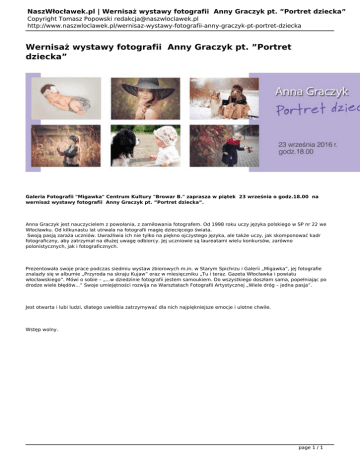 NaszWłocławek.pl | Wernisaż wystawy fotografii Anny Graczyk pt. ”Portret dziecka” Copyright Tomasz Popowski [email protected] http://www.naszwloclawek.pl/wernisaz-wystawy-fotografii-anny-graczyk-pt-portret-dziecka Wernisaż wystawy fotografii Anny Graczyk pt. ”Portret dziecka” Galeria Fotografii "Migawka" Centrum Kultury "Browar B." zaprasza w piątek 23 września o godz.18.00 na wernisaż wystawy fotografii Anny Graczyk pt. ”Portret dziecka”. Anna Graczyk jest nauczycielem z powołania, z zamiłowania fotografem. Od 1998 roku uczy języka polskiego w SP nr 22 we Włocławku. Od kilkunastu lat utrwala na fotografii magię dziecięcego świata. Swoją pasją zaraża uczniów. Uwrażliwia ich nie tylko na piękno ojczystego języka, ale także uczy, jak skomponować kadr fotograficzny, aby zatrzymał na dłużej uwagę odbiorcy. Jej uczniowie są laureatami wielu konkursów, zarówno polonistycznych, jak i fotograficznych. Prezentowała swoje prace podczas siedmiu wystaw zbiorowych m.in. w Starym Spichrzu i Galerii „Migawka”, jej fotografie znalazły się w albumie „Przyroda na skraju Kujaw” oraz w miesięczniku „Tu i teraz. Gazeta Włocławka i powiatu włocławskiego”. Mówi o sobie – „...w dziedzinie fotografii jestem samoukiem. Do wszystkiego doszłam sama, popełniając po drodze wiele błędów...” Swoje umiejętności rozwija na Warsztatach Fotografii Artystycznej „Wiele dróg – jedna pasja”. Jest otwarta i lubi ludzi, dlatego uwielbia zatrzymywać dla nich najpiękniejsze emocje i ulotne chwile. Wstęp wolny. page 1 / 1