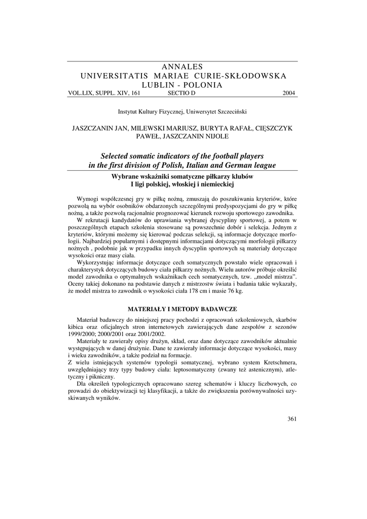 ANNALES UNIVERSITATIS MARIAE CURIE-SKŁODOWSKA LUBLIN - POLONIA VOL.LIX, SUPPL. XIV, 161 SECTIO D 2004 Instytut Kultury Fizycznej, Uniwersytet Szczeciński JASZCZANIN JAN, MILEWSKI MARIUSZ, BURYTA RAFAŁ, CIĘSZCZYK PAWEŁ, JASZCZANIN NIJOLE Selected somatic indicators of the football players in the first division of Polish, Italian and German league Wybrane wskaźniki somatyczne piłkarzy klubów I ligi polskiej, włoskiej i niemieckiej Wymogi współczesnej gry w piłkę nożną, zmuszają do poszukiwania kryteriów, które pozwolą na wybór osobników obdarzonych szczególnymi predyspozycjami do gry w piłkę nożną, a także pozwolą racjonalnie prognozować kierunek rozwoju sportowego zawodnika. W rekrutacji kandydatów do uprawiania wybranej dyscypliny sportowej, a potem w poszczególnych etapach szkolenia stosowane są powszechnie dobór i selekcja. Jednym z kryteriów, którymi możemy się kierować podczas selekcji, są informacje dotyczące morfologii. Najbardziej popularnymi i dostępnymi informacjami dotyczącymi morfologii piłkarzy nożnych , podobnie jak w przypadku innych dyscyplin sportowych są materiały dotyczące wysokości oraz masy ciała. Wykorzystując informacje dotyczące cech somatycznych powstało wiele opracowań i charakterystyk dotyczących budowy ciała piłkarzy nożnych. Wielu autorów próbuje określić model zawodnika o optymalnych wskaźnikach cech somatycznych, tzw. „model mistrza”. Oceny takiej dokonano na podstawie danych z mistrzostw świata i badania takie wykazały, że model mistrza to zawodnik o wysokości ciała 178 cm i masie 76 kg. MATERIAŁY I METODY BADAWCZE Materiał badawczy do niniejszej pracy pochodzi z opracowań szkoleniowych, skarbów kibica oraz oficjalnych stron internetowych zawierających dane zespołów z sezonów 1999/2000; 2000/2001 oraz 2001/2002. Materiały te zawierały opisy drużyn, skład, oraz dane dotyczące zawodników aktualnie występujących w danej drużynie. Dane te zawierały informacje dotyczące wysokości, masy i wieku zawodników, a także podział na formacje. Z wielu istniejących systemów typologii somatycznej, wybrano system Kretschmera, uwzględniający trzy typy budowy ciała: leptosomatyczny (zwany też astenicznym), atletyczny i pikniczny. Dla określeń typologicznych opracowano szereg schematów i kluczy liczbowych, co prowadzi do obiektywizacji tej klasyfikacji, a także do zwiększenia porównywalności uzyskiwanych wyników. 361 Do określeń typu budowy ciała ujętego według systemu Kretschmera wykorzystywano także odpowiednie charakterystyki liczbowe. Najprostszą jest charakterystyka F. Curtisa, wykorzystująca wskaźnik Rohrera. Ma ona postać: Typ leptosomatyczny x – 1,27 Typ atletyczny 1,28 – 1,46 Typ pikniczny 1,47 – x Ocenę budowy ciała oparto o wskaźnik Rohrera. Wielkość wskaźnika obliczono na podstawie wzoru: masa ciała (wysokość ciała)³ x 100 WYNIKI BADAŃ I ICH OMÓWIENIE Analiza zgromadzonego materiału wykazała, że w trzech czołowych drużynach ligi polskiej w sezonach 1999/2000; 200/2001 oraz 2001/2002, występuje przewaga zawodników o budowie typu atletycznego – około 54 % ze wszystkich 186 zawodników. Nie wiele mniej bo około 45 % , to zawodnicy o budowie leptosomatycznej, a tylko około 1% to piknicy. W lidze niemieckiej podobnie jak w polskiej najwięcej występowało zawodników o budowie atletycznej 54 % z 242 zawodników, 44 % to leptosomatycy a około 2 % to piknicy. Ta sama sytuacja ma miejsce w lidze włoskiej. Tu też w przeciągu dwu i pół sezonu dominującym typem jest atletyczny – to 54 % z 207 występujących, 45 % to leptosomatycy, a 1 % ponownie przypadło zawodnikom o budowie piknicznej. W sezonach 1999/00; 2000/01; 2001/02 w lidze polskiej, największą liczbę graczy o budowie leptosomatycznej posiadał zespół Polonii Warszawa – 16, w sezonie 1999/00, najmniejszą, zespół Legii Warszawa 7 w sezonie 2001/02. Jeżeli chodzi o atletów, to największą ich ilość posiadała drużyna Pogoni Szczecin - 16 (sezon2000/01), najmniej atletów8 występowało w Polonii Warszawa (sezon 2001 /02) i Wiśle Kraków (sezon 2000/01). Zawodnik o typie budowy piknicznym występował tylko jeden w Legii, w sezonie 2000/01. Sezon 2000/2001 był sezonem, kiedy w polskiej lidze występowało najwięcej zawodników o budowie leptosomatycznej, atletycznej i piknicznej. Analizując ligę niemiecką w badanym okresie, stwierdzić można, że najwięcej leptosomatyków – 19 występowało w zespole Kaiserslautern w sezonie 2001/02 a najmniej – 8 w Borussii Dortmund co miało miejsce w sezonie 2000/01. Największa liczba zawodników o atletycznej budowie ciała występowała w Schalke – 20 w sezonie 2000/01, najmniejsza natomiast w drużynach Borussi i Kaiserslautern 10 - sezon 2001/02. Liczba graczy o typie budowy piknicznym w lidze niemieckiej była bardzo mała, najwięcej 2 występowało w Leverkusen (sezon 1999/00). W innych drużynach albo zawodników takich nie było, albo było po 1 takim zawodniku. Sezon 2001/02, był sezonem kiedy to występowało najwięcej w ciągu dwu i pół sezonu leptosomatyków. Godne uwagi jest także to, że w lidze niemieckiej w sezonie 2000/01 występowało 54 atletów, a sezon 1999/00 by sezonem kiedy występowała największa liczba 3 zawodników o typie budowy piknicznym. W lidze włoskiej największa liczba leptosomatyków występowała w zespole Lazio- 15 a miało to miejsce w sezonie 2000/01, najmniejsza bo tylko 7 w zespole Romy w tym samym sezonie. Graczy o budowie atletycznej najwięcej -20 występowało w drużynie Interu Mediolan w sezonie 2001/02, a najmniej w Lazio Rzym w sezonie 1999/00 tylko 9. Zawodnik o budowie piknicznej występował tylko jeden w zespole Lazio w sezonie 2000/01. W prze362 ciągu trzech sezonów w lidze włoskiej najwięcej, bo 35 leptosomatyków występowało w sezonie 2000/01, a atletów 42 w sezonie2001/02. Zawodnik o budowie piknicznej występował tylko jed