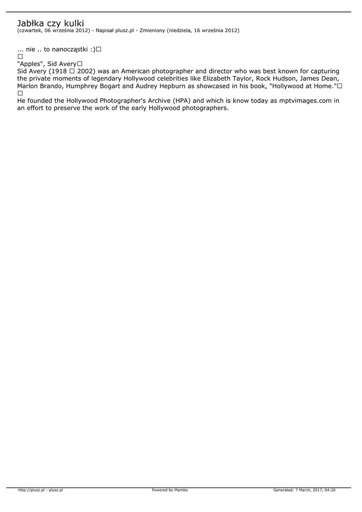 Jabłka czy kulki (czwartek, 06 września 2012) - Napisał plusz.pl - Zmieniony (niedziela, 16 września 2012) ... nie .. to nanocząstki :) "Apples", Sid Avery Sid Avery (1918 2002) was an American photographer and director who was best known for capturing the private moments of legendary Hollywood celebrities like Elizabeth Taylor, Rock Hudson, James Dean, Marlon Brando, Humphrey Bogart and Audrey Hepburn as showcased in his book, "Hollywood at Home." He founded the Hollywood Photographer's Archive (HPA) and which is know today as mptvimages.com in an effort to preserve the work of the early Hollywood photographers. http://plusz.pl - plusz.pl Powered by Mambo Generated: 7 March, 2017, 04:20