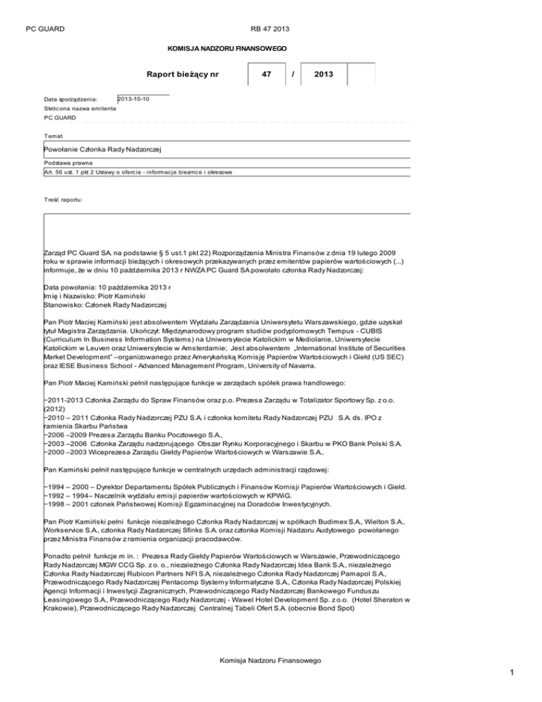 PC GUARD RB 47 2013 KOMISJA NADZORU FINANSOWEGO Raport bieżący nr Data sporządzenia: 47 / 2013 2013-10-10 Skróc ona nazwa emitenta PC GUARD Temat Powołanie Członka Rady Nadzorczej Podstawa prawna Art. 56 ust. 1 pkt 2 Ustawy o oferc ie - informac je bieøπc e i okresowe Treść raportu: Zarząd PC Guard SA. na podstawie § 5 ust.1 pkt 22) Rozporządzenia Ministra Finansów z dnia 19 lutego 2009 roku w sprawie informacji bieżących i okresowych przekazywanych przez emitentów papierów wartościowych (...) informuje, że w dniu 10 października 2013 r NWZA PC Guard SA powołało członka Rady Nadzorczej: Data powołania: 10 października 2013 r Imię i Nazwisko: Piotr Kamiński Stanowisko: Członek Rady Nadzorczej Pan Piotr Maciej Kamiński jest absolwentem Wydziału Zarządzania Uniwersytetu Warszawskiego, gdzie uzyskał tytuł Magistra Zarządzania. Ukończył: Międzynarodowy program studiów podyplomowych Tempus - CUBIS (Curriculum In Business Information Systems) na Uniwersytecie Katolickim w Mediolanie, Uniwersytecie Katolickim w Leuven oraz Uniwersytecie w Amsterdamie; Jest absolwentem „International Institute of Securities Market Development” –organizowanego przez Amerykańską Komisję Papierów Wartościowych i Giełd (US SEC) oraz IESE Business School - Advanced Management Program, University of Navarra. Pan Piotr Maciej Kamiński pełnił następujące funkcje w zarządach spółek prawa handlowego: −2011-2013 Członka Zarządu do Spraw Finansów oraz p.o. Prezesa Zarządu w Totalizator Sportowy Sp. z o.o. (2012) −2010 – 2011 Członka Rady Nadzorczej PZU S.A. i członka komitetu Rady Nadzorczej PZU S.A. ds. IPO z ramienia Skarbu Państwa −2006 –2009 Prezesa Zarządu Banku Pocztowego S.A., −2003 –2006 Członka Zarządu nadzorującego Obszar Rynku Korporacyjnego i Skarbu w PKO Bank Polski S.A. −2000 –2003 Wiceprezesa Zarządu Giełdy Papierów Wartościowych w Warszawie S.A., Pan Kamiński pełnił następujące funkcje w centralnych urzędach administracji rządowej: −1994 – 2000 – Dyrektor Departamentu Spółek Publicznych i Finansów Komisji Papierów Wartościowych i Giełd. −1992 – 1994– Naczelnik wydziału emisji papierów wartościowych w KPWiG. −1998 – 2001 członek Państwowej Komisji Egzaminacyjnej na Doradców Inwestycyjnych. Pan Piotr Kamiński pełni funkcje niezależnego Członka Rady Nadzorczej w spółkach Budimex S.A., Wielton S.A., Workservice S.A., członka Rady Nadzorczej Sfinks S.A. oraz członka Komisji Nadzoru Audytowego powołanego przez Ministra Finansów z ramienia organizacji pracodawców. Ponadto pełnił funkcje m in. : Prezesa Rady Giełdy Papierów Wartościowych w Warszawie, Przewodniczącego Rady Nadzorczej MGW CCG Sp. z o. o., niezależnego Członka Rady Nadzorczej Idea Bank S.A., niezależnego Członka Rady Nadzorczej Rubicon Partners NFI S.A, niezależnego Członka Rady Nadzorczej Pamapol S.A., Przewodniczącego Rady Nadzorczej Pentacomp Systemy Informatyczne S.A., Członka Rady Nadzorczej Polskiej Agencji Informacji i Inwestycji Zagranicznych, Przewodniczącego Rady Nadzorczej Bankowego Funduszu Leasingowego S.A., Przewodniczącego Rady Nadzorczej - Wawel Hotel Development Sp. z o.o. (Hotel Sheraton w Krakowie), Przewodniczącego Rady Nadzorczej Centralnej Tabeli Ofert S.A. (obecnie Bond Spot) Komisja Nadzoru Finansowego 1 PC GUARD RB 47 2013 Pan Kamiński pełni także funkcję Wiceprezydenta, członka prezydium i Skarbnika Pracodawców Rzeczpospolitej Polskiej Osoba ta nie uczestniczy w spółce konkurencyjnej jako wspólnik spółki cywilnej, spółki osobowej; nie uczestniczy w innej konkurencyjnej osobie prawnej jako członek jej organu. Brak wpisu osoby powołanej w Krajowym Rejestrze Dłużników Niewypłacalnych. PC GUARD S.A. (pełna nazwa emitenta) Informatyka (inf) PC GUARD (skróc ona nazwa emitenta) 60-476 (sektor wg. klasyfikac ji GPW w W-wie) Pozna@ (kod poc ztowy) (miejscowość) Jasielska 16 (ulica) (numer) 061 843 42 66 061 847 12 46 (telefon) (fax) [email protected] www.pcguard.pl (e-mail) (www) 779-21-28-540 639792992 (NIP) (REGON) PODPISY OSÓB REPREZENTUJĄCYCH SPÓŁKĘ Data Imię i Nazwisko Stanowisko/Funkc ja 2013-10-10 Mariusz Bławat Prezes Zarządu Podpis Komisja Nadzoru Finansowego 2