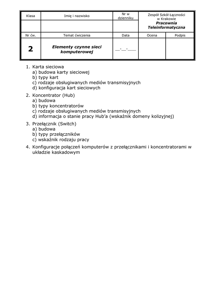 Klasa Imię i nazwisko Nr w dzienniku Zespół Szkół Łączności w Krakowie Pracownia Teleinformatyczna Nr ćw. Temat ćwiczenia Data 2 Elementy czynne sieci komputerowej __-__-____ Ocena Podpis 1. Karta sieciowa a) budowa karty sieciowej b) typy kart c) rodzaje obsługiwanych mediów transmisyjnych d) konfiguracja kart sieciowych 2. Koncentrator (Hub) a) budowa b) typy koncentratorów c) rodzaje obsługiwanych mediów transmisyjnych d) informacja o stanie pracy Hub’a (wskaźnik domeny kolizyjnej) 3. Przełącznik (Switch) a) budowa b) typy przełączników c) wskaźnik rodzaju pracy 4. Konfiguracje połączeń komputerów z przełącznikami i koncentratorami w układzie kaskadowym
