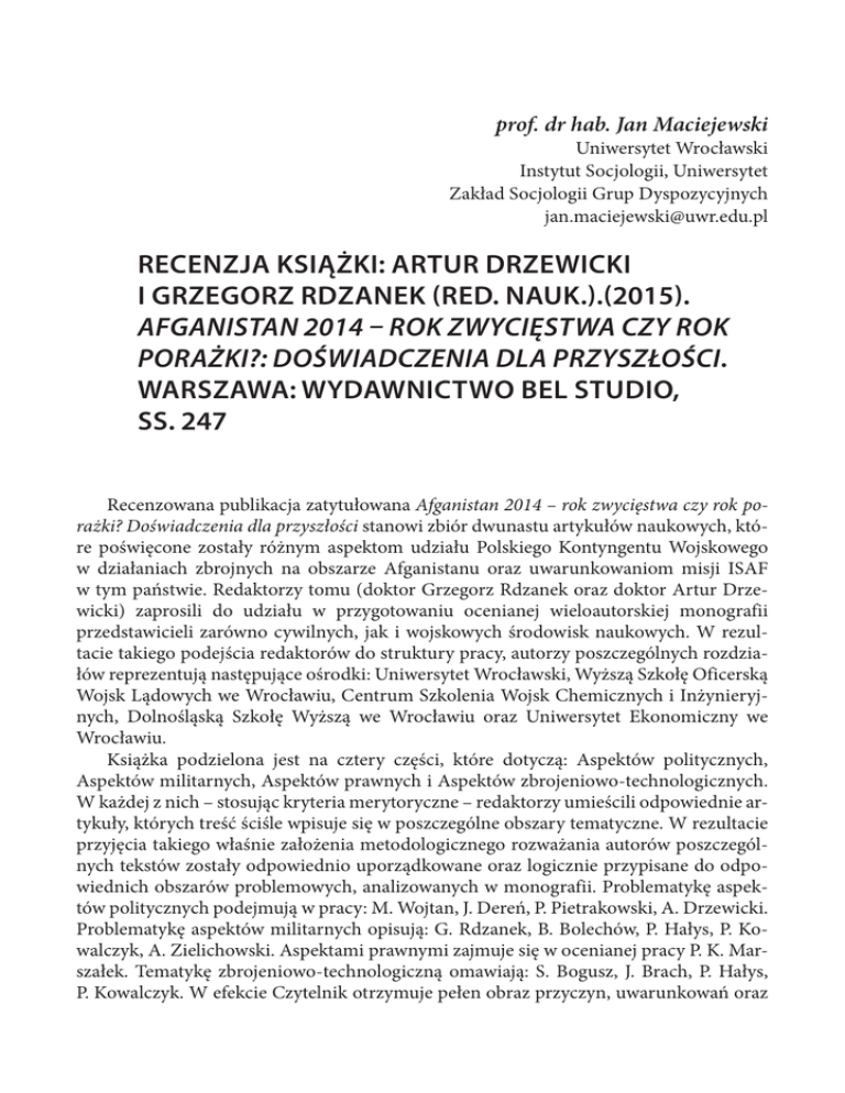 prof. dr hab. Jan Maciejewski Uniwersytet Wrocławski Instytut Socjologii, Uniwersytet Zakład Socjologii Grup Dyspozycyjnych [email protected] RECENZJA KSIĄŻKI: ARTUR DRZEWICKI I GRZEGORZ RDZANEK (RED. NAUK.).(2015). AFGANISTAN 2014 – ROK ZWYCIĘSTWA CZY ROK PORAŻKI?: DOŚWIADCZENIA DLA PRZYSZŁOŚCI. WARSZAWA: WYDAWNICTWO BEL STUDIO, SS. 247 Recenzowana publikacja zatytułowana Afganistan 2014 – rok zwycięstwa czy rok porażki? Doświadczenia dla przyszłości stanowi zbiór dwunastu artykułów naukowych, które poświęcone zostały różnym aspektom udziału Polskiego Kontyngentu Wojskowego w działaniach zbrojnych na obszarze Afganistanu oraz uwarunkowaniom misji ISAF w tym państwie. Redaktorzy tomu (doktor Grzegorz Rdzanek oraz doktor Artur Drzewicki) zaprosili do udziału w przygotowaniu ocenianej wieloautorskiej monografii przedstawicieli zarówno cywilnych, jak i wojskowych środowisk naukowych. W rezultacie takiego podejścia redaktorów do struktury pracy, autorzy poszczególnych rozdziałów reprezentują następujące ośrodki: Uniwersytet Wrocławski, Wyższą Szkołę Oficerską Wojsk Lądowych we Wrocławiu, Centrum Szkolenia Wojsk Chemicznych i Inżynieryjnych, Dolnośląską Szkołę Wyższą we Wrocławiu oraz Uniwersytet Ekonomiczny we Wrocławiu. Książka podzielona jest na cztery części, które dotyczą: Aspektów politycznych, Aspektów militarnych, Aspektów prawnych i Aspektów zbrojeniowo-technologicznych. W każdej z nich – stosując kryteria merytoryczne – redaktorzy umieścili odpowiednie artykuły, których treść ściśle wpisuje się w poszczególne obszary tematyczne. W rezultacie przyjęcia takiego właśnie założenia metodologicznego rozważania autorów poszczególnych tekstów zostały odpowiednio uporządkowane oraz logicznie przypisane do odpowiednich obszarów problemowych, analizowanych w monografii. Problematykę aspektów politycznych podejmują w pracy: M. Wojtan, J. Dereń, P. Pietrakowski, A. Drzewicki. Problematykę aspektów militarnych opisują: G. Rdzanek, B. Bolechów, P. Hałys, P. Kowalczyk, A. Zielichowski. Aspektami prawnymi zajmuje się w ocenianej pracy P. K. Marszałek. Tematykę zbrojeniowo-technologiczną omawiają: S. Bogusz, J. Brach, P. Hałys, P. Kowalczyk. W efekcie Czytelnik otrzymuje pełen obraz przyczyn, uwarunkowań oraz 294 Rocznik Bezpieczeństwa Międzynarodowego 2015, vol. 9, nr 2 następstw interwencji zbrojnej NATO w Afganistanie, ze szczególnym uwzględnieniem zaangażowania w nią Wojska Polskiego. W pierwszej części monografii autorzy poszczególnych artykułów rzetelnie opisują i wyjaśniają specyfikę kulturowo-etniczną Afganistanu, uwarunkowania geopolityczne funkcjonowania afgańskiego społeczeństwa i państwa, międzynarodowe następstwa przejęcia władzy przez Talibów oraz zaangażowania zbrojnego wojsk Stanów Zjednoczonych i NATO na terytorium Afganistanu po 11 września 2001 roku. Część druga pracy obejmuje rozważania i analizy bezpośrednio odnoszące się do czysto operacyjnego wymiaru operacji wojskowej sił ISAF. Autorzy artykułów próbują wyjaśnić przyczyny militarnego niepowodzenia działań wojsk NATO w wymiarze strategicznym, przedstawiają najważniejszy oręż Talibów w walce z siłami NATO – czyli improwizowane ładunki wybuchowe IED, dokonują porównania sposobów działań sił radzieckich w Afganistanie w latach 80. XX wieku z metodami działań militarnych sił NATO, wskazują na wpływ polskiego udziału wojskowego w misji w Afganistanie na kierunki modernizacji technicznej Wojska Polskiego. W trzeciej części pracy opisano prawne podstawy militarnego zaangażowania sił zbrojnych Rzeczypospolitej Polskiej poza granicami państwa. W czwartej części zawarte zostały analizy poświęcone technice militarnej wykorzystywanej w działaniach zbrojnych w Afganistanie. Recenzowana książka jest pozycją wartościową i potrzebną na polskim rynku wydawniczym. Wynika to z kilku powodów. Po pierwsze, redaktorzy zaprosili do współpracy przedstawicieli różnych dyscyplin naukowych: nauk prawnych, nauk wojskowych, nauk o polityce, nauk technicznych. Dzięki interdyscyplinarnemu podejściu problematyka podejmowana na kartach książki jest ujmowana w sposób maksymalnie kompleksowy i holistyczny. Czytelnik sięgający po monografię otrzymuje możliwość poznania bardzo różnych, często specjalistycznych, zagadnień bezpośrednio i pośrednio związanych z konfliktem w Afganistanie oraz misją stabilizacyjną w tym kraju. Po drugie, autorami tekstów w poszczególnych częściach pracy są nie tylko naukowcy – analizujący poszczególne zjawiska i procesy na podstawie ujęć teoretycznych, lecz również praktycy – przedstawiciele Sił Zbrojnych Rzeczypospolitej, żołnierze uczestniczący w działaniach bojowych w Afganistanie, cywilni pracownicy międzynarodowych organizacji. Po trzecie, autorzy poszczególnych artykułów nie ograniczają się jedynie do prostego opisu. Starają się formułować szereg wniosków odnoszących się do polskiego uczestnictwa w misji afgańskiej, kreślą scenariusze dotyczące przyszłej sytuacji w Afganistanie, proponują określone rozwiązania. W ocenianej publikacji Czytelnik znajdzie wiele analiz wyjątkowo interesujących i wartościowych. Wśród nich wymienić można między innymi: artykuł poświęcony wykorzystaniu bezzałogowych statków latających (dronów) w warunkach afgańskiego teatru wojennego, tekst ukazujący identyczność strategii i taktyki walki z Talibami sił radzieckich w latach 80. XX wieku oraz sił NATO, pogłębioną analizę zasad zwalczania ruchów partyzanckich i rebelianckich, wszechstronną analizę sytuacji wewnętrznej oraz międzynarodowej Afganistanu. Na temat tej misji polskiego wojska w Afganistanie napisano dotychczas wiele prac. Tym, co czyni tę pozycję szczególnie wartościową, jest fakt, że ukazuje się ona kilka Recenzje i omówienia 295 miesięcy po ofic