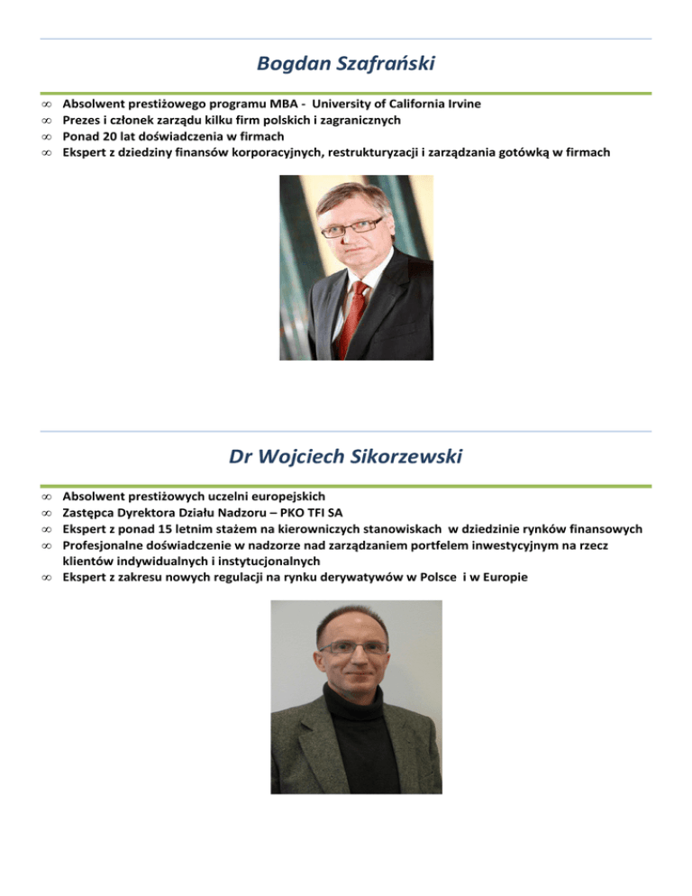 Bogdan Szafrański • • • • Absolwent prestiżowego programu MBA - University of California Irvine Prezes i członek zarządu kilku firm polskich i zagranicznych Ponad 20 lat doświadczenia w firmach Ekspert z dziedziny finansów korporacyjnych, restrukturyzacji i zarządzania gotówką w firmach Dr Wojciech Sikorzewski • • • • • Absolwent prestiżowych uczelni europejskich Zastępca Dyrektora Działu Nadzoru – PKO TFI SA Ekspert z ponad 15 letnim stażem na kierowniczych stanowiskach w dziedzinie rynków finansowych Profesjonalne doświadczenie w nadzorze nad zarządzaniem portfelem inwestycyjnym na rzecz klientów indywidualnych i instytucjonalnych Ekspert z zakresu nowych regulacji na rynku derywatywów w Polsce i w Europie