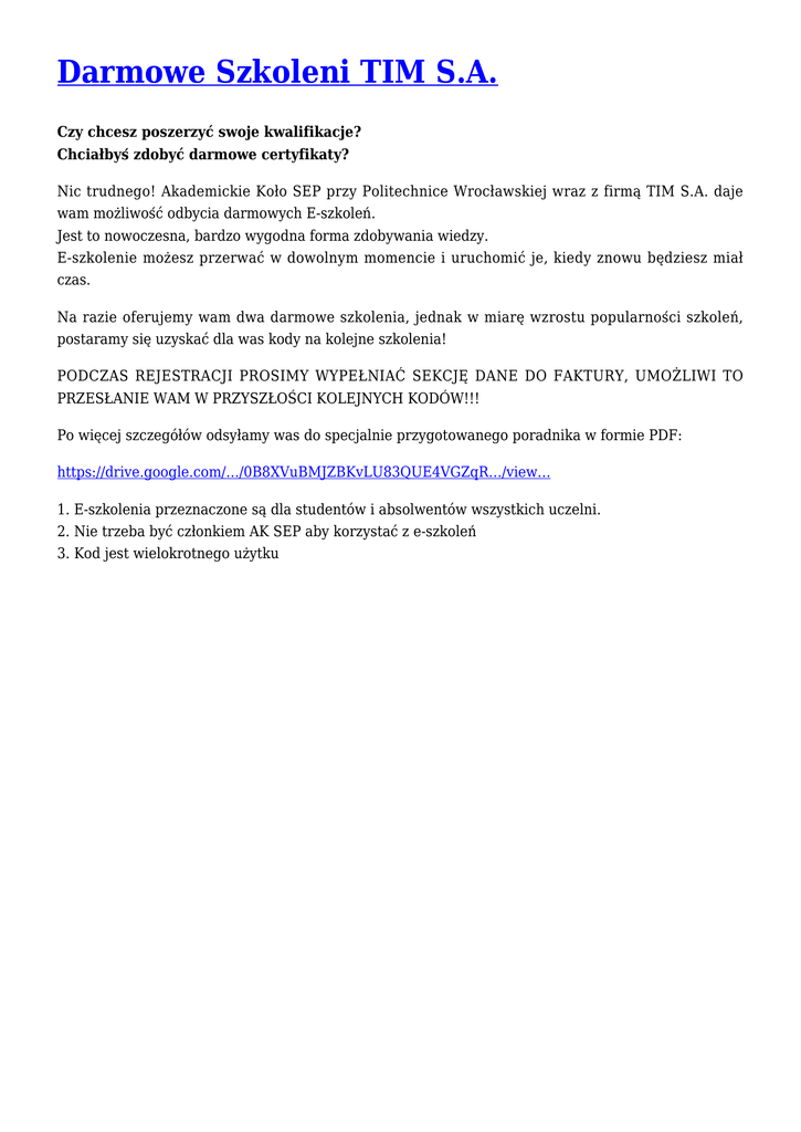 Darmowe Szkoleni TIM S.A. Czy chcesz poszerzyć swoje kwalifikacje? Chciałbyś zdobyć darmowe certyfikaty? Nic trudnego! Akademickie Koło SEP przy Politechnice Wrocławskiej wraz z firmą TIM S.A. daje wam możliwość odbycia darmowych E-szkoleń. Jest to nowoczesna, bardzo wygodna forma zdobywania wiedzy. E-szkolenie możesz przerwać w dowolnym momencie i uruchomić je, kiedy znowu będziesz miał czas. Na razie oferujemy wam dwa darmowe szkolenia, jednak w miarę wzrostu popularności szkoleń, postaramy się uzyskać dla was kody na kolejne szkolenia! PODCZAS REJESTRACJI PROSIMY WYPEŁNIAĆ SEKCJĘ DANE DO FAKTURY, UMOŻLIWI TO PRZESŁANIE WAM W PRZYSZŁOŚCI KOLEJNYCH KODÓW!!! Po więcej szczegółów odsyłamy was do specjalnie przygotowanego poradnika w formie PDF: https://drive.google.com/…/0B8XVuBMJZBKvLU83QUE4VGZqR…/view… 1. E-szkolenia przeznaczone są dla studentów i absolwentów wszystkich uczelni. 2. Nie trzeba być członkiem AK SEP aby korzystać z e-szkoleń 3. Kod jest wielokrotnego użytku