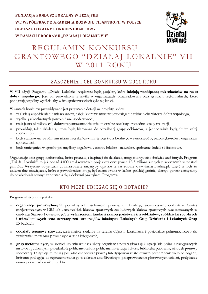 FUNDACJA FUNDUSZ LOKALNY W LEŻAJSKU 1. WE WSPÓŁPRACY Z AKADEMIĄ ROZWOJU FILANTROPII W POLSCE OGŁASZA LOKALNY KONKURS GRANTOWY W RAMACH PROGRAMU „DZIAŁAJ LOKALNIE VII” POLSKO-AMERYKAŃSKIEJ FUNDACJI WOLNOŚCI REGULAMIN KONKURSU GRANTOWEGO “DZIAŁAJ LOKALNIE” VII W 2011 ROKU ZAŁOŻENIA I CEL KONKURSU W 2011 ROKU W VII edycji Programu „Działaj Lokalnie” wspierane będą projekty, które inicjują współpracę mieszkańców na rzecz dobra wspólnego. Jest on prowadzony z myślą o organizacjach pozarządowych oraz grupach nieformalnych, które podejmują wspólny wysiłek, aby w ich społecznościach żyło się lepiej. W ramach konkursu przewidywane jest przyznanie dotacji na projekty, które: o zakładają współdziałanie mieszkańców, dzięki któremu możliwe jest osiąganie celów o charakterze dobra wspólnego, o wynikają z konkretnych potrzeb danej społeczności, o mają jasno określony cel, dobrze zaplanowane działania, mierzalne rezultaty i rozsądne koszty realizacji, o przewidują takie działania, które będą kierowane do określonej grupy odbiorców, a jednocześnie będą służyć całej społeczności o będą realizowane wspólnymi siłami mieszkańców i instytucji życia lokalnego – samorządów, przedsiębiorców i organizacji społecznych, o będą umiejętnie i w sposób przemyślany angażowały zasoby lokalne - naturalne, społeczne, ludzkie i finansowe, Organizacje oraz grupy nieformalne, które poszukują inspiracji do działania, mogą skorzystać z doświadczeń innych. Program „Działaj Lokalnie” to już ponad 4.000 zrealizowanych projektów oraz ponad 18,3 miliona złotych przekazanych w postaci grantów. Wszystkie dotychczas dofinansowane inicjatywy opisane są na stronie www.dzialajlokalnie.pl. Część z nich to uniwersalne rozwiązania, które z powodzeniem mogą być zastosowane w każdej polskiej gminie, dlatego gorąco zachęcamy do odwiedzenia strony i zapoznania się z dobrymi praktykami Programu. KTO MOŻE UBIEGAĆ SIĘ O DOTACJE? Program adresowany jest do: o organizacji pozarządowych posiadających osobowość prawną (tj. fundacji, stowarzyszeń, oddziałów Caritas zarejestrowanych w KRS lub uczniowskich klubów sportowych czy ludowych klubów sportowych zarejestrowanych w ewidencji Starosty Powiatowego), z wyłączeniem fundacji skarbu państwa i ich oddziałów, spółdzielni socjalnych i mieszkaniowych oraz stowarzyszeń samorządów lokalnych, Lokalnych Grup Działania i Lokalnych Grup Rybackich. o oddziały terenowe stowarzyszeń mające siedzibę na terenie objętym konkursem i posiadające pełnomocnictwo do zawierania umów oraz prowadzące własną księgowość, o grup nieformalnych, w których imieniu wniosek złoży organizacja pozarządowa (jak wyżej) lub jedna z następujących instytucji publicznych: przedszkole publiczne, szkoła publiczna, instytucja kultury, biblioteka publiczna, ośrodek pomocy społecznej. Instytucje te muszą posiadać osobowość prawną lub dysponować stosownym pełnomocnictwem od organu, któremu podlegają, do reprezentowania go w zakresie umożliwiającym przeprowadzenie planowanych działań, podpisanie umowy oraz rozliczenie projektu. Do konkursu można składać nieograniczoną liczbę wniosków (zarówno przez wnioskodawców1, jak i realizatorów2), jednak jeden realizator będzie mógł dostać dofinansowanie na realizację najwyżej jednego projektu. W konkursie mogą wziąć udział te organizacje i instytucje które: o mają siedzibę w gminach na terenie 4 powiatów: leżajskiego (gminy: miejska i wiejska Leżajsk, Nowa Sarzyna, Grodzisko Dolne, Kuryłówka), niżańskiego (gminy: Nisko, Rudnik, Ulanów, Harasiuki, Jarocin, Jeżowe, Krzeszów), łańcuckiego (gminy: miejska i wiejska Łańcut, Białobrzegi, Czarna, Markowa, Rakszawa, Żołynia), przeworskiego (gminy: miejska i wiejska Przeworsk, Kańczuga, Sieniawa, Adamówka, Gać, Jawornik Polski, Tryńcza, Zarzecze). o planują prowadzić działania na terenie jednej z wymienionych gmin. SPOSÓB WYŁANIANIA GRANTOBIORCÓW Lokalna Organizacja Grantowa dokona oceny formalnej w oparciu o następujące kryteria: 1. projekt został złożony w terminie, tj. do dnia 08.07.2011. 2. projekt jest napisany według formularza wniosku Programu „Działaj Lokalnie VII” 2011, jest czytelny i kompletny. 3. projekt jest złożony przez fundację lub stowarzyszenie3 (bądź jej/jego oddział) lub grupę nieformalną, w której imieniu występuje organizacja lub uprawniona instytucja posiadająca osobowość prawną. 4. organizacja/instytucja ubiegająca się o dotację załączyła do wniosku dokument potwierdzający posiadanie osobowości prawnej lub stosowne pełnomocnictwo od organu, któremu podlega, do samodzielnego zaciągania zobowiązań oraz prowadzenia działań zaplanowanych w ramach projektu. 5. projekt jest adresowany do społeczności do około 20.000 mieszkańców (lub większej, objętej konkursem miejscowości4), która mieści się w zasięgu działania LOG, a siedziba wnioskodawcy (organizacji, koła, oddziału) znajduje się na obszarze objętym konkursem przez LOG. 6. siedziba wnioskodawcy znajduje się na obszarze objętym konkursem przez LOG. 7. projekt dotyczy aktywizowania lokalnych społeczności wokół celów o charakterze dobra wspólnego. 8. harmonogram minimum 3-miesięcznego, max. 6-miesięcznego projektu jest przewidziany na okres między 01.08.2011 r. a 31.03.2012 r. 9. przedstawiony w formularzu wniosku budżet jest prawidłowo wypełniony (nie zawiera błędów rachunkowych). 10. kwota wnioskowanej dotacji nie przekracza 6.000 złotych. 11. organizacja ma zaplanowany wkład własny w wysokości minimum 25% wartości wnioskowanej dotacji, z czego min. 5% w postaci finansowej5, pozostała część w postaci wkładu usługowego, rzeczowego lub pracy wolontariuszy. 12. projekt wyklucza prowadzenie działalności gospodarczej. 13. z otrzymanej dotacji finansować nie można: o udzielania p