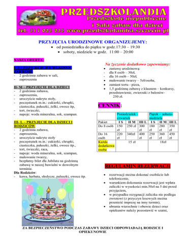 PRZYJĘCIA URODZINOWE ORGANIZUJEMY: od poniedziałku do piątku w godz.17:30 – 19:30 soboty, niedziele w godz. 11:00 – 20:00 NASZA OFERTA: Na życzenie dodatkowo zapewniamy: I- S – PRZYJĘCIE WE WŁASNYM ZAKRESIE - 2 godzinna zabawa w sali, - zaproszenia II- M – PRZYJĘCIE DLA DZIECI - 2 godzinna zabawa, - zaproszenia, - uroczyście nakryte stoły, - poczęstunek m.in.: cukierki, chrupki, ciasteczka, paluszki, żelki, owoce itp, - tort, świeczki, - napoje: woda mineralna, sok, szampan. III- L – PRZYJĘCIE DLA DZIECI I RODZICÓW - 2 godzinna zabawa, - zaproszenia, - uroczyście nakryte stoły - poczęstunek m.in.: cukierki, chrupki, ciasteczka, paluszki, żelki, owoce itp., - tort, świeczki, raca, - napoje: woda mineralna, sok, szampan, - malowanie twarzy, - bezpłatny bilet dla Jubilata na godzinną zabawę w naszej bawialni w dowolnym terminie. Dla Rodziców: - kawa, herbata, słodycze, paluszki, owoce itp. zastawę urodzinową: dla 8 osób – 30zł, dla 16 osób – 50zł, malowanie twarzy – 5zł/osoba, zamiast tortu - pizza, 1,5 godzinną zabawę z klaunem – konkursy, przedstawienie, zwierzaki z balonów250 zł. CENNIK: Poniedziałek czwartek Pakiet I S II M III L Do 8 osób 150 250 zł 300 zł zł Do 16 220 340zł 400 osób zł zł Każda 15 zł dodatkowa osoba Piątek – sobotaniedziela I S II M III L 180 280 350 zł zł zł 250 360 450 zł zł zł 18zł REGULAMIN REZERWACJI rezerwacji można dokonać osobiście lub telefonicznie, warunkiem dokonania rezerwacji jest wpłata zaliczki w wysokości min.50zł na 5 dni przed przyjęciem, w przypadku rezygnacji zaliczka nie podlega zwrotowi (z przyczyn losowych można przenieść imprezę na inny termin), ubrania wierzchnie i obuwie dzieci oraz opiekunów należy pozostawić w szatni, ZA BEZPIECZEŃSTWO PODCZAS ZABAWY DZIECI ODPOWIADAJĄ RODZICE I OPIEKUNOWIE