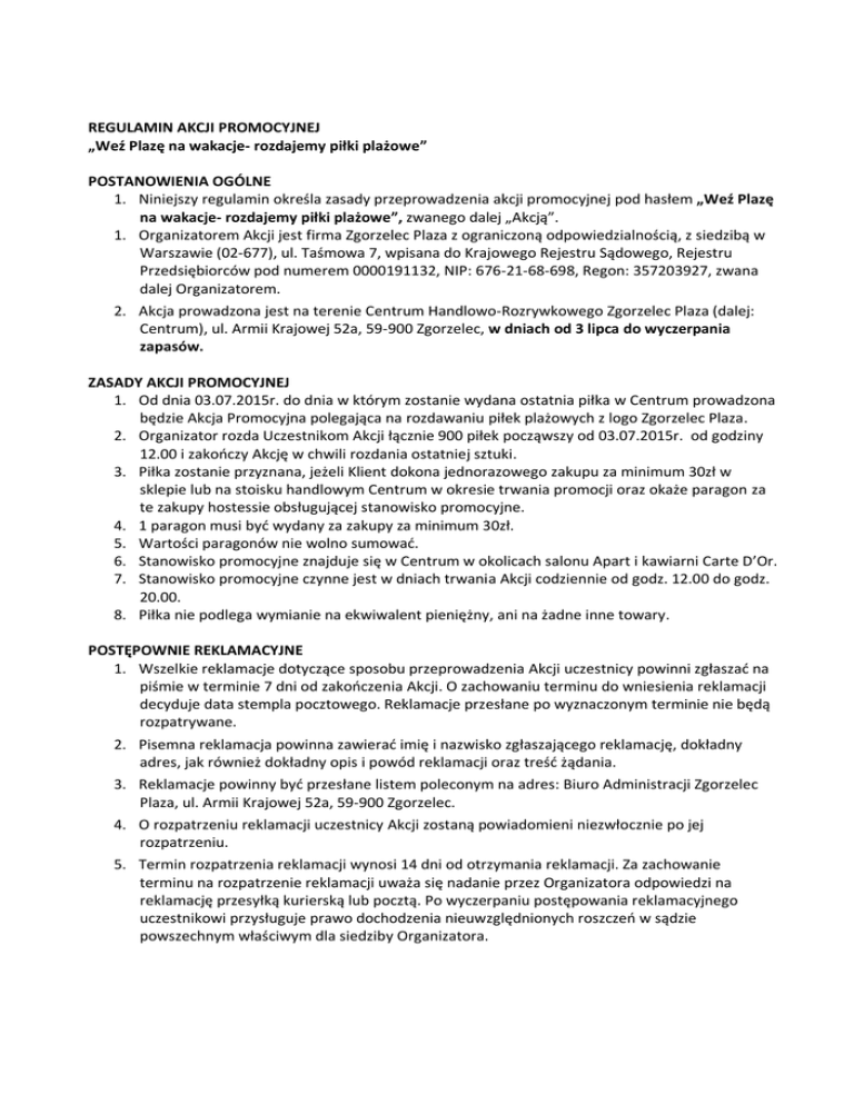 REGULAMIN AKCJI PROMOCYJNEJ „Weź Plazę na wakacje- rozdajemy piłki plażowe” POSTANOWIENIA OGÓLNE 1. Niniejszy regulamin określa zasady przeprowadzenia akcji promocyjnej pod hasłem „Weź Plazę na wakacje- rozdajemy piłki plażowe”, zwanego dalej „Akcją”. 1. Organizatorem Akcji jest firma Zgorzelec Plaza z ograniczoną odpowiedzialnością, z siedzibą w Warszawie (02-677), ul. Taśmowa 7, wpisana do Krajowego Rejestru Sądowego, Rejestru Przedsiębiorców pod numerem 0000191132, NIP: 676-21-68-698, Regon: 357203927, zwana dalej Organizatorem. 2. Akcja prowadzona jest na terenie Centrum Handlowo-Rozrywkowego Zgorzelec Plaza (dalej: Centrum), ul. Armii Krajowej 52a, 59-900 Zgorzelec, w dniach od 3 lipca do wyczerpania zapasów. ZASADY AKCJI PROMOCYJNEJ 1. Od dnia 03.07.2015r. do dnia w którym zostanie wydana ostatnia piłka w Centrum prowadzona będzie Akcja Promocyjna polegająca na rozdawaniu piłek plażowych z logo Zgorzelec Plaza. 2. Organizator rozda Uczestnikom Akcji łącznie 900 piłek począwszy od 03.07.2015r. od godziny 12.00 i zakończy Akcję w chwili rozdania ostatniej sztuki. 3. Piłka zostanie przyznana, jeżeli Klient dokona jednorazowego zakupu za minimum 30zł w sklepie lub na stoisku handlowym Centrum w okresie trwania promocji oraz okaże paragon za te zakupy hostessie obsługującej stanowisko promocyjne. 4. 1 paragon musi być wydany za zakupy za minimum 30zł. 5. Wartości paragonów nie wolno sumować. 6. Stanowisko promocyjne znajduje się w Centrum w okolicach salonu Apart i kawiarni Carte D’Or. 7. Stanowisko promocyjne czynne jest w dniach trwania Akcji codziennie od godz. 12.00 do godz. 20.00. 8. Piłka nie podlega wymianie na ekwiwalent pieniężny, ani na żadne inne towary. POSTĘPOWNIE REKLAMACYJNE 1. Wszelkie reklamacje dotyczące sposobu przeprowadzenia Akcji uczestnicy powinni zgłaszać na piśmie w terminie 7 dni od zakończenia Akcji. O zachowaniu terminu do wniesienia reklamacji decyduje data stempla pocztowego. Reklamacje przesłane po wyznaczonym terminie nie będą rozpatrywane. 2. Pisemna reklamacja powinna zawierać imię i nazwisko zgłaszającego reklamację, dokładny adres, jak również dokładny opis i powód reklamacji oraz treść żądania. 3. Reklamacje powinny być przesłane listem poleconym na adres: Biuro Administracji Zgorzelec Plaza, ul. Armii Krajowej 52a, 59-900 Zgorzelec. 4. O rozpatrzeniu reklamacji uczestnicy Akcji zostaną powiadomieni niezwłocznie po jej rozpatrzeniu. 5. Termin rozpatrzenia reklamacji wynosi 14 dni od otrzymania reklamacji. Za zachowanie terminu na rozpatrzenie reklamacji uważa się nadanie przez Organizatora odpowiedzi na reklamację przesyłką kurierską lub pocztą. Po wyczerpaniu postępowania reklamacyjnego uczestnikowi przysługuje prawo dochodzenia nieuwzględnionych roszczeń w sądzie powszechnym właściwym dla siedziby Organizatora. POSTANOWIENIA KOŃCOWE 1. W Akcji nie mogą brać udziału pracownicy i członkowie rodzin Organizatora, a także najemcy CHR Zgorzelec Plaza, ich pracownicy i współpracownicy. 2. Organizator jest uprawniony do żądania od osób zgłaszających się do Akcji podania danych osobowych niezbędnych do przeprowadzenia Akcji na warunkach określonych w ustawie z dnia 29 sierpnia 1997 r. o ochronie danych osobowych (Dz. U. Nr 133 poz. 883 z późn. zm.). Administratorem danych osobowych zebranych podczas niniejszej Akcji jest Organizator. Każdemu uczestnikowi przysługuje prawo wglądu do swoich danych osobowych i ich zmiany. 3. Organizator zastrzega sobie prawo wprowadzenia zmian w niniejszym regulaminie w trakcie trwania Akcji. Zmiana taka nie może naruszać praw już nabytych przez uczestników Akcji. 4. Organizator może wykluczyć Uczestnika Akcji na każdym jego etapie, jeśli stwierdzi jakiekolwiek naruszenie niniejszego regulaminu lub przepisów prawa. 5. Niniejszy regulamin Akcji dostępny jest w siedzibie Organizatora oraz na stronie internetowej www.zgorzelec-plaza.pl. 6. W kwestiach nieuregulowanych niniejszym Regulaminem stosuje się przepisy ustawy Kodeks Cywilny.
