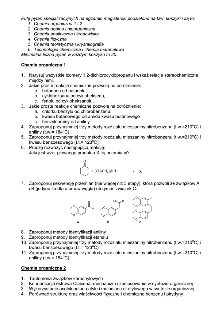 Pulę pytań specjalizacyjnych na egzamin magisterski podzielono na tzw. koszyki i są to: 1. Chemia organiczna 1 i 2 2. Chemia ogólna i nieorganiczna 3. Chemia analityczna i środowiska 4. Chemia fizyczna 5. Chemia teoretyczna i krystalografia 6. Technologia chemiczna i chemia materiałowa Minimalna liczba pytań w kaŜdym koszyku to 30. Chemia organiczna 1 1. Narysuj wszystkie izomery 1,2-dichlorocyklopropanu i wskaŜ relacje stereochemiczne między nimi. 2. Jakie proste reakcje chemiczne pozwolą na odróŜnienie: a. butanonu od butanolu, b. cykloheksanu od cykloheksenu, c. fenolu od cykloheksanolu, 3. Jakie proste reakcje chemiczne pozwolą na odróŜnienie: a. chlorku benzylu od chlorobenzenu, b. kwasu butanowego od amidu kwasu butanowego c. benzyloaminy od aniliny 4. Zaproponuj przynajmniej trzy metody rozdziału mieszaniny nitrobenzenu (t.w.=210oC) i aniliny (t.w.= 184oC). 5. Zaproponuj przynajmniej trzy metody rozdziału mieszaniny nitrobenzenu (t.w.=210oC) i kwasu benzoesowego (t.t.= 123oC). 6. Proszę rozwaŜyć następującą reakcję: Jaki jest wzór głównego produktu X tej przemiany? O + (CH3CH2)2NH X 7. Zaproponuj sekwencję przemian (nie więcej niŜ 3 etapy), która pozwoli ze związków A i B (jedyne źródła atomów węgla) otrzymać związek C. O Cl O O H O O O O O O O A B C 8. Zaproponuj metody identyfikacji aniliny 9. Zaproponuj metody identyfikacji etanalu 10. Zaproponuj przynajmniej trzy metody rozdziału mieszaniny nitrobenzenu (t.w.=210oC) i kwasu benzoesowego (t.t.= 123oC). 11. Zaproponuj przynajmniej trzy metody rozdziału mieszaniny nitrobenzenu (t.w.=210oC) i aniliny (t.w.= 184oC). Chemia organiczna 2 1. 2. 3. 4. Tautomeria związków karbonylowych Kondensacja estrowa Claisena: mechanizm i zastosowanie w syntezie organicznej Wykorzystanie acetylooctanu etylu i malonianu di etylowego w syntezie organicznej Porównać strukturę oraz właściwości fizyczne i chemiczne benzenu i pirydyny 5. 6. 7. 8. 9. 10. 11. 12. 13. 14. 15. 16. Porównać strukturę oraz właściwości fizyczne i chemiczne pirydyny i pirolu Wyjaśnij, dlaczego pirydyna jest mocniejsza zasadą niŜ pirol. Porównać zasadowość pirydyny z zasadowością 4-metoksy- i 4-acetylopirydyny Na dowolnych przykładach napisz, co najmniej 3 reakcje (metody) otrzymywania aminokwasów. Ile tripeptydów moŜna otrzymać z dwóch aminokwasów? Przedstawić racjonalną metodę syntezy wybranego tripeptydu Jakie są sposoby blokowania grup funkcyjnych w aminokwasach. (zapisz odpowiednie reakcje). Struktura D-glukozy i zjawisko mutarotacji Jak wyjaśnić fakt, Ŝe fruktoza jest cukrem redukującym (w reakcji z odczynnikiem Tollensa). Napisz odpowiednie równania reakcji. Czym się róŜni (pod względem chemicznym) DNA i RNA Polimeryzacja rodnikowa związków winylowych: mechanizm i zastosowania Jakie produkty powstaną w reakcji alaniny z: (zapisz równania reakcji): a. CH3OH / H+ b. węglan di-t-butylu - (t-BuOOC)2O c. glicyna Jaki produkt powstanie w poniŜszej reakcji? Jak nazywa się ta reakcja? O O O + 1. EtO -Na+ 2. H 3O+ 17. Z ilu jednostek izoprenowych składa się β-karoten o poniŜszym wzorze. Uzasadnij odpowiedź. 18. Narysuj diagram orbitali molekularnych sprzęŜonego dienu. Zaznacz HOMO i LUMO zarówno w stanie podstawowym jak i wzbudzonym. 19. Na przykładzie elektrocyklizacji dla 1,3,5-heksatrienu, opisz ten proces i wyjaśnij pojęcia zamknięcie konrotacyjne i dysrotacyjne. 20. Jakie proste reakcje pozwolą na odróŜnienie: a. butanolu od butanolu b. cykloheksanu od cykloheksenu c. fenolu od cyklokeksanolu Chemia ogólna i nieorganiczna 1. Wyjaśnij dlaczego wapń ma tylko nieznacznie wyŜszy (bardziej dodatni) od potasu potencjał normalny, mimo Ŝe suma I i II energii jonizacji wapnia jest o wiele wyŜsza od energii jonizacji potasu 2. Wyjaśnij dlaczego lit, mimo najwyŜszej w I grupie energii jonizacji, ma najniŜszy potencjał normalny. 3. Wyjaśnij dlaczego chlorek glinu, mimo występującego w nim wiązania kowalencyjnego spolaryzowanego, w roztworze wodnym jest całkowicie zdysocjowany na jony 4. Co to jest energia stabilizacji w polu krystalicznym? Jaki związek ma ta wielkość z trwałością kompleksu? Czy znasz jakieś dowody eksperymentalne wykazujące taki związek? 5. Za pomocą metody orbitali molekularnych wykaŜ Ŝe mogą istnieć cząsteczki (jony): O2+2, NO, N2 . Oblicz dla kaŜdej z nich rząd wiązania i określ jej właściwości magnetyczne. Czy jon N2+ będzie trwalszy od cząsteczki N2? (Odpowiedź uzasadnij) 6. Na czym z termodynamicznego, a na czym z kinetycznego punktu widzenia, polega stan równowagi reakcji. Jaki związek ma stała równowagi reakcji ze standardową zmianą swobodnej entalpii tej reakcji? 7. Opisz zasadę działania, znanych Ci, współczesnych ogniw do zasilania urządzeń przenośnych. Które z tych rozwiązań jest Twoim zdaniem najlepsze? (Odpowiedź uzasadnij). 8. Porównaj pojęcie kwasu (zasady) w teoriach Bronstedta i Lewisa. 9. Metody otrzymywania pierwiastków ultra czystych. 10. Elektroujemność i jej skale. 11. Korozja Ŝelaza – mechanizm procesu, sposoby ochrony przed korozją. 12. Wytłumacz róŜnicę pomiędzy trwałością a biernością kompleksów. 13. Omów dwa ogólne mechanizmy reakcji przeniesienia elektronów w kompleksach. 14. Co to jest efekt makrocykliczny? Jakie jest jego źródło? 15. Scharakteryzuj główne mechanizmy wymiany ligandów w kompleksach. 16. W eterze koronowym zastąpiono dwa atomy tlenu zastąpimy atomami siarki. Czy będzie on tworzył trwalsze kompleksy z jonami sodu Na+ czy srebra Ag+? Odpowiedź uzasadnij. 17. Stabilizacja niestandardowo niskich stopni utleniania metali w kompleksach. 18. Związki chemiczne tworzone przez gazy szlachetne. 19. Podaj kryteria dla odwracalnego procesu elektrodowego w woltamperometrii cyklicznej. 20. Omów istotę inwersyjnych technik woltamperometrycznych. 21. Omów sposoby wyznaczania potencjałów formalnych z pomiarów wolt amperometrycznych. 22. Podaj