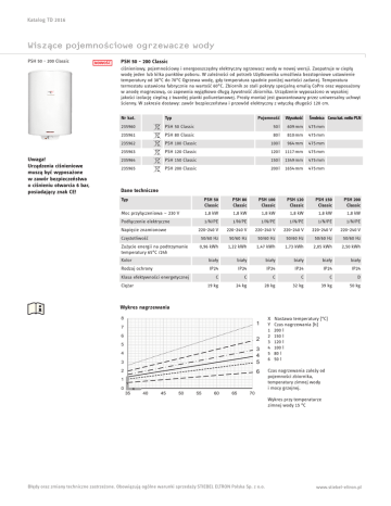 Katalog TD 2016 Wiszące pojemnościowe ogrzewacze wody PSH 50 - 200 Classic NOWOŚĆ PSH 50 - 200 Classic ciśnieniowy, pojemnościowy i energooszczędny elektryczny ogrzewacz wody w nowej wersji. Zaopatruje w ciepłą wodę jeden lub kilka punktów poboru. W zależności od potrzeb Użytkownika umożliwia bezstopniowe ustawienie temperatury od 30°C do 70°C Ogrzewa wodę, gdy temperatura spadnie poniżej wartości zadanej. Temperatura termostatu ustawiona fabrycznie na wartość 60°C. Zbiornik ze stali pokryty specjalną emalią CoPro oraz wyposażony w anodę magnezową, co zapewnia wyjątkowo długą żywotność zbiornika. Urządzenie wyposażono w wysokiej jakości izolację cieplną z twardej pianki poliuretanowej. Prosty montaż jest gwarantowany przez uniwersalny uchwyt ścienny. W zakresie dostawy: zawór bezpieczeństwa i przewód elektryczny z wtyczką długości 120 cm. Nr kat. Uwaga! Urządzenia ciśnieniowe muszą być wyposażone w zawór bezpieczeństwa o ciśnieniu otwarcia 6 bar, posiadający znak CE! Typ Pojemność Wysokość Średnica Cena kat. netto PLN 235960 PSH 50 Classic 50 l 609 mm 475 mm 235961 PSH 80 Classic 80 l 810 mm 475 mm 235962 PSH 100 Classic 100 l 964 mm 475 mm 235963 PSH 120 Classic 120 l 1117 mm 475 mm 235964 PSH 150 Classic 150 l 1349 mm 475 mm 235965 PSH 200 Classic 200 l 1654 mm 475 mm Dane techniczne Typ PSH 50 Classic PSH 80 Classic PSH 100 Classic PSH 120 Classic PSH 150 Classic PSH 200 Classic Moc przyłączeniowa ~ 230 V 1,8 kW 1,8 kW 1,8 kW 1,8 kW 1,8 kW 1,8 kW Podłączenie elektryczne 1/N/PE 1/N/PE 1/N/PE 1/N/PE 1/N/PE 1/N/PE Napięcie znamionowe 220-240 V 220-240 V 220-240 V 220-240 V 220-240 V 220-240 V Częstotliwość 50/60 Hz 50/60 Hz 50/60 Hz 50/60 Hz 50/60 Hz 50/60 Hz Zużycie energii na podtrzymanie temperatury 65°C /24h 0,96 kWh 1,22 kWh 1,47 kWh 1,73 kWh 2,05 kWh 2,50 kWh Kolor biały biały biały biały biały biały Rodzaj ochrony IP24 IP24 IP24 IP24 IP24 IP24 C C C C C D 19 kg 24 kg 28 kg 32 kg 39 kg 50 kg Klasa efektywności energetycznej Ciężar Wykres nagrzewania 8 1 7 6 2 5 3 3 4 5 2 6 4 1 0 35 40 45 50 55 60 65 70 X Y 1 2 3 4 5 6 Nastawa temperatury [°C] Czas nagrzewania [h] 200 l 150 l 120 l 100 l 80 l 50 l Czas nagrzewania zależy od pojemności zbiornika, temperatury zimnej wody i mocy grzejnej. Wykres przy temperaturze zimnej wody 15 °C Błędy oraz zmiany techniczne zastrzeżone. Obowiązują ogólne warunki sprzedaży STIEBEL ELTRON Polska Sp. z o.o. www.stiebel-eltron.pl