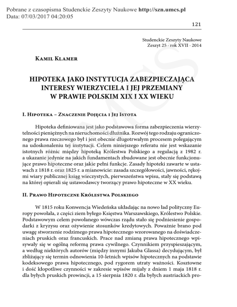 Pobrane z czasopisma Studenckie Zeszyty Naukowe http://szn.umcs.pl Data: 07/03/2017 04:20:05 121 Studenckie Zeszyty Naukowe Zeszyt 25 ∙ rok XVII ∙ 2014 CS Kamil Klamer HIPOTEKA JAKO INSTYTUCJA ZABEZPIECZAJąCA INTERESY WIERZYCIELA I JEJ PRZEMIANY W PRAWIE POLSKIM XIX I XX WIEKU U M I. Hipoteka – Znaczenie Pojęcia i Jej Istota Hipoteka deiniowana jest jako podstawowa forma zabezpieczenia wierzytelności pieniężnych na nieruchomości dłużnika. Rozwój tego rodzaju ograniczonego prawa rzeczowego był i jest obecnie długotrwałym procesem polegającym na udoskonaleniu tej instytucji. Celem niniejszego referatu nie jest wskazanie istotnych różnic między hipoteką Królestwa Polskiego a regulacją z 1982 r. a ukazanie jedynie na jakich fundamentach zbudowane jest obecnie funkcjonujące prawo hipoteczne oraz jakie pełni funkcje. Zasady hipoteki zawarte w ustawach z 1818 r. oraz 1825 r. a mianowicie: zasada szczegółowości, jawności, rękojmi wiary publicznej ksiąg wieczystych, pierwszeństwa wpisu, stały się podstawą na której opierali się ustawodawcy tworzący prawo hipoteczne w XX wieku. II. Prawo Hipoteczne Królestwa Polskiego W 1815 roku Konwencja Wiedeńska układając na nowo ład polityczny Europy powołała, z części ziem byłego Księstwa Warszawskiego, Królestwo Polskie. Podstawowym celem powołanego wówczas rządu stało się podniesienie gospodarki z kryzysu oraz ożywienie stosunków kredytowych. Poważnie brano pod uwagę stworzenie rodzimego prawa hipotecznego wzorowanego na doświadczeniach pruskich oraz francuskich. Prace nad zmianą prawa hipotecznego wpisywały się w ogólną reformą prawa cywilnego. Czynnikiem przyspieszającym, a według niektórych autorów (między innymi Jakuba Glassa) decydującym, był zbliżający się termin odnowienia 10-letnich wpisów hipotecznych na podstawie kodeksowego prawa hipotecznego, pod rygorem utraty ważności. Kosztowne i dość kłopotliwe czynności w zakresie wpisów mijały z dniem 1 maja 1818 r. dla byłych pruskich prowincji, a 15 sierpnia 1820 r. dla byłych austriackich pro- Pobrane z czasopisma Studenckie Zeszyty Naukowe http://szn.umcs.pl Data: 07/03/2017 04:20:05 122 U M CS wincji Królestwa Polskiego. Prace nad zmianą tytułu XVIII księgi III Kodeksu Napoleona były pierwszym poważnym przedsięwzięciem w czasach świetności tego ustawodawstwa. Projekt nowego prawa hipotecznego został przygotowany przez Deputację Cywilną dość szybko, a mianowicie w kwietniu 1818 r. W dużej mierze przyczynił się do tego Antoni Wyczechowski. Projekt liczył 169 artykułów podzielonych w 10 działach. Głównymi zasadami jakie brano pod uwagę tworząc projekt były: 1) akty prawne przypisane nieruchomościom miały być rozpatrywane przez sąd, zakwaliikowane do wpisu miały być tylko te, które zatwierdził sąd; 2) wpisy w księgach uznawane były za niewzruszalne, co do osób trzecich, jeżeli w zaufaniu do nich nabyły prawa; 3) z momentem dokonania wpisu prawa nabywano całkowicie i bezwzględnie, dzięki czemu zniknął problem oczekiwania na uzyskanie spokojnego posiadania. Projekt wzorowany był na prawie pruskim, dawnym prawie polskim oraz francuskim. Zawierał jednak wiele unikatowych rozwiązań, a większość postanowień była oryginalnym tworem polskiego ustawodawstwa. Rada Stanu dość szybko przedyskutowała przedłożony projekt poświęcając na to łącznie 6 posiedzeń1. Praca Deputacji Cywilnej (twór wydzielony z Komisji Prawodawczej zajmująca się przygotowaniem projektu ustawy hipotecznej) była podzielona na dwie części. Pierwsza stanowiła o rożnych sposobach nabycia własności dóbr nieruchomych i ustalania praw nabytych. Druga cześć prac dotyczyła przywilejów i hipotek2. Sejm przyjął projekt 3 kwietnia 1818 r. jako „Prawo o ustaleniu własności dóbr nieruchomych, o przywilejach i hipotekach”. Prawo hipotecznie z 1818 r. wprowadziło tzw. przymus hipotecznej regulacji dóbr ziemskich i nieruchomości położonych w miastach wojewódzkich (duża własność). Owa regulacja miała charakter obligatoryjny. Każda nieruchomość musiała mieć urządzoną księgę wieczystą składającą się z trzech części: 1. Wykaz hipoteczny (znajdował się w nim opis nieruchomości, wykazanie właścicieli, ścieśnienia własności, długi obciążające nieruchomość)), 2. Księga umów, 3. Zbiór dokumentów3. Ustawę hipoteczną z 1818 roku charakteryzowały zasady charakterystyczne dla nowoczesnych systemów hipotecznych, a mianowicie: jawności, legalności, szczegółowości, pierwszeństwa. Jakub Glass, wybitny cywilista i znawca pra1 W. Wójcikiewicz, Prawo hipoteczne Królestwa Polskiego, Wrocław : Zakład Narodowy im. Ossolińskich. Wydawnictwo PAN, 1967 s. 59. 2 W. Nowakowski, Rys historyczny ustaw hipotecznych z 1818 i 1825r., GSW 1888, nr 29, s. 482-483. 3 A. Korobowicz, W. Witkowski, Historia ustroju i prawa polskiego (1772-1918), Warszawa 2009, s.130-131. Pobrane z czasopisma Studenckie Zeszyty Naukowe http://szn.umcs.pl Data: 07/03/2017 04:20:05 123 U M CS wa hipotecznego, wymienia oprócz zasad głównych dwie inne: wolną inicjatywę stron oraz urzędową formę. Wiodącą zasadą była jawność hipoteczna. Dzieliła się ona na jawność materialną (istotne znaczenie miały wpisy do księgi hipotecznej; na ich podstawie prawo do nieruchomości można było nabyć, zmienić i wykreślić) oraz jawność formalną, która oznaczała, że każda zainteresowana osoba miała prawo przejrzenia księgi hipotecznej. Jednak w praktyce wszyscy mogli je przeglądać i uzyskiwać odpisy4. Prawo hipoteczne z 1818 r. dawało możliwość przeglądania i wypisów właścicielom nieruchomości, wierzycielom i osobom przez nich wskazanym w dowolnym czasie. Pozostałe osoby miały udowodnić interes prawny oraz uzyskać pozwolenia sekretarza, notariusza lub przewodniczącego Wydziału Hipotecznego. Sam proces przeglądania akt następował w obecności sekret