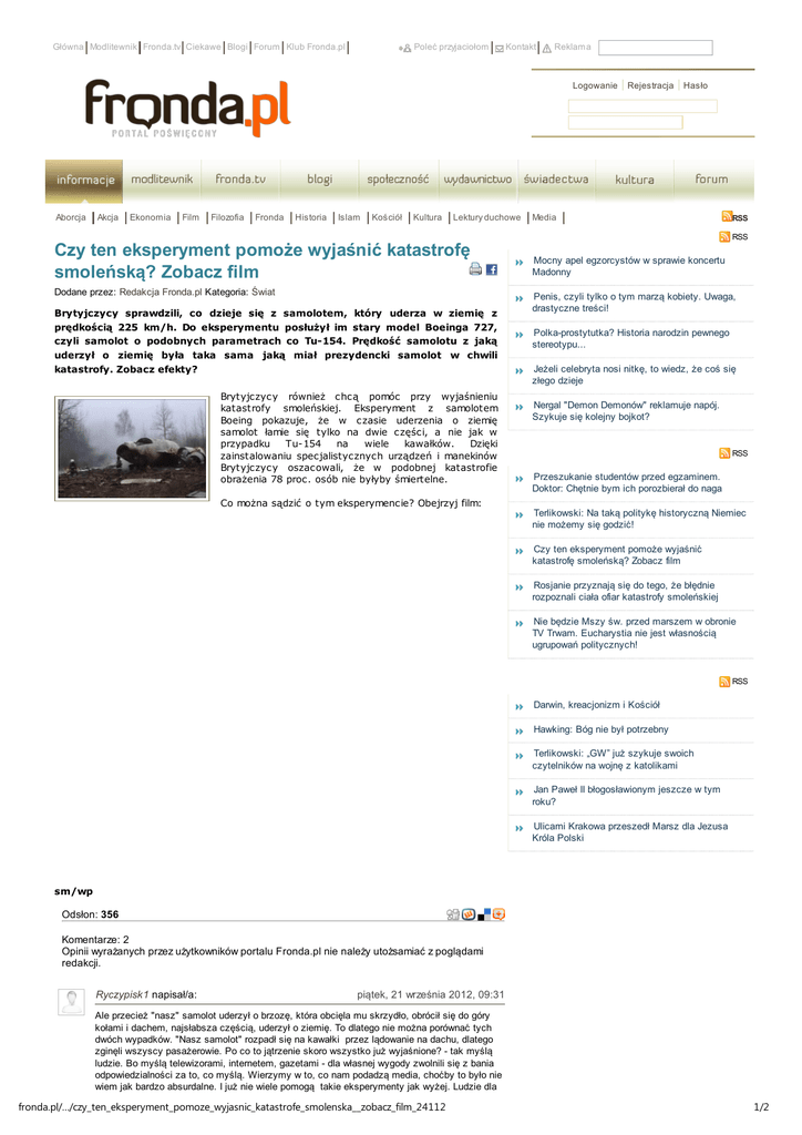 Główna Modlitewnik Fronda.tv Ciekawe Blogi Forum Klub Fronda.pl Poleć przyjaciołom Kontakt Reklama Logowanie Aborcja Akcja Ekonomia Film Filozofia Fronda Historia Islam Kościół Kultura Lektury duchowe Czy ten eksperyment pomoże wyjaśnić katastrofę smoleńską? Zobacz film Dodane przez: Redakcja Fronda.pl Kategoria: Świat Brytyjczycy sprawdzili, co dzieje się z samolotem, który uderza w ziemię z prędkością 225 km/h. Do eksperymentu posłużył im stary model Boeinga 727, czyli samolot o podobnych parametrach co Tu-154. Prędkość samolotu z jaką uderzył o ziemię była taka sama jaką miał prezydencki samolot w chwili katastrofy. Zobacz efekty? Brytyjczycy również chcą pomóc przy wyjaśnieniu katastrofy smoleńskiej. Eksperyment z samolotem Boeing pokazuje, że w czasie uderzenia o ziemię samolot łamie się tylko na dwie części, a nie jak w przypadku Tu-154 na wiele kawałków. Dzięki zainstalowaniu specjalistycznych urządzeń i manekinów Brytyjczycy oszacowali, że w podobnej katastrofie obrażenia 78 proc. osób nie byłyby śmiertelne. Co można sądzić o tym eksperymencie? Obejrzyj film: Rejestracja Hasło Media RSS RSS Mocny apel egzorcystów w sprawie koncertu Madonny Penis, czyli tylko o tym marzą kobiety. Uwaga, drastyczne treści! Polka-prostytutka? Historia narodzin pewnego stereotypu... Jeżeli celebryta nosi nitkę, to wiedz, że coś się złego dzieje Nergal "Demon Demonów" reklamuje napój. Szykuje się kolejny bojkot? RSS Przeszukanie studentów przed egzaminem. Doktor: Chętnie bym ich porozbierał do naga Terlikowski: Na taką politykę historyczną Niemiec nie możemy się godzić! Czy ten eksperyment pomoże wyjaśnić katastrofę smoleńską? Zobacz film Rosjanie przyznają się do tego, że błędnie rozpoznali ciała ofiar katastrofy smoleńskiej Nie będzie Mszy św. przed marszem w obronie TV Trwam. Eucharystia nie jest własnością ugrupowań politycznych! RSS Darwin, kreacjonizm i Kościół Hawking: Bóg nie był potrzebny Terlikowski: „GW” już szykuje swoich czytelników na wojnę z katolikami Jan Paweł II błogosławionym jeszcze w tym roku? Ulicami Krakowa przeszedł Marsz dla Jezusa Króla Polski sm/wp Odsłon: 356 Komentarze: 2 Opinii wyrażanych przez użytkowników portalu Fronda.pl nie należy utożsamiać z poglądami redakcji. Ryczypisk1 napisał/a: piątek, 21 września 2012, 09:31 Ale przecież "nasz" samolot uderzył o brzozę, która obcięla mu skrzydło, obrócił się do góry kołami i dachem, najsłabsza częścią, uderzył o ziemię. To dlatego nie można porównać tych dwóch wypadków. "Nasz samolot" rozpadł się na kawałki przez lądowanie na dachu, dlatego zginęli wszyscy pasażerowie. Po co to jątrzenie skoro wszystko już wyjaśnione? - tak myślą ludzie. Bo myślą telewizorami, internetem, gazetami - dla własnej wygody zwolnili się z bania odpowiedzialności za to, co myślą. Wierzymy w to, co nam podadzą media, choćby to było nie wiem jak bardzo absurdalne. I już nie wiele pomogą takie eksperymenty jak wyżej. Ludzie dla fronda.pl/…/czy_ten_eksperyment_pomoze_wyjasnic_katastrofe_smolenska__zobacz_film_24112 1/2