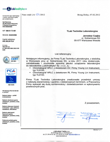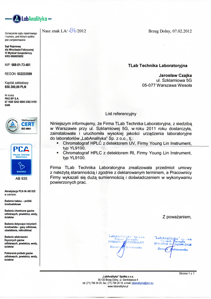 —@LabAnalityka = Oznaczenie sadu rejestrowego Nasz znak L A / A3k /2012 Brzeg Dolny, 07.02.2012 i numeru, pod ktorym spotka jest zarejestrowana: Sa^d Rejonowy dla Wroctawia-Fabrycznej VI Wydziat Gospodarczy KRS 0000055852 TLab Technika Laboratoryjna NIP: 988-01-73-481 Jarostaw Czajka REGON: 932233599 ul. Szklarniowa 5G 05-077 Warszawa Wesota Kapitat zaktadowy: 650.300,00 PLN Nr konta: PKO BP S.A. 67 1020 5242 0000 2302 0155 6349 List referencyjny i X \T \,.„..> ,S09001 AB 935 Niniejszym informujemy, ze Firma TLab Technika Laboratoryjna, z siedziba, w Warszawie przy ul. Szklarniowej 5G, w roku 2011 roku dostarczyta, zainstalowala i uruchomita wysokiej jakosci urzadzenia laboratoryjne do laboratoriow „LabAnalityka" Sp. z o.o., tj.: • Chromatograf HPLC z detektorem UV, Firmy Young Lin Instrument, typ YL9100, • Chromatograf HPLC z detektorem Rl, Firmy Young Lin Instrument, typ YL9100. Firma TLab Technika Laboratoryjna zrealizowata przedmiot umowy z nalezyta. starannosciaj zgodnie z deklarowanym terminem, a Pracownicy Firmy wykazali siQ duza. sumiennoscia. i doswiadczeniem w wykonywaniu powierzonych prac. Akredytacja PC A Nr AB 935 w zakresie: Badanla hatasu - probki srodowiskowe Badania chemlczne gazow o d l o t o w y c h , powietrza, wody, Z powazaniem, sciekow Badania dotycza.ce inzynierii srodowiska - gazy odlotowe, oswietlenie, mikroklimat Badania wlasciwosci fizycznych gazow o d l o t o w y c h , powietrza, wody, sciekow LabAn «I j tyk a Sp. z o.o. Prezes Vfarza,du DYREKTC ±W',ENERALNY Kami i LdbAnaIity/i£." Hzlonek DYKKKTOB fearzadu • o.o. D>/BA0AWCZYCH Doro/a Molozowska Pobieranie probek gazow o d l o t o w y c h , powietrza, wody, sciekow Strona 1 z 1 ..LabAnalityka" Spotka z o.o. 56-120 Brzeg Dolny, ul. Sienkiewicza 4 tel.:(71) 794 34 25, fax.: (71) 794 24 19, e-mail: [email protected] www.labanalityka.pl