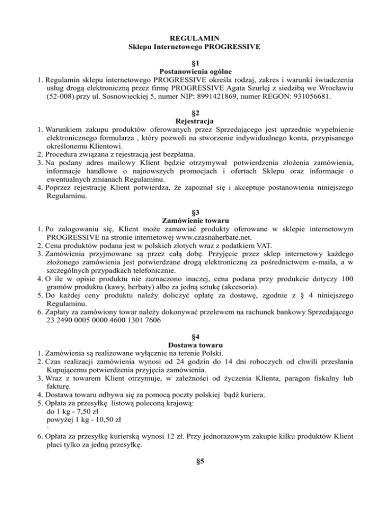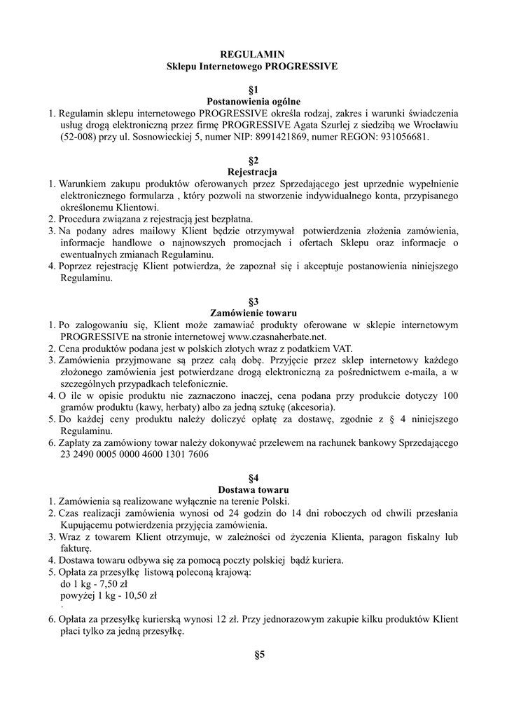 REGULAMIN Sklepu Internetowego PROGRESSIVE §1 Postanowienia ogólne 1. Regulamin sklepu internetowego PROGRESSIVE określa rodzaj, zakres i warunki świadczenia usług drogą elektroniczną przez firmę PROGRESSIVE Agata Szurlej z siedzibą we Wrocławiu (52-008) przy ul. Sosnowieckiej 5, numer NIP: 8991421869, numer REGON: 931056681. §2 Rejestracja 1. Warunkiem zakupu produktów oferowanych przez Sprzedającego jest uprzednie wypełnienie elektronicznego formularza , który pozwoli na stworzenie indywidualnego konta, przypisanego określonemu Klientowi. 2. Procedura związana z rejestracją jest bezpłatna. 3. Na podany adres mailowy Klient będzie otrzymywał potwierdzenia złożenia zamówienia, informacje handlowe o najnowszych promocjach i ofertach Sklepu oraz informacje o ewentualnych zmianach Regulaminu. 4. Poprzez rejestrację Klient potwierdza, że zapoznał się i akceptuje postanowienia niniejszego Regulaminu. §3 Zamówienie towaru 1. Po zalogowaniu się, Klient może zamawiać produkty oferowane w sklepie internetowym PROGRESSIVE na stronie internetowej www.czasnaherbate.net. 2. Cena produktów podana jest w polskich złotych wraz z podatkiem VAT. 3. Zamówienia przyjmowane są przez całą dobę. Przyjęcie przez sklep internetowy każdego złożonego zamówienia jest potwierdzane drogą elektroniczną za pośrednictwem e-maila, a w szczególnych przypadkach telefonicznie. 4. O ile w opisie produktu nie zaznaczono inaczej, cena podana przy produkcie dotyczy 100 gramów produktu (kawy, herbaty) albo za jedną sztukę (akcesoria). 5. Do każdej ceny produktu należy doliczyć opłatę za dostawę, zgodnie z § 4 niniejszego Regulaminu. 6. Zapłaty za zamówiony towar należy dokonywać przelewem na rachunek bankowy Sprzedającego 23 2490 0005 0000 4600 1301 7606 §4 Dostawa towaru 1. Zamówienia są realizowane wyłącznie na terenie Polski. 2. Czas realizacji zamówienia wynosi od 24 godzin do 14 dni roboczych od chwili przesłania Kupującemu potwierdzenia przyjęcia zamówienia. 3. Wraz z towarem Klient otrzymuje, w zależności od życzenia Klienta, paragon fiskalny lub fakturę. 4. Dostawa towaru odbywa się za pomocą poczty polskiej bądź kuriera. 5. Opłata za przesyłkę listową poleconą krajową: do 1 kg - 7,50 zł powyżej 1 kg - 10,50 zł · 6. Opłata za przesyłkę kurierską wynosi 12 zł. Przy jednorazowym zakupie kilku produktów Klient płaci tylko za jedną przesyłkę. §5 Postępowanie reklamacyjne 1. Podstawą przyjęcia reklamacji jest okazanie dowodu zakupu, np. paragon fiskalny , faktura, potwierdzenie przelewu oraz wypełnienie zgłoszenia reklamacyjnego. 2. Zgłoszenia reklamacyjne należy kierować pod adres: PROGRESSIVE Agata Szurlej z siedzibą we Wrocławiu (52-008) przy ul. Sosnowieckiej 5. 3. Wzór zgłoszenia reklamacyjnego stanowi załącznik do niniejszego Regulaminu. 4. Sprzedawca w ciągu 14 dni od daty otrzymania zgłoszenia reklamacyjnego powiadomi Klienta o sposobie jego rozpatrzenia. 5. Reklamacje zgłoszone po upływie terminu przydatności do spożycia nie będą uwzględniane. 6. Sprzedawca ponosi koszty związane z dostarczeniem reklamowanego towaru do siedziby Sprzedającego. §6 Odstąpienie od umowy 1. Klient, będący konsumentem w rozumieniu art. 22 1 Kodeksu Cywilnego, ma prawo do odstąpienia od zawartej umowy bez podania przyczyny, w terminie 10 dni licząc od wydania towaru. 2. W przypadku odstąpienia przez Klienta od umowy, zwrot tego co strony świadczyły sobie nawzajem, powinien nastąpić niezwłocznie, nie później niż w terminie 14 dni. Zwrotu należy dokonać na adres: PROGRESSIVE Agata Szurlej z siedzibą we Wrocławiu (52-008) przy ul. Sosnowieckiej 5. 3. Klient ponosi koszty związane z dostarczeniem towaru do siedziby Sprzedającego. 4. Odstąpienie od umowy w zakresie produktów spożywczych, jest możliwe jedynie w przypadku, gdy oryginalne opakowanie produktu jest nienaruszone. §7 Postanowienia końcowe 1. W zakresie nie uregulowanym niniejszym Regulaminem mają zastosowanie: Kodeks cywilny z dnia 23 kwietnia 1964 roku (Dz. U. 16, poz. 93 ze zm.), ustawa z dnia 18 lipca 2002 roku o świadczeniu usług drogą elektroniczną (Dz. U. Nr 144, poz. 1204 ze zm.), ustawa z dnia 2 marca 2000 roku o ochronie niektórych praw konsumentów oraz o odpowiedzialności za szkodę wyrządzoną przez produkt niebezpieczny (Dz. U. Nr 22, poz. 271 ze zm.), ustawa z dnia 27 lipca 2002 roku o szczególnych warunkach sprzedaży konsumenckiej oraz o zmianie Kodeksu cywilnego (Dz. U. Nr 141, poz. 1176 ze zm.), ustawa z dnia 29 sierpnia 1997 roku o ochronie danych osobowych (Dz. U. Nr 133, poz. 883 ze zm.), rozporządzenie Ministra Gospodarki, Pracy i Polityki Społecznej z dnia 30 stycznia 2003 roku w sprawie terminów zawiadamiania sprzedawcy o stwierdzeniu niezgodności towaru żywnościowego z umową (Dz. U. Nr 31, poz. 258) oraz inne obowiązujące w tym zakresie przepisy prawa polskiego. 2. Wszelkie spory mogące wyniknąć z tytułu zawarcia umowy ze Sprzedającym będą rozstrzygane przez Sąd Powszechny. 3. Wszelkie uwagi bądź pytania odnośnie zamówienia oferowanych produktów prosimy kierować na adres [email protected] bądź telefonicznie pod numerem +48 605 727 222 (opłata według cennika właściwego operatora)