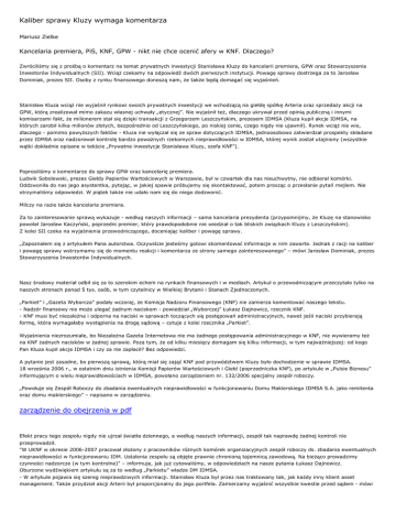 Kaliber sprawy Kluzy wymaga komentarza Mariusz Zielke Kancelaria premiera, PiS, KNF, GPW - nikt nie chce ocenić afery w KNF. Dlaczego? Zwróciliśmy się z prośbą o komentarz na temat prywatnych inwestycji Stanisława Kluzy do kancelarii premiera, GPW oraz Stowarzyszenia Inwestorów Indywidualnych (SII). Wciąż czekamy na odpowiedź dwóch pierwszych instytucji. Powagę sprawy dostrzega za to Jarosław Dominiak, prezes SII. Osoby z rynku finansowego donoszą nam, że także będą domagać się wyjaśnień. Stanisław Kluza wciąż nie wyjaśnił rynkowi swoich prywatnych inwestycji we wchodzącą na giełdę spółkę Arteria oraz sprzedaży akcji na GPW, którą zrealizował mimo zakazu własnej uchwały „etycznej”. Nie wyjaśnił też, dlaczego ukrywał przed opinią publiczną i innymi komisarzami fakt, że milionerem stał się dzięki transakcji z Grzegorzem Leszczyńskim, prezesem IDMSA (Kluza kupił akcje IDMSA, na których zarobił kilka milionów złotych, bezpośrednio od Leszczyńskiego, po niskiej cenie, czego nigdy nie ujawnił). Rynek wciąż nie wie, dlaczego - pomimo powyższych faktów - Kluza nie wyłączał się ze spraw dotyczących IDMSA, jednoosobowo zatwierdzał prospekty składane przez IDMSA oraz nadzorował kontrolę bardzo poważnych rzekomych nieprawidłowości w IDMSA, której wynik został utajniony (wszystkie wątki dokładnie opisane w tekście „Prywatne inwestycje Stanisława Kluzy, szefa KNF”). Poprosiliśmy o komentarze do sprawy GPW oraz kancelarię premiera. Ludwik Sobolewski, prezes Giełdy Papierów Wartościowych w Warszawie, był w czwartek dla nas nieuchwytny, nie odbierał komórki. Oddzwoniła do nas jego asystentka, pytając, w jakiej spawie próbujemy się skontaktować, potem prosząc o przesłanie pytań mejlem. Nie otrzymaliśmy odpowiedzi. W piątek także nie udało nam się do niego dodzwonić. Milczy na razie także kancelaria premiera. Za to zainteresowanie sprawą wykazuje - według naszych informacji – sama kancelaria prezydenta (przypomnijmy, że Kluzę na stanowisko powołał Jarosław Kaczyński, poprzedni premier, który prawdopodobnie nie wiedział o tak bliskich związkach Kluzy z Leszczyńskim). Z kolei SII czeka na wyjaśnienia przewodniczącego, doceniając kaliber i powagę sprawy. „Zapoznałem się z artykułem Pana autorstwa. Oczywiście jesteśmy gotowi skomentować informacje w nim zawarte. Jednak z racji na kaliber i powagę sprawy wstrzymamy się do momentu reakcji i komentarza ze strony samego zainteresowanego” – mówi Jarosław Dominiak, prezes Stowarzyszenia Inwestorów Indywidualnych. Nasz środowy materiał odbił się za to szerokim echem na rynkach finansowych i w mediach. Artykuł o przewodniczącym przeczytało tylko na naszych stronach ponad 5 tys. osób, w tym czytelnicy w Wielkiej Brytanii i Stanach Zjednoczonych. „Parkiet” i „Gazeta Wyborcza” podały wczoraj, że Komisja Nadzoru Finansowego (KNF) nie zamierza komentować naszego tekstu. - Nadzór finansowy nie może ulegać żadnym naciskom - powiedział „Wyborczej” Łukasz Dajnowicz, rzecznik KNF. - KNF musi być niezależna i odporna na naciski w sprawach toczących się postępowań administracyjnych, nawet jeśli naciski przybierają formę, która wymagałaby wystąpienia na drogę sądową – cytuje z kolei rzecznika „Parkiet”. Wyjaśnienia niezrozumiałe, bo Niezależna Gazeta Internetowa nie ma żadnego postępowania administracyjnego w KNF, nie wywieramy też na KNF żadnych nacisków w żadnej sprawie. Poza tym, że od kilku miesięcy domagam się kilku informacji, w tym najważniejszej: od kogo Pan Kluza kupił akcje IDMSA i czy za nie zapłacił? Bez odpowiedzi. A pytanie jest zasadne, bo pierwszą sprawą, którą miał się zająć KNF pod przywództwem Kluzy było dochodzenie w sprawie IDMSA. 18 września 2006 r., w ostatnim dniu istnienia Komisji Papierów Wartościowych i Giełd (poprzedniczka KNF), po artykule w „Pulsie Biznesu” informującym o wielu nieprawidłowościach w IDMSA, powołano zarządzeniem nr. 132/2006 specjalny zespół roboczy. „Powołuje się Zespół Roboczy do zbadania ewentualnych nieprawidłowości w funkcjonowaniu Domu Maklerskiego IDMSA S.A. jako remitenta oraz domu maklerskiego” – napisano w zarządzeniu. zarządzenie do obejrzenia w pdf Efekt pracy tego zespołu nigdy nie ujrzał światła dziennego, a według naszych informacji, zespół tak naprawdę żadnej kontroli nie przeprowadził. "W UKNF w okresie 2006-2007 pracował złożony z pracowników różnych komórek organizacyjnych zespół roboczy ds. zbadania ewentualnych nieprawidłowości w funkcjonowaniu IDM. Ustalenia zespołu są objęte prawnie chronioną tajemnicą zawodową. Na bieżąco prowadzimy czynności nadzorcze (w tym kontrolne)" – informuje, jak już cytowaliśmy, w odpowiedziach na nasze pytania Łukasz Dajnowicz. Oburzone wydźwiękiem artykułu są za to według „Parkietu” władze DM IDMSA. - W artykule pojawia się szereg nieprawdziwych informacji. Stanisław Kluza był przez nas traktowany tak, jak każdy inny klient asset management. Także przydział akcji Arterii był proporcjonalny do jego portfela. Zamierzamy wyjaśnić wszystkie kwestie przed sądem - mówi Grzegorz Leszczyński, prezes brokera w wypowiedzi dla „Parkietu”. Niezależnej Gazecie Internetowej prezes Leszczyński przed publikacją artykułu nie chciał udzielić komentarza i nie odpowiedział na nasze pytania. Dostaliśmy informację o bardzo negatywnym odbiorze zachowania przewodniczącego (i jego milczenia) na rynku finansowym. - Wcześniej czy później przewodniczący będzie musiał zabrać głos - mówi nam jeden z naszych rozmówców, prezes dużej spółki. W poniedziałek ujawnimy kolejne bulwersujące infromacje, tym razem o działalności innych urzędników KNF oraz tuszowaniu podejrzanych spraw. Zaktualizowany: 12.07.2009 3 lipca 2009 19:19