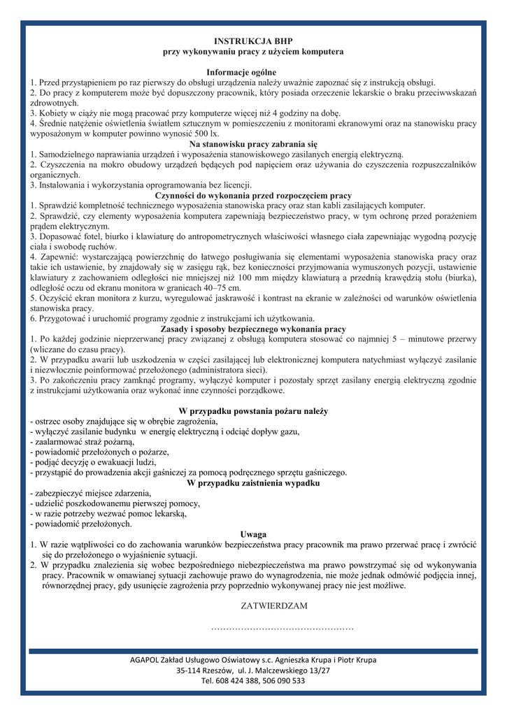 INSTRUKCJA BHP przy wykonywaniu pracy z użyciem komputera Informacje ogólne 1. Przed przystąpieniem po raz pierwszy do obsługi urządzenia należy uważnie zapoznać się z instrukcją obsługi. 2. Do pracy z komputerem może być dopuszczony pracownik, który posiada orzeczenie lekarskie o braku przeciwwskazań zdrowotnych. 3. Kobiety w ciąży nie mogą pracować przy komputerze więcej niż 4 godziny na dobę. 4. Średnie natężenie oświetlenia światłem sztucznym w pomieszczeniu z monitorami ekranowymi oraz na stanowisku pracy wyposażonym w komputer powinno wynosić 500 lx. Na stanowisku pracy zabrania się 1. Samodzielnego naprawiania urządzeń i wyposażenia stanowiskowego zasilanych energią elektryczną. 2. Czyszczenia na mokro obudowy urządzeń będących pod napięciem oraz używania do czyszczenia rozpuszczalników organicznych. 3. Instalowania i wykorzystania oprogramowania bez licencji. Czynności do wykonania przed rozpoczęciem pracy 1. Sprawdzić kompletność technicznego wyposażenia stanowiska pracy oraz stan kabli zasilających komputer. 2. Sprawdzić, czy elementy wyposażenia komputera zapewniają bezpieczeństwo pracy, w tym ochronę przed porażeniem prądem elektrycznym. 3. Dopasować fotel, biurko i klawiaturę do antropometrycznych właściwości własnego ciała zapewniając wygodną pozycję ciała i swobodę ruchów. 4. Zapewnić: wystarczającą powierzchnię do łatwego posługiwania się elementami wyposażenia stanowiska pracy oraz takie ich ustawienie, by znajdowały się w zasięgu rąk, bez konieczności przyjmowania wymuszonych pozycji, ustawienie klawiatury z zachowaniem odległości nie mniejszej niż 100 mm między klawiaturą a przednią krawędzią stołu (biurka), odległość oczu od ekranu monitora w granicach 40–75 cm. 5. Oczyścić ekran monitora z kurzu, wyregulować jaskrawość i kontrast na ekranie w zależności od warunków oświetlenia stanowiska pracy. 6. Przygotować i uruchomić programy zgodnie z instrukcjami ich użytkowania. Zasady i sposoby bezpiecznego wykonania pracy 1. Po każdej godzinie nieprzerwanej pracy związanej z obsługą komputera stosować co najmniej 5 – minutowe przerwy (wliczane do czasu pracy). 2. W przypadku awarii lub uszkodzenia w części zasilającej lub elektronicznej komputera natychmiast wyłączyć zasilanie i niezwłocznie poinformować przełożonego (administratora sieci). 3. Po zakończeniu pracy zamknąć programy, wyłączyć komputer i pozostały sprzęt zasilany energią elektryczną zgodnie z instrukcjami użytkowania oraz wykonać inne czynności porządkowe. W przypadku powstania pożaru należy - ostrzec osoby znajdujące się w obrębie zagrożenia, - wyłączyć zasilanie budynku w energię elektryczną i odciąć dopływ gazu, - zaalarmować straż pożarną, - powiadomić przełożonych o pożarze, - podjąć decyzję o ewakuacji ludzi, - przystąpić do prowadzenia akcji gaśniczej za pomocą podręcznego sprzętu gaśniczego. W przypadku zaistnienia wypadku - zabezpieczyć miejsce zdarzenia, - udzielić poszkodowanemu pierwszej pomocy, - w razie potrzeby wezwać pomoc lekarską, - powiadomić przełożonych. Uwaga 1. W razie wątpliwości co do zachowania warunków bezpieczeństwa pracy pracownik ma prawo przerwać pracę i zwrócić się do przełożonego o wyjaśnienie sytuacji. 2. W przypadku znalezienia się wobec bezpośredniego niebezpieczeństwa ma prawo powstrzymać się od wykonywania pracy. Pracownik w omawianej sytuacji zachowuje prawo do wynagrodzenia, nie może jednak odmówić podjęcia innej, równorzędnej pracy, gdy usunięcie zagrożenia przy poprzednio wykonywanej pracy nie jest możliwe. ZATWIERDZAM ………………………………………… AGAPOL Zakład Usługowo Oświatowy s.c. Agnieszka Krupa i Piotr Krupa 35-114 Rzeszów, ul. J. Malczewskiego 13/27 Tel. 608 424 388, 506 090 533