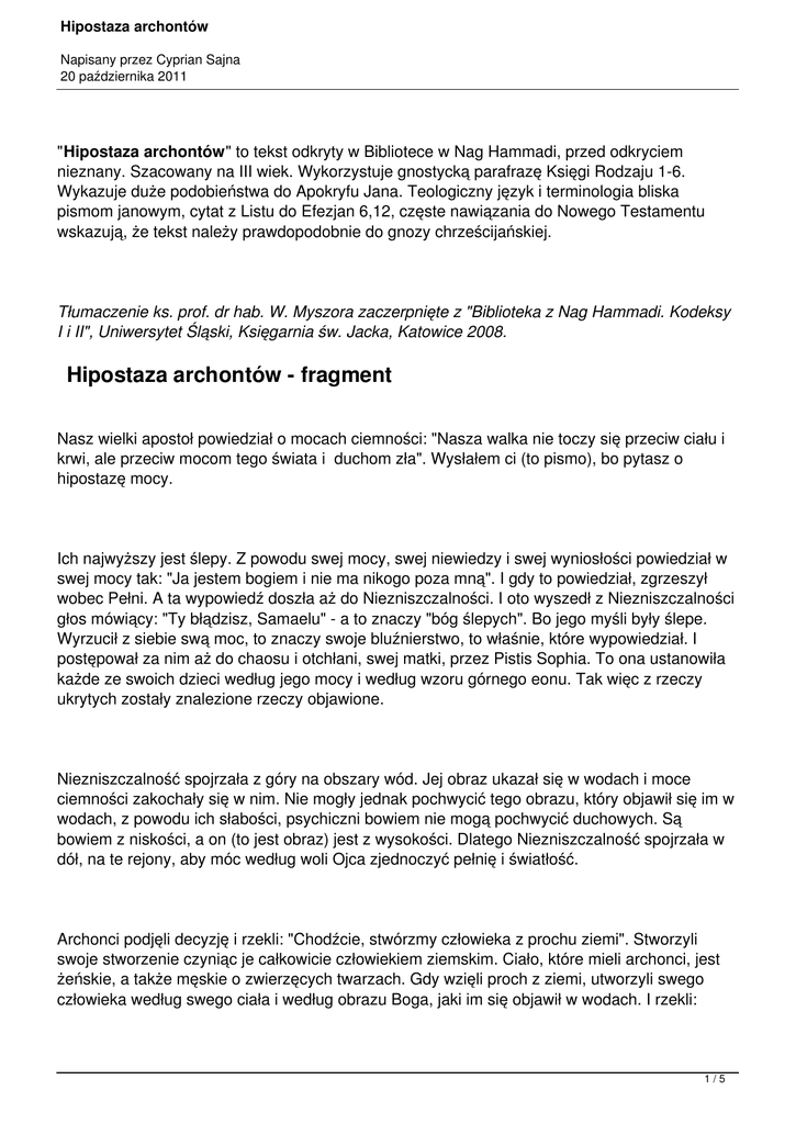 "Hipostaza archontów" to tekst odkryty w Bibliotece w Nag Hammadi, przed odkryciem
