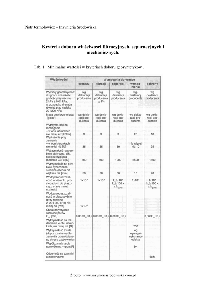 Piotr Jermołowicz – Inżynieria Środowiska Kryteria doboru właściwości filtracyjnych, separacyjnych i mechanicznych. Tab. 1. Minimalne wartości w kryteriach doboru geosyntetyków . Źródło: www.inzynieriasrodowiska.com.pl W zależności od zastosowania – materiały geosyntetyczne muszą spełniać odpowiednie kryteria dotyczące właściwości hydraulicznych i mechanicznych- ich minimalne wartości zestawiono w tablicy 4. Kryterium dotyczące właściwości hydraulicznych gwarantuje, że geosyntetyki będą pełnić funkcje drenażowe lub filtracyjne w trakcie projektowanego okresu eksploatacji. Są to kryteria : • zatrzymywania cząstek gruntu, • przepuszczalności i odporności na kolmatację. Kryterium dotyczące właściwości mechanicznych gwarantuje zachowanie struktury geosyntetyków zarówno podczas instalacji jak i w całym projektowanym okresie eksploatacji. Kryterium to obejmuje : • wytrzymałość mechaniczną z uwagi na rozciąganie i przebicie. 1. Kryterium zatrzymywania cząstek gruntu. Zasada nieprzenikania cząstek gruntu polega na zatrzymywaniu dostatecznej ich ilości , a więc stworzenia stałego progu zapobiegającego migracji cząstek przy zachowaniu projektowanej sprawności filtra. Już w 1985 r. przedstawiono koncepcję pracy filtra, według której pewna ilość cząstek gruntu może przenikać przez geosyntetyki. Ma to na celu zminimalizowanie zatykania się filtra. W tablicy 2 przedstawiono różne kryteria przyjmowane dla geosyntetyków w przypadku przepływu laminarnego. Odrębnym tematem są przepływy burzliwe w kanałach otwartych. Podstawową wadą wszystkich proponowanych kryteriów jest to, że odnoszą się do charakterystycznej wielkości porów danego produktu, a nie całkowitej struktury. Zatem za niepoprawne należy uznać przyjmowanie wyłącznie kryterium zatrzymywania cząstek i kryterium przepuszczalności jako wystarczających wymagań projektowych. Przed przyjęciem danego sposobu określania zatrzymywania projektant powinien sprawdzić założenia i podstawy mechanizmu zatrzymywania oraz zgodność ze specyfikacją warunków późniejszej pracy. Nadal aktualnym problemem pozostaje określenie charakterystycznej wielkości porów. W projektowaniu często przyjmuje się, że geosyntetyki powinny mieć przepuszczalność dziesięciokrotnie większą od przepuszczalności gruntu ze względu na stosunkowo małą ich grubość w porównaniu z filtrowanym gruntem. Źródło: www.inzynieriasrodowiska.com.pl Tab. 2. Kryteria retencyjności-zatrzymywania cząstek gruntu dla geosyntetyków (jednokierunkowy przepływ ).[3] Źródło: www.inzynieriasrodowiska.com.pl 2. Kryterium przepuszczalności. Tab.3. Kryteria przepuszczalności dla geosyntetyków. [3]. Najczęściej stosowane kryteria przepuszczalności przedstawiono w tablicy 3. Przyjmuje się w nich, że geosyntetyki muszą mieć odpowiednią przepuszczalność w celu zabezpieczenia przed nadmiernym wzrostem ciśnienia wody w porach i do utrzymania odpowiedniego przepływu. 3. Kryterium odporności na kolmatację. Kolmatacja występuje, gdy drobne cząstki gruntu penetrując w głąb geosyntetyków, powodują spadek ich przepuszczalności. Kolmatacja zależy od relacji między ziarnami i cząstkami w gruncie i ich zdolności blokowania porów w geosyntetykach. Wypełnienie większości porów cząstkami gruntu spowoduje znaczną redukcję przepuszczalności i objętości przepływu, a tym samym możemy uzyskać niejednokrotnie efekt quasi geomembrany ( folii – materiał nieprzepuszczalny ). Geosyntetyki nawet o małej porowatości będą bardziej przepuszczalne niż grunt, szczególnie drobnoziarnisty. Źródło: www.inzynieriasrodowiska.com.pl Tab.4. Kryteria odporności na kolmatację. [3] Rys.1. Kryteria retencyjności według różnych autorów dla materiałów tkanych i igłowanych. [2] Źródło: www.inzynieriasrodowiska.com.pl Rys.2. Kryteria retencyjności według różnych autorów dla materiałów tkanych i igłowanych. [2] W tablicy 4 przedstawiono istniejące zalecenia dotyczące oceny podatności geofiltrów na kolmatację. W trudnych warunkach gruntowo-wodnych należy wykonać odpowiednie badania filtracji na próbkach gruntu pobranych w miejscu wbudowania. 4. Klasyfikacja geosyntetyków dla warstw separacyjnych i filtrów. W analizowanym systemie klasyfikacji BS 8006 [7], klasy wytrzymałości określa się na podstawie wymaganej wytrzymałości na rozciąganie przy określonym odkształceniu materiału ( tab.5 ) . Źródło: www.inzynieriasrodowiska.com.pl Tab. 5. Klasyfikacja warstw separacyjnych i filtracyjnych z geosyntetyków ze względu na ich właściwości mechaniczne. [1] Tab. 6. Klasyfikacja warstw separacyjnych i filtracyjnych z geosyntetyków ze względu na ich właściwości hydrauliczne [1] Inną propozycję przyporządkowania klas wytrzymałości geosyntetyków zawarto w „Wytycznych ...”[31]. Klasy wytrzymałości określa się na podstawie rodzaju materiału, masy powierzchniowej oraz maksymalnej siły rozciągającej dla materiałów o wyższej wytrzymałości na rozciąganie ( tkaniny, dzianiny ) lub siły ścinającej z badania CBR dla materiałów o dużej odkształcalności. Klasyfikację tę przedstawiono w tablicy 7. Źródło: www.inzynieriasrodowiska.com.pl t – grubość materiału, mierzona pod naprężeniem ściskającym 2 kN/m2, O90 – wymiar O90 wielkości porów geowłókniny Gdy przepuszczalność kg samej włókniny jest mierzona przy działaniu naprężenia ściskającego, zbliżonego do występującego w konstrukcji, to należy zastosować współczynnik redukcyjny dla włóknin ηn i wówczas otrzymamy ηn kg > ks Wartość ηn można wyznaczyć z rys. 12, w zależności od wartości parametru kg2/ n t O90. W odniesieniu do geowłóknin stosuje się dodatkowe kryterium, stanowiące górne ograniczenie wartości współczynnika ηn w przypadkach, gdy rozmiar O90 jest mały w porównaniu do cząstek gruntu. Można je wyraz