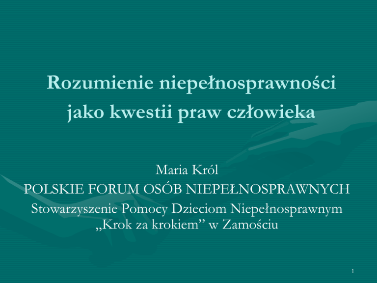 Rozumienie niepełnosprawności jako kwestii praw człowieka Maria Król POLSKIE FORUM OSÓB NIEPEŁNOSPRAWNYCH Stowarzyszenie Pomocy Dzieciom Niepełnosprawnym „Krok za krokiem” w Zamościu 1 Konwencja ONZ/Preambuła/ Przyrodzona godność i wartość oraz równe i niezbywalne prawa wszystkich członków rodziny ludzkiej jako podstawa wolności, sprawiedliwości i pokoju na świecie. 2 Konwencja ONZ /Preambuła/ Uznanie znaczenia dla osób niepełnosprawnych: samodzielności niezależności wolności dokonywania wyborów 3 Konwencja ONZ /Art.1/ Cel: popieranie, ochrona i zapewnienie pełnego i równego korzystania ze wszystkich praw człowieka i podstawowych wolności przez wszystkie osoby niepełnosprawne oraz popieranie poszanowania ich przyrodzonej godności. 4 Dyskryminacja ze względu na niepełnosprawność Jakiekolwiek różnicowanie, wykluczanie lub ograniczanie ze względu na niepełnosprawność, którego celem lub skutkiem jest naruszenie lub zniweczenie uznania, korzystania z lub wykonywania wszelkich praw człowieka i podstawowych wolności w dziedzinie polityki, gospodarki, społecznej, kulturalnej, obywatelskiej lub w jakiejkolwiek innej, na zasadzie równości z innymi osobami. Obejmuje to wszelkie przejawy dyskryminacji, w tym odmowę racjonalnego usprawnienia. 5 Świadomość społeczna (Art.8) ROZUMIENIE NIEPEŁNOSPRAWNOŚCI jako kwestii PRAW CZŁOWIEKA (według „Monitoring Konwencji o prawach osób niepełnosprawnych”, ONZ, New York i Genewa, 2010,) 6 Od pacjenta do obywatela • Model medyczny (podejście medyczne, rehabilitacyjne, opiekuńcze, charytatywne - obiekt pomocy charytatywnej, socjalnej, medycznej - pacjent) • MODEL BIOPSYCHOSPOłECZNY • Model społeczny (podejście ze względu na prawa człowieka i odpowiedzialność społeczeństwa za modyfikację środowiska – posiadacz praw, obywatel) 7 PODEJŚCIE CHARYTATYWNE PODEJŚCIE ZE WZGLĘDU NA PRAWA CZŁOWIEKA Fakultatywne Obligatoryjne Pod kontrolą Autonomiczne Pozbawianie wpływu Posiadanie wpływu Zorientowane na dysfunkcje obiektu Zorientowane na bariery lub brak ułatwień w środowisku 8 PODEJŚCIE CHARYTATYWNE PODEJŚCIE ZE WZGLĘDU NA PRAWA CZŁOWIEKA Ograniczające aktywność Ułatwiające aktywność Upokarzające Z poszanowaniem godności Zależność Niezależność 9 PODEJŚCIE CHARYTATYWNE PODEJŚCIE ZE WZGLĘDU NA PRAWA CZŁOWIEKA Równość praw i szans Dyskryminacja Instytucjonalizacja usług Usługi włączające w środowisku lokalnym Integracja Segregacja OD PACJENTA DO OBYWATELA 10 Niepełnosprawność - pojęcie ewoluujące Wynik interakcji między osobami z dysfunkcjami a barierami środowiskowymi, w tym wynikającymi z postaw ludzkich, które utrudniają tym osobom pełny i skuteczny udział w życiu społeczeństwa, na zasadzie równości z innymi osobami Osoba NIEPEŁNOSPRAWNOŚĆ Bariery Definicje niepełnosprawności w Konwencji ONZ wywodzą się z ICF. 11 Społeczna odpowiedzialność „Na całym społeczeństwie spoczywa zbiorowa odpowiedzialność za dokonanie modyfikacji środowiska koniecznej dla pełnego uczestniczenia ludzi niepełnosprawnych we wszystkich dziedzinach życia społecznego” (ICF, WHO, 2001). 12 Dostępność (Art.9) • Dostępność jest warunkiem wstępnym uczestniczenia w życiu społecznym i gospodarczym. Oznacza, że osoby niepełnosprawne mają dostęp, na równych prawach z innymi, do środowiska fizycznego, transportu, technologii i systemów informacyjno- komunikacyjnych oraz pozostałych obiektów i usług. Znaczenie włączania kwestii niepełnosprawności do odpowiednich strategii zrównoważonego rozwoju, jako ich integralnej części. Universal design, racjonalne usprawnienia 13 Samodzielne życie osób z niepełnosprawnością (Art.19) • Zapewnienie prawa samodzielnego wyboru sposobu życia i miejsca zamieszkania, w tym podjęcia decyzji co do tego, gdzie i z kim będą mieszkać, bez zobowiązywania do mieszkania w szczególnych warunkach (prawo dokonywania takich samych wyborów, na równi z innymi osobami) dom rodzinny ze wsparciem asystenta, wspierane mieszkalnictwo, mieszkania chronione 14 Usługi wsparcia (Art.19) • Dostęp do szerokiego zakresu usług świadczonych w domu, miejscu zamieszkania i innych usług świadczonych w ramach społeczności lokalnej, w szczególności dla osób wymagających wysokiego poziomu wsparcia Asystent osobisty 15 Artykuł 31 Statystyka i zbieranie danych • Państwa Strony zobowiązują się zbierać odpowiednie informacje, w tym dane statystyczne i wyniki badań, które umożliwią im kształtowanie i realizowanie polityki służącej wykonywaniu konwencji . Gromadzenie danych z wielowymiarowego obszaru niepełnosprawności jest warunkiem koniecznym dobrego rządzenia. • ICF, ICF-CY jako ramy standaryzacji 16 Wyzwania w szkolnictwie i edukacji • Kształcenie specjalistów (w tym nauczycieli, lekarzy, fizjoterapeutów, psychologów rehabilitacji, ergoterapeutów, itp.) • Rozszerzenie programów kształcenia o zagadnienia społeczne, etyczne, znajomość urządzeń i technologii wspomagających, zaprojektowanych dla osób niepełnosprawnych, itp. • Wprowadzenie na wszystkich kierunkach kształcenia wiedzy o zasadach udostępniania osobom niepełnosprawnym środowiska • Edukacja włączająca 17 Obowiązki ogólne (Art.4) Przy tworzeniu i wdrażaniu ustawodawstwa i polityki celem wprowadzenia w życie niniejszej konwencji, a także w toku podejmowania decyzji w zakresie spraw związanych z osobami niepełnosprawnymi, Państwa Strony będą ściśle konsultować się z osobami niepełnosprawnymi, a także angażować te osoby, w tym niepełnosprawne dzieci, w te procesy, za pośrednictwem reprezentujących je organizacji. 18