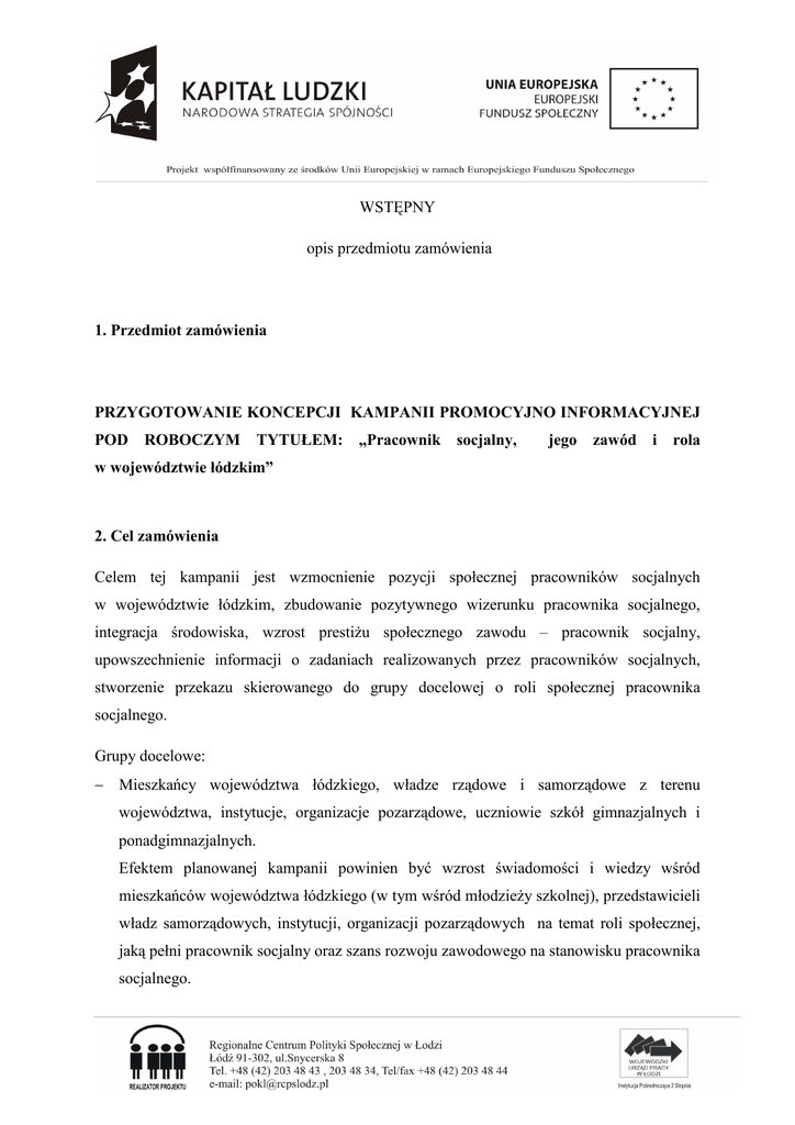 WSTĘPNY opis przedmiotu zamówienia 1. Przedmiot zamówienia PRZYGOTOWANIE KONCEPCJI KAMPANII PROMOCYJNO INFORMACYJNEJ POD ROBOCZYM TYTUŁEM: „Pracownik socjalny, jego zawód i rola w województwie łódzkim” 2. Cel zamówienia Celem tej kampanii jest wzmocnienie pozycji społecznej pracowników socjalnych w województwie łódzkim, zbudowanie pozytywnego wizerunku pracownika socjalnego, integracja środowiska, wzrost prestiżu społecznego zawodu – pracownik socjalny, upowszechnienie informacji o zadaniach realizowanych przez pracowników socjalnych, stworzenie przekazu skierowanego do grupy docelowej o roli społecznej pracownika socjalnego. Grupy docelowe: − Mieszkańcy województwa łódzkiego, władze rządowe i samorządowe z terenu województwa, instytucje, organizacje pozarządowe, uczniowie szkół gimnazjalnych i ponadgimnazjalnych. Efektem planowanej kampanii powinien być wzrost świadomości i wiedzy wśród mieszkańców województwa łódzkiego (w tym wśród młodzieży szkolnej), przedstawicieli władz samorządowych, instytucji, organizacji pozarządowych na temat roli społecznej, jaką pełni pracownik socjalny oraz szans rozwoju zawodowego na stanowisku pracownika socjalnego. 3. Przedmiot zamówienia Przygotowanie koncepcji kampanii promocyjno-informacyjnej pod roboczym tytułem: „Pracownik socjalny jego zawód i rola w województwie łódzkim” I. CELE KAMPANII 1. Głównym celem kampanii promocyjno-informacyjnej jest: Wzmocnienie pozycji społecznej pracowników socjalnych w województwie łódzkim. 2. Cele promocyjno – marketingowe kampanii, to: Zbudowanie pozytywnego wizerunku pracownika socjalnego, integracja środowiska, wzrost prestiżu społecznego zawodu – pracownik socjalny, upowszechnienie informacji o zadaniach realizowanych przez pracowników socjalnych, stworzenie przekazu skierowanego do grupy docelowej o roli społecznej pracownika socjalnego. 3. Oczekiwania wobec kampanii: Efektem planowanej kampanii powinien być wzrost świadomości i wiedzy wśród mieszkańców województwa łódzkiego (w tym wśród młodzieży szkolnej), przedstawicieli władz samorządowych, instytucji, organizacji pozarządowych na temat roli społecznej, jaką pełni pracownik socjalny oraz szans rozwoju zawodowego na stanowisku pracownika socjalnego. Kampania ma mieć zasięg regionalny oraz ma wykorzystywać takie kanały komunikacji, jak m.in. telewizja regionalna, prasa regionalna, regionalne stacje radiowe, internet lub inne. W trakcie przygotowywania kampanii niezbędne jest przestrzeganie podstawowych zasad komunikowania tj.: wiarygodności informacji, obiektywizmu, praktyczności, przystępności, łatwości identyfikacji, dostępności. II. GRUPA DOCELOWA: Władze rządowe i samorządowe z terenu województwa łódzkiego, instytucje, organizacje pozarządowe, pracownicy socjalni, uczniowie szkól gimnazjalnych i ponadgimnazjalnych. Poboczna grupa docelowa to: ogół mieszkańców województwa łódzkiego. III. PRZEKAZ Grupy docelowe mają otrzymać komunikat: „Pracownicy socjalni to osoby zaufania publicznego, posiadające wiedzę, kwalifikacje i umiejętności. Jedyna taka grupa zawodowa, która pomoże, wesprze osobę/osoby w trudnych sytuacjach życiowych /kryzysowych wynikających z: zjawisk zewnętrznych /takich jak klęski żywiołowe/, problemów społecznych /ubóstwo, bezdomność, długotrwały brak aktywności zawodowej, uzależnienia, przestępczość/, problemów rodzinnych /problemy wychowawcze i małżeńskie, uzależnienia, przemoc w rodzinie, opieka nad osobami zależnymi/. Uczniowie powinni otrzymać podstawowe informacje na temat zawodu pracownik socjalny, jego roli w życiu społecznym, możliwościach kształcenia się w tym kierunku”. IV. CZAS TRWANIA KAMPANII Kampania ma być prowadzona w 2012 roku. V. ZAKRES ZADAŃ WYKONAWCY 1. Przygotowanie koncepcji kampanii promocyjno - informacyjnej, realizowanej przez Zamawiającego, w ramach której Zamawiający oczekuje od Wykonawcy: 1) doprecyzowanie grupy docelowej kampanii i wskazanie jej wzorów konsumpcji medialnej (co oglądają, co czytają, czego słuchają), 2) opis koncepcji przeprowadzenia kampanii i założeń medialnych, tj. zaproponowanie optymalnego wykorzystania mediów jednego bądź kilku równocześnie, wraz z uzasadnieniem (telewizja regionalna, prasa regionalna, regionalne stacje radiowe, internet, outdoor, serwisy społecznościowe) ewentualnie propozycja działań niestandardowych, które będą wynikać z posiadanej wiedzy analitycznej, 2. Opracowanie logo i hasła kampanii, Wykonawca przedstawi Zamawiającemu co najmniej dwie wersje logo i hasła do akceptacji w terminie zgodnym z harmonogramem, który zostanie ustalony z wyłonionym Wykonawcą. 3. Opracowanie hasła dla dwóch konkursów realizowanych w ramach kampanii: pierwszego skierowanego do młodzieży szkolnej „Ja - jako pracownik socjalny”, oraz drugiego podzielonego na dwie kategorie tj. „Pracownik socjalny roku” oraz „Pracownik pomocy społecznej roku”. 4. Przygotowanie projektów graficznych ulotki, plakatu, ogłoszenia prasowego, roll - upu, bannera flash i buttonu na stronę internetową: a) dotyczących ogółu kampanii, b) promujących konkurs realizowany w ramach kampanii: 5. Przygotowanie i produkcja spotu reklamowego telewizyjnego i radiowego, w formacie umożliwiającym ich emisję w mediach wskazanych w koncepcji, o której mowa w ust. 1. Wykonawca jest zobowiązany do przygotowania co najmniej dwóch propozycji każdego ze spotów, zgodnie z harmonogramem. Warunkiem produkcji jest akceptacja propozycji spotu przez Zamawiającego. 6. Przygotowanie propozycji ekologicznych gadżetów promocyjnych związanych z tematem kampanii w zależności od przyjętej koncepcji i założeń, z wykorzystaniem logo i hasła kampanii. 7. Przygotowanie propozycji projektów, co najmniej 2 dla każdego z materiałów promocyjnych wskazanych w ust. 4 pkt. a i b oraz ust. 6 do akceptacji przez Za