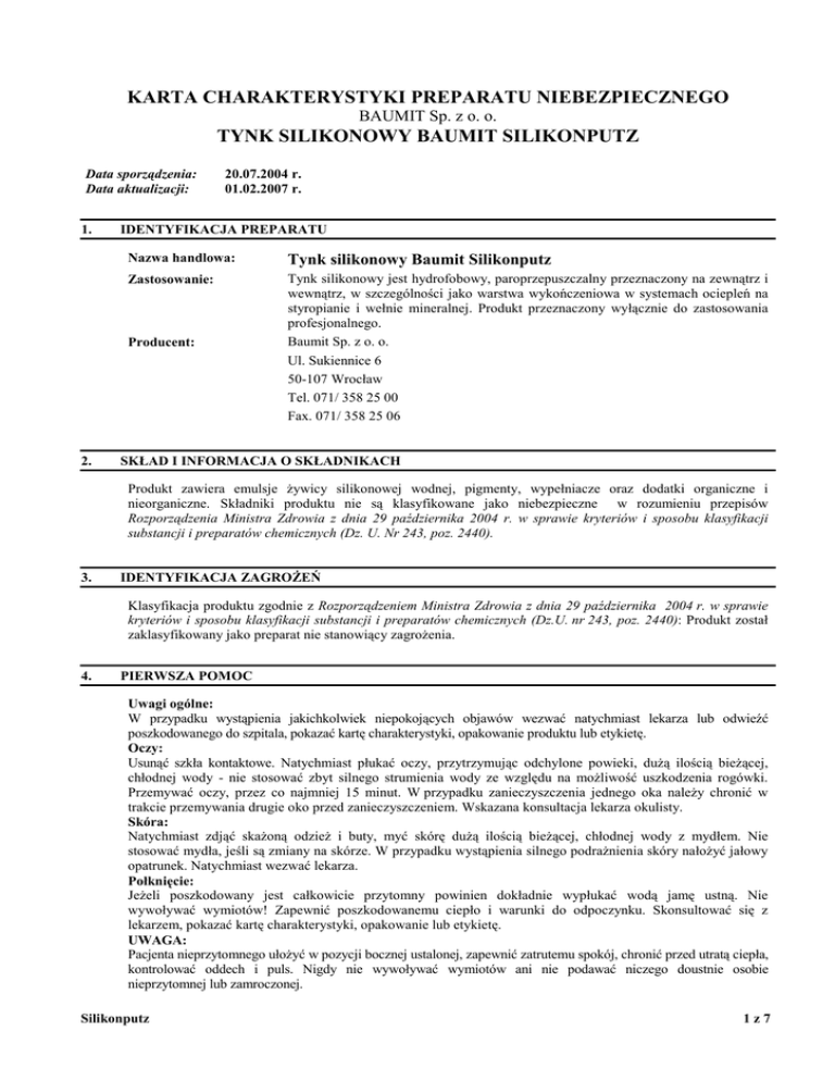 KARTA CHARAKTERYSTYKI PREPARATU NIEBEZPIECZNEGO BAUMIT Sp. z o. o. TYNK SILIKONOWY BAUMIT SILIKONPUTZ Data sporządzenia: Data aktualizacji: 1. 20.07.2004 r. 01.02.2007 r. IDENTYFIKACJA PREPARATU Nazwa handlowa: Tynk silikonowy Baumit Silikonputz Zastosowanie: Tynk silikonowy jest hydrofobowy, paroprzepuszczalny przeznaczony na zewnątrz i wewnątrz, w szczególności jako warstwa wykończeniowa w systemach ociepleń na styropianie i wełnie mineralnej. Produkt przeznaczony wyłącznie do zastosowania profesjonalnego. Baumit Sp. z o. o. Ul. Sukiennice 6 50-107 Wrocław Tel. 071/ 358 25 00 Fax. 071/ 358 25 06 Producent: 2. SKŁAD I INFORMACJA O SKŁADNIKACH Produkt zawiera emulsje Ŝywicy silikonowej wodnej, pigmenty, wypełniacze oraz dodatki organiczne i nieorganiczne. Składniki produktu nie są klasyfikowane jako niebezpieczne w rozumieniu przepisów Rozporządzenia Ministra Zdrowia z dnia 29 października 2004 r. w sprawie kryteriów i sposobu klasyfikacji substancji i preparatów chemicznych (Dz. U. Nr 243, poz. 2440). 3. IDENTYFIKACJA ZAGROśEŃ Klasyfikacja produktu zgodnie z Rozporządzeniem Ministra Zdrowia z dnia 29 października 2004 r. w sprawie kryteriów i sposobu klasyfikacji substancji i preparatów chemicznych (Dz.U. nr 243, poz. 2440): Produkt został zaklasyfikowany jako preparat nie stanowiący zagroŜenia. 4. PIERWSZA POMOC Uwagi ogólne: W przypadku wystąpienia jakichkolwiek niepokojących objawów wezwać natychmiast lekarza lub odwieźć poszkodowanego do szpitala, pokazać kartę charakterystyki, opakowanie produktu lub etykietę. Oczy: Usunąć szkła kontaktowe. Natychmiast płukać oczy, przytrzymując odchylone powieki, duŜą ilością bieŜącej, chłodnej wody - nie stosować zbyt silnego strumienia wody ze względu na moŜliwość uszkodzenia rogówki. Przemywać oczy, przez co najmniej 15 minut. W przypadku zanieczyszczenia jednego oka naleŜy chronić w trakcie przemywania drugie oko przed zanieczyszczeniem. Wskazana konsultacja lekarza okulisty. Skóra: Natychmiast zdjąć skaŜoną odzieŜ i buty, myć skórę duŜą ilością bieŜącej, chłodnej wody z mydłem. Nie stosować mydła, jeśli są zmiany na skórze. W przypadku wystąpienia silnego podraŜnienia skóry nałoŜyć jałowy opatrunek. Natychmiast wezwać lekarza. Połknięcie: JeŜeli poszkodowany jest całkowicie przytomny powinien dokładnie wypłukać wodą jamę ustną. Nie wywoływać wymiotów! Zapewnić poszkodowanemu ciepło i warunki do odpoczynku. Skonsultować się z lekarzem, pokazać kartę charakterystyki, opakowanie lub etykietę. UWAGA: Pacjenta nieprzytomnego ułoŜyć w pozycji bocznej ustalonej, zapewnić zatrutemu spokój, chronić przed utratą ciepła, kontrolować oddech i puls. Nigdy nie wywoływać wymiotów ani nie podawać niczego doustnie osobie nieprzytomnej lub zamroczonej. Silikonputz 1z7 KARTA CHARAKTERYSTYKI PREPARATU NIEBEZPIECZNEGO BAUMIT Sp. z o. o. TYNK SILIKONOWY BAUMIT SILIKONPUTZ Data sporządzenia: Data aktualizacji: 5. 20.07.2004 r. 01.02.2007 r. POSTĘPOWANIE W PRZYPADKU POśARU Produkt nie pali się i nie podtrzymuje palenia. Zalecane środki gaśnicze: Dobrać w zaleŜności od charakteru palącego się otoczenia: proszek gaśniczy, ditlenek węgla, piana gaśnicza. Nieodpowiednie środki gaśnicze: Szczególne zagroŜenie ze strony produktów spalania i wydzielających się gazów: Podczas poŜaru powstają niebezpieczne dla zdrowia pary i dymy zawierające tlenek i ditlenek węgla. Nie wdychać dymów. Specjalne wyposaŜenie ochronne straŜaków: OdzieŜ ochronna z materiałów powlekanych i aparaty izolujące drogi oddechowe niezaleŜne od otaczającego powietrza. Inne uwagi: • zawiadomić otoczenie o poŜarze, usunąć z obszaru zagroŜenia wszystkie osoby nie biorące udziału w likwidowaniu poŜaru • jeśli jest to moŜliwe bez naraŜania zdrowia lub Ŝycia ratowników usunąć z zagroŜonego obszaru zbiorniki naraŜone na działanie ognia lub wysokiej temperatury • powiadomić Państwową StraŜ PoŜarną, a w razie konieczności takŜe Policję Państwową, najbliŜsze władze terenowe i najbliŜszą jednostkę Ratownictwa Chemicznego • nie dopuścić do przedostania się wód gaśniczych do kanalizacji. 6 POSTĘPOWANIE W PRZYPADKU NIEZAMIERZONEGO UWOLNIENIA DO ŚRODOWISKA Indywidualne środki ostroŜności: Nie dopuszczać osób postronnych i nieupowaŜnionych. Unikać bezpośredniego kontaktu z produktem, zapewnić właściwą wentylację lub ochronę dróg oddechowych, stosować odpowiednie środki ochrony indywidualnej – kombinezon ochronny, buty i rękawice ochronne (patrz pkt 8). Środki ostroŜności w zakresie ochrony środowiska: Nie dopuszczać do przedostawania się produktu do wód powierzchniowych i gruntowych oraz do kanalizacji – zabezpieczyć studzienki ściekowe. W przypadku duŜego wycieku, przedostania się produktu do środowiska lub do systemu kanalizacyjnego, powiadomić odpowiednie władze i słuŜby ratownictwa chemicznego. Metody oczyszczania/usuwania: Jeśli to moŜliwe, zlikwidować wyciek (np. uszczelnić uszkodzone opakowanie, umieścić w innym szczelnym pojemniku). Uwolniony produkt ostroŜnie zebrać do właściwie oznakowanego zamykanego pojemnika i skierować do utylizacji.. Zanieczyszczone powierzchnie oczyścić mechanicznie. Zanieczyszczoną skórę umyć wodą z mydłem. Odpady usuwać zgodnie z zaleceniami przedstawionymi w pkt. 13. Szczegółowy sposób likwidacji zebranych odpadów uzgodnić z Wydziałem Ochrony Środowiska. 7. POSTĘPOWANIE Z PREPARATEM I JEGO MAGAZYNOWANIE Postępowanie z preparatem Postępować zgodnie z ogólnymi zasadami bezpieczeństwa i higieny pracy z substancjami chemicznymi; ściśle przestrzegać opracowanych procedur postępowania oraz wszelkich zaleceń producenta; Unikać bezpośredniego kontaktu produktu z oczami i ze skórą, natychmiast zdjąć zabrudzone produktem ubranie i obuwie, podczas pracy z produktem zapewnić właściwą wentylację, stosowa