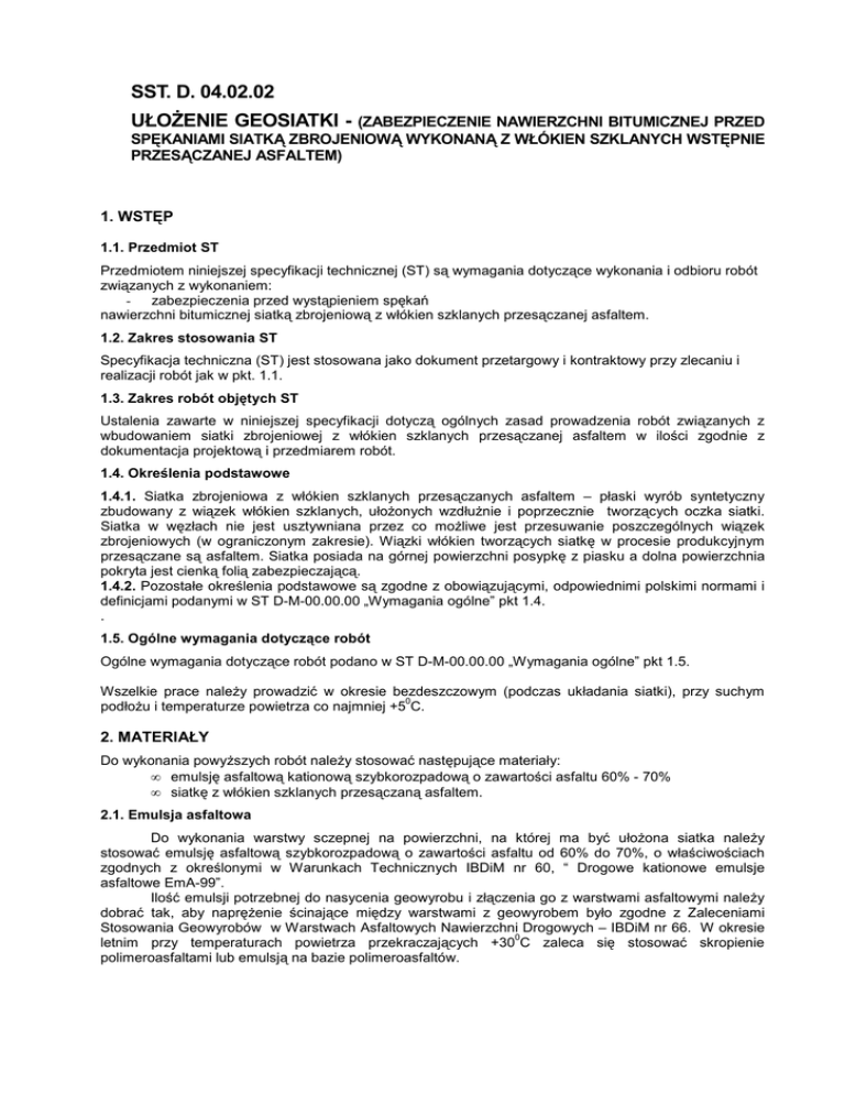 SST. D. 04.02.02 UŁOśENIE GEOSIATKI - (ZABEZPIECZENIE NAWIERZCHNI BITUMICZNEJ PRZED SPĘKANIAMI SIATKĄ ZBROJENIOWĄ WYKONANĄ Z WŁÓKIEN SZKLANYCH WSTĘPNIE PRZESĄCZANEJ ASFALTEM) 1. WSTĘP 1.1. Przedmiot ST Przedmiotem niniejszej specyfikacji technicznej (ST) są wymagania dotyczące wykonania i odbioru robót związanych z wykonaniem: - zabezpieczenia przed wystąpieniem spękań nawierzchni bitumicznej siatką zbrojeniową z włókien szklanych przesączanej asfaltem. 1.2. Zakres stosowania ST Specyfikacja techniczna (ST) jest stosowana jako dokument przetargowy i kontraktowy przy zlecaniu i realizacji robót jak w pkt. 1.1. 1.3. Zakres robót objętych ST Ustalenia zawarte w niniejszej specyfikacji dotyczą ogólnych zasad prowadzenia robót związanych z wbudowaniem siatki zbrojeniowej z włókien szklanych przesączanej asfaltem w ilości zgodnie z dokumentacja projektową i przedmiarem robót. 1.4. Określenia podstawowe 1.4.1. Siatka zbrojeniowa z włókien szklanych przesączanych asfaltem – płaski wyrób syntetyczny zbudowany z wiązek włókien szklanych, ułoŜonych wzdłuŜnie i poprzecznie tworzących oczka siatki. Siatka w węzłach nie jest usztywniana przez co moŜliwe jest przesuwanie poszczególnych wiązek zbrojeniowych (w ograniczonym zakresie). Wiązki włókien tworzących siatkę w procesie produkcyjnym przesączane są asfaltem. Siatka posiada na górnej powierzchni posypkę z piasku a dolna powierzchnia pokryta jest cienką folią zabezpieczającą. 1.4.2. Pozostałe określenia podstawowe są zgodne z obowiązującymi, odpowiednimi polskimi normami i definicjami podanymi w ST D-M-00.00.00 „Wymagania ogólne” pkt 1.4. . 1.5. Ogólne wymagania dotyczące robót Ogólne wymagania dotyczące robót podano w ST D-M-00.00.00 „Wymagania ogólne” pkt 1.5. Wszelkie prace naleŜy prowadzić w okresie bezdeszczowym (podczas układania siatki), przy suchym 0 podłoŜu i temperaturze powietrza co najmniej +5 C. 2. MATERIAŁY Do wykonania powyŜszych robót naleŜy stosować następujące materiały: • emulsję asfaltową kationową szybkorozpadową o zawartości asfaltu 60% - 70% • siatkę z włókien szklanych przesączaną asfaltem. 2.1. Emulsja asfaltowa Do wykonania warstwy sczepnej na powierzchni, na której ma być ułoŜona siatka naleŜy stosować emulsję asfaltową szybkorozpadową o zawartości asfaltu od 60% do 70%, o właściwościach zgodnych z określonymi w Warunkach Technicznych IBDiM nr 60, “ Drogowe kationowe emulsje asfaltowe EmA-99”. Ilość emulsji potrzebnej do nasycenia geowyrobu i złączenia go z warstwami asfaltowymi naleŜy dobrać tak, aby napręŜenie ścinające między warstwami z geowyrobem było zgodne z Zaleceniami Stosowania Geowyrobów w Warstwach Asfaltowych Nawierzchni Drogowych – IBDiM nr 66. W okresie 0 letnim przy temperaturach powietrza przekraczających +30 C zaleca się stosować skropienie polimeroasfaltami lub emulsją na bazie polimeroasfaltów. 2.2. Siatka zbrojeniowa Do wykonania robót naleŜy zastosować wyrób złoŜony z siatki szklanej wstępnie przesączanej asfaltem. Szczegółowe wymagania dotyczące siatki podano w tablicy 1. Tablica 1 Wymagania dla siatki Parametr Wartość Materiał włókno szklane WydłuŜenie [%] max. 3,0 Ilość wiązek włókna na 1 mb: - wszerz 51+/- 2 - wzdłuŜ 48+/- 2 Wytrzymałość na rozciąganie [kN/m] - wszerz min. 120 - wzdłuŜ min. 120 Siatka powinna być produkowana zgodnie z wymaganiami określonymi w normie jakościowej ISO 9002 (EN 29002). Siatka powinna posiadać aprobatę techniczną IBDiM. 3. SPRZĘT Ogólne wymagania dotyczące sprzętu podano w ST D-M.00.00.00. "Wymagania Ogólne" pkt. 3. Do wykonania robót powinien być stosowany sprzęt zaakceptowany przez Kierownika Projektu. NaleŜy stosować: • skrapiarkę do wykonania skropienia emulsją asfaltową, • urządzenie do maszynowego rozkładania siatki (w przypadku znacznej powierzchni robót) wraz z maszyną transportową (sztaplarka, ładowarka z osprzętem itp) • narzędzia tnące (noŜe, noŜyce itp) • ręczne palniki gazowe. 4. TRANSPORT I MAGAZYNOWANIE Ogólne warunki dotyczące transportu podano w ST D-M.00.00.00. "Wymagania Ogólne" punkt 4. Siatkę naleŜy transportować i magazynować w rolkach opakowanych fabrycznie, ułoŜonych poziomo na równym podłoŜu i w sposób zabezpieczający przed opadami atmosferycznymi i mechanicznymi uszkodzeniami. 5. WYKONANIE ROBÓT Ogólne zasady wykonania robót podano w ST D-M.00.00.00. "Wymagania Ogólne" pkt. 5. 5.1 Wbudowanie siatki Dla zapewnienia właściwego zespolenia z warstwami asfaltowymi siatki wstępnie powlekanej asfaltem, siatkę naleŜy rozkładać „na gorąco” ze wstępnym sklejeniem siatki z podłoŜem. PodłoŜe: stabilne (nośne) nawierzchnie bitumiczne zarówno nowo wykonane jak i sfrezowane lub stare. Powierzchnię podłoŜa naleŜy oczyścić i usunąć wszelkie luźne części. Lokalne ubytki lub szczeliny w podłoŜu o szerokości powyŜej 4 mm muszą być wypełnione lub naprawione odpowiednimi masami naprawczymi. Tak przygotowane podłoŜe naleŜy skropić emulsję asfaltową szybkorozpadową w ilości od 2 2 około 0,30 kg/m (emulsja 60%) do 0,25 kg/m (emulsja 70%). Przy skropieniu lepiszczem asfaltowym na 2 O gorąco – ilość 0,15 - 0,20 kg/m . Przy temperaturach powietrza pow. 30 C zaleca się stosowanie emulsji na bazie asfaltów modyfikowanych. W przypadku podłoŜy frezowanych skropienie powinno być intensywniejsze o ok. 50%. NaleŜy przestrzegać ogólnych zasad wykonania skropienia, obowiązujących przy wykonywaniu połączenia międzywarstwowego podanych w PN-S-96025:2000 pkt.3.2, zwracając szczególną uwagę na równomierność pokrycia powierzchni. 2 UłoŜenie siatki: Siatkę moŜna rozkładać zarówno ręcznie jak i maszynowo. Warstwę siatki moŜemy rozkładać na całej powierzchni wzmacnianego odcinka lub teŜ tylko na fragmentach powierzchni (nad rysami, nad szwami roboczymi). W tym prz